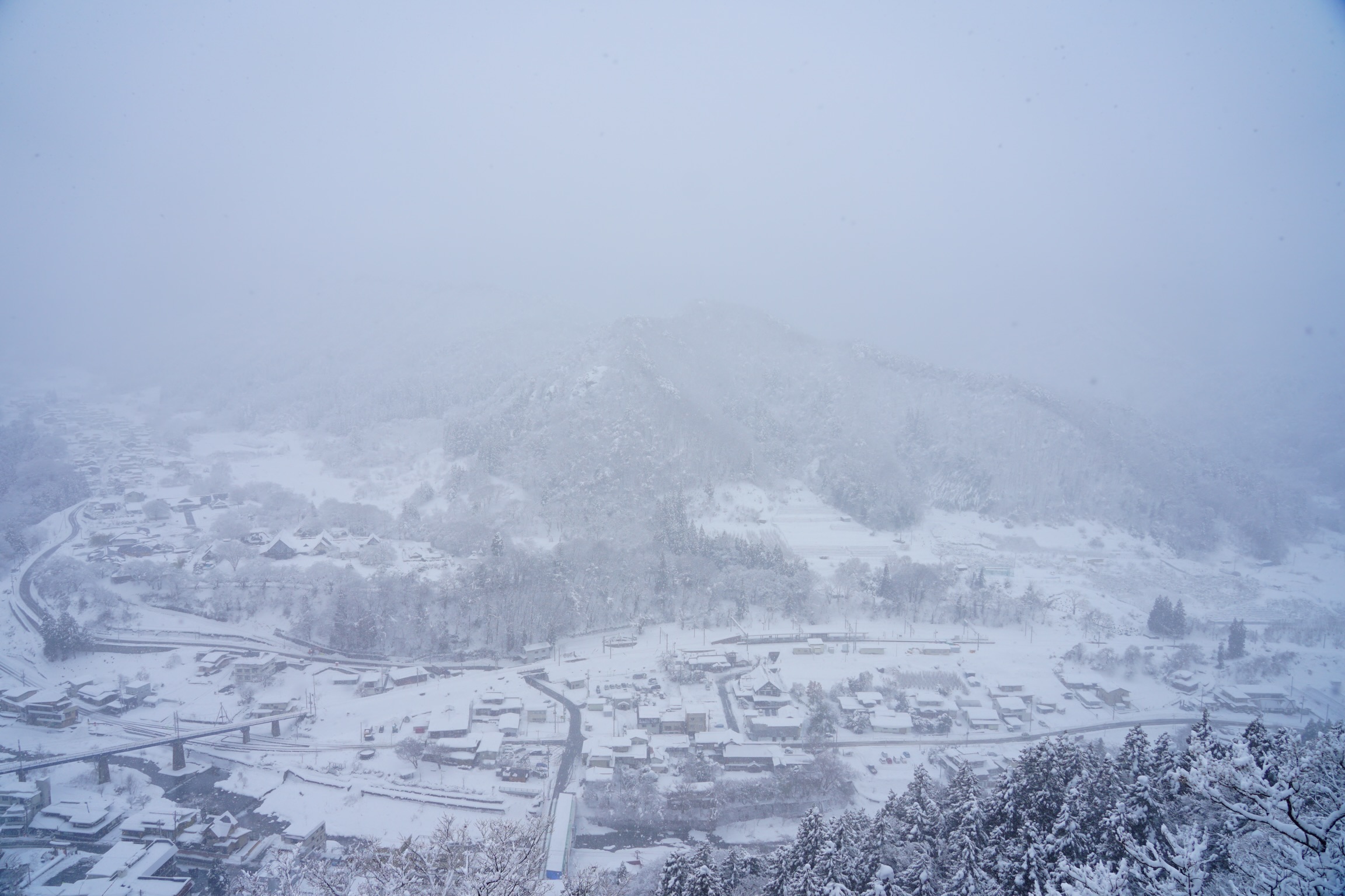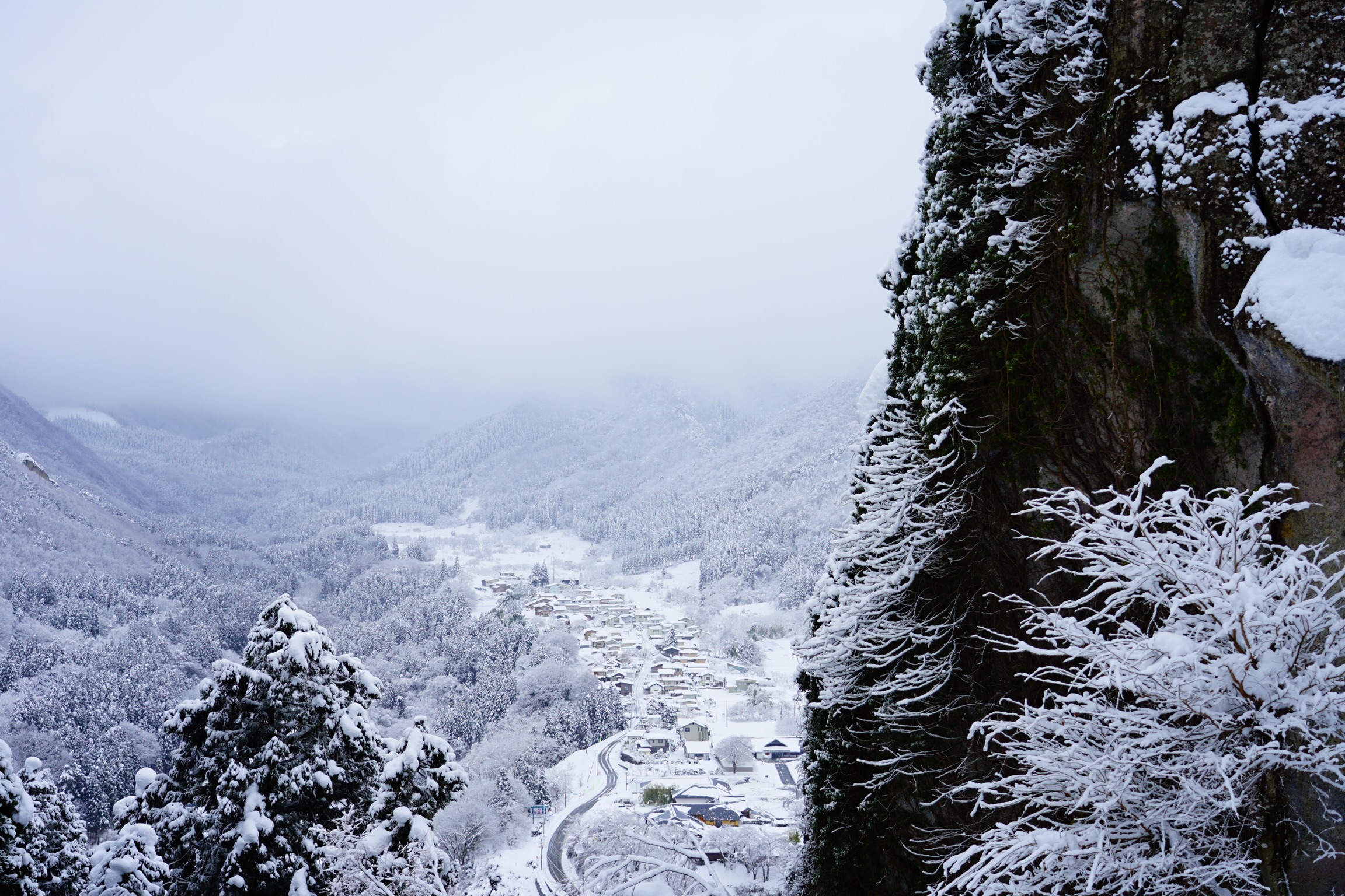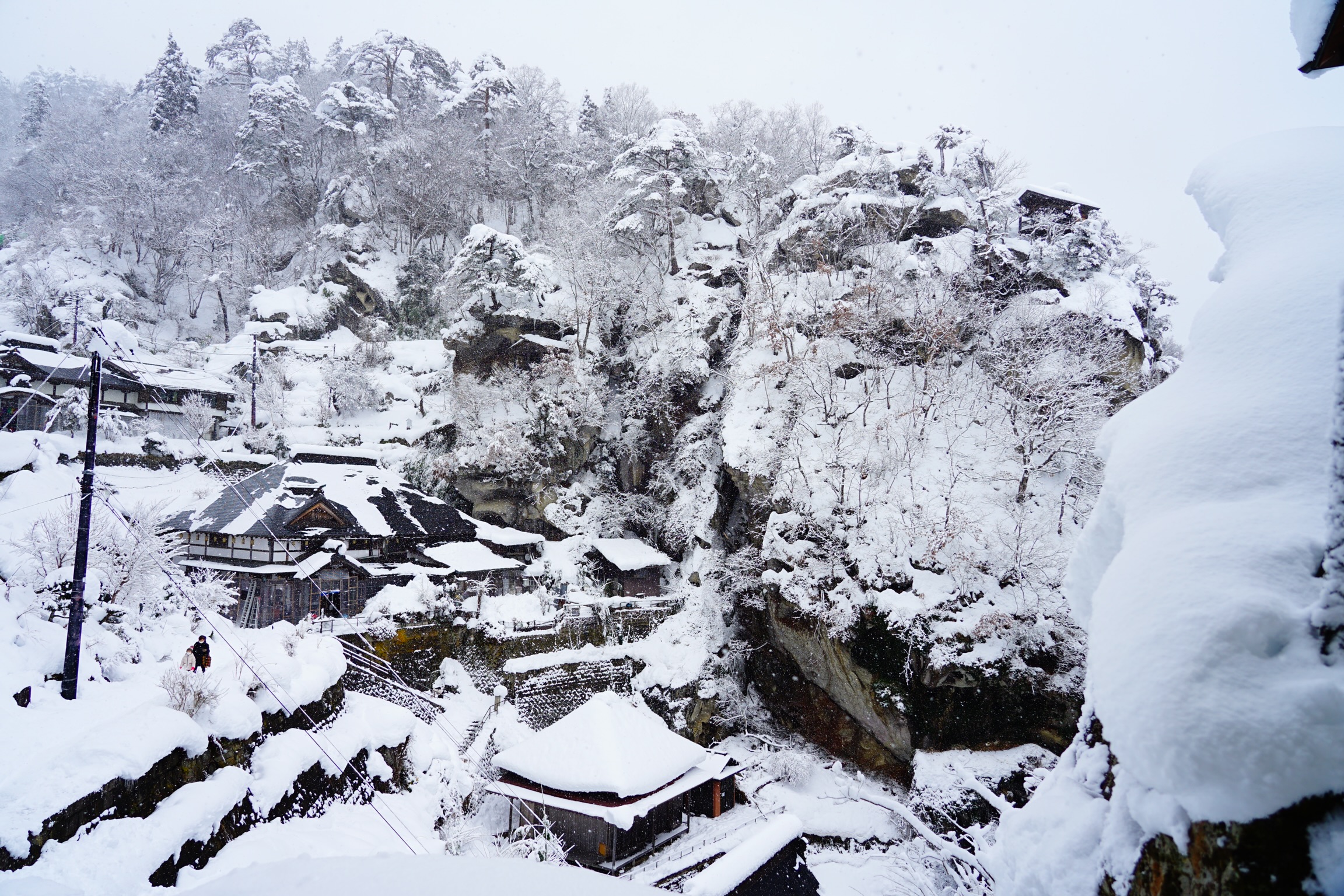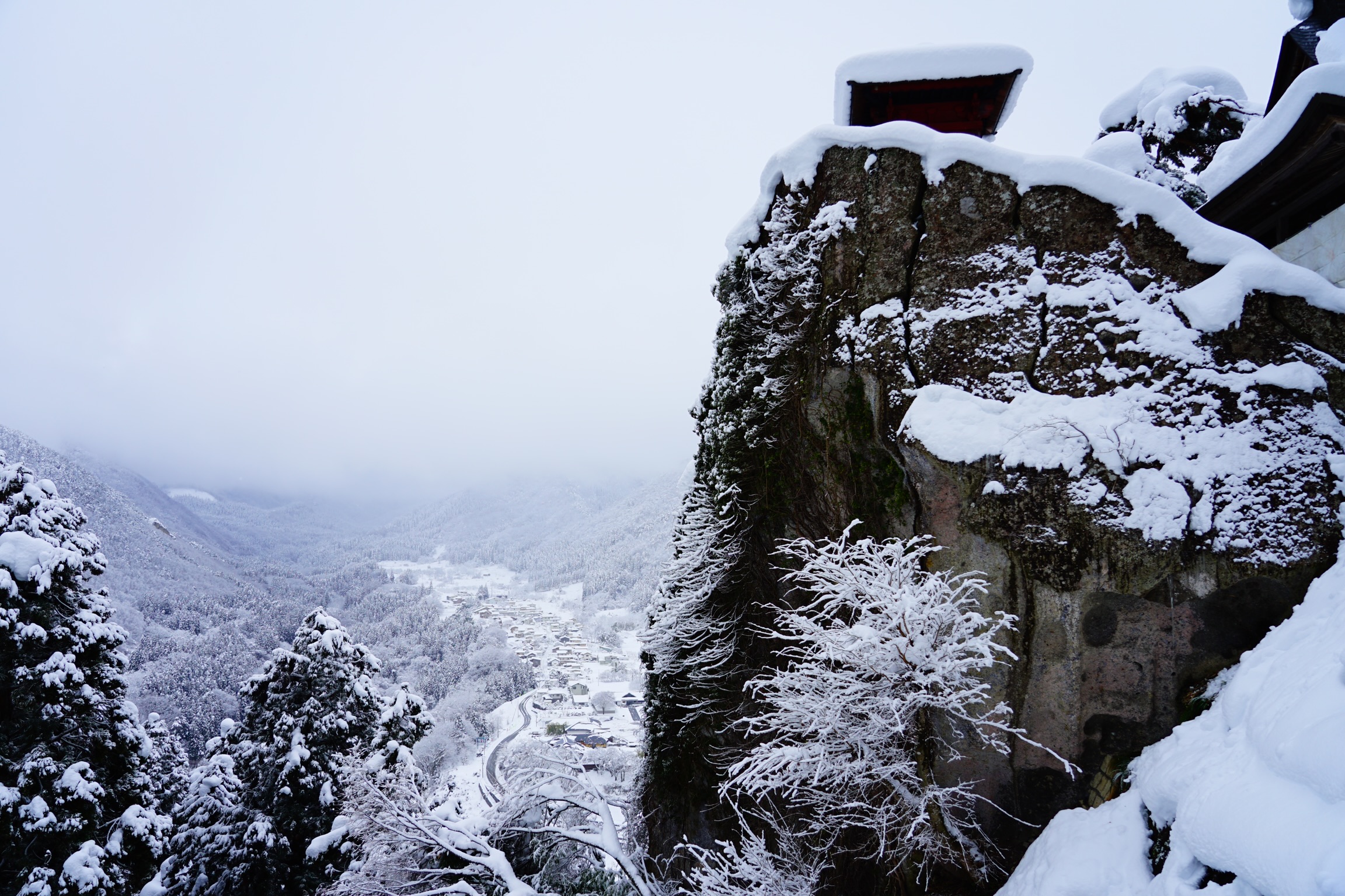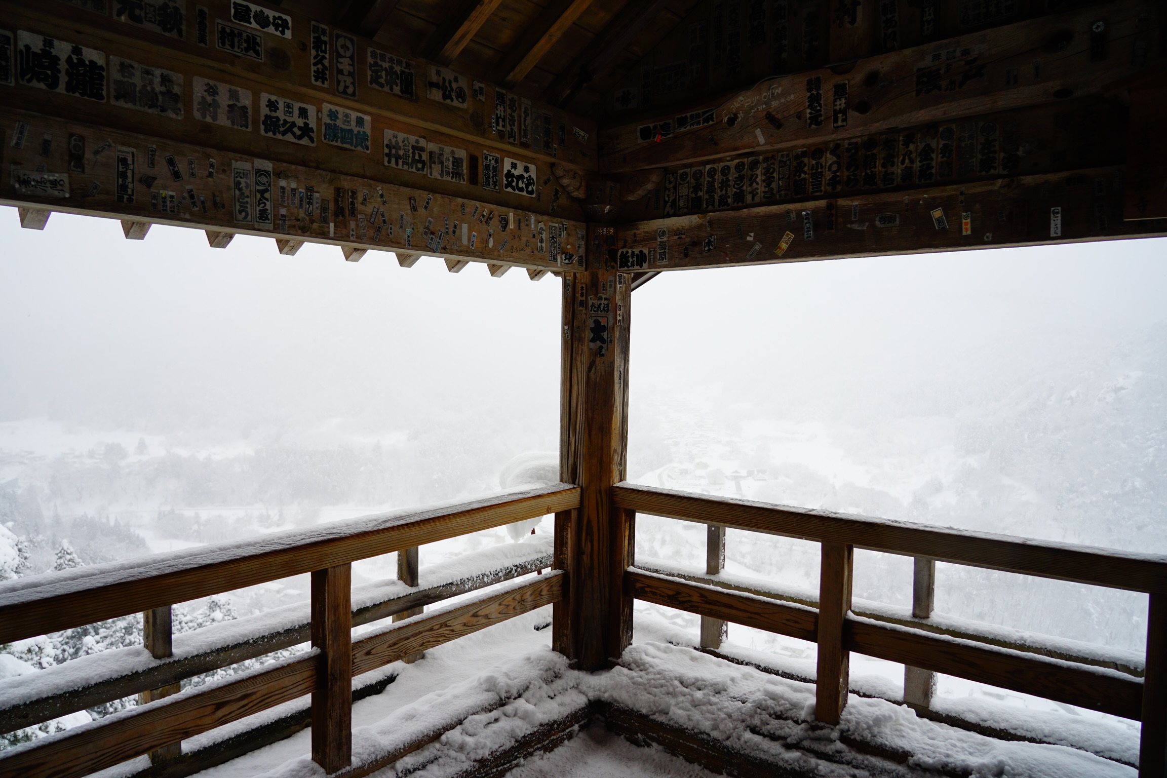 仁王門より上は景色が開けます。各お堂は厚く雪に覆われており、夏には色鮮やかに折り重なった山と谷の遠景が、全面白黒の光の無い世界のように見えます。