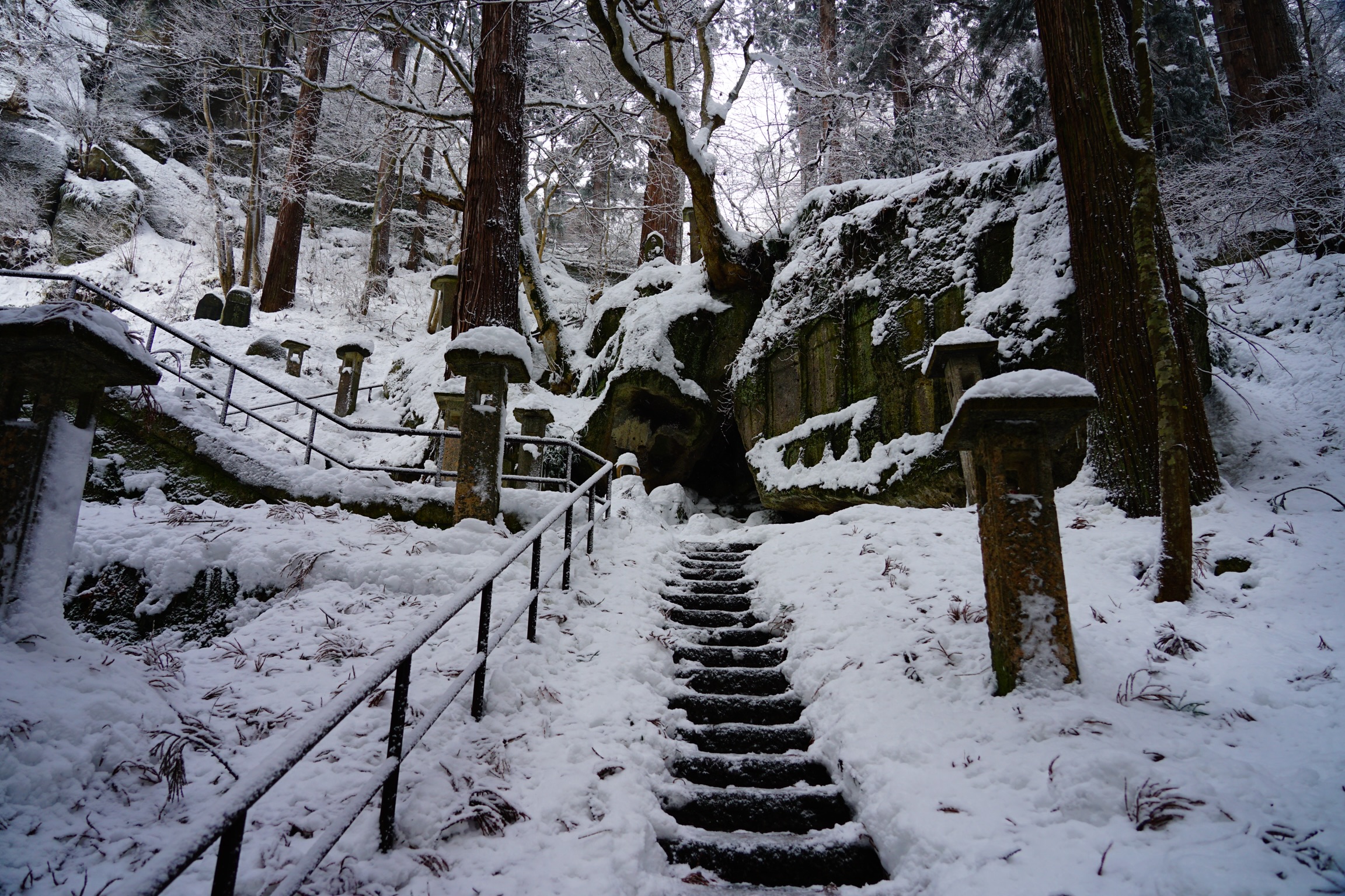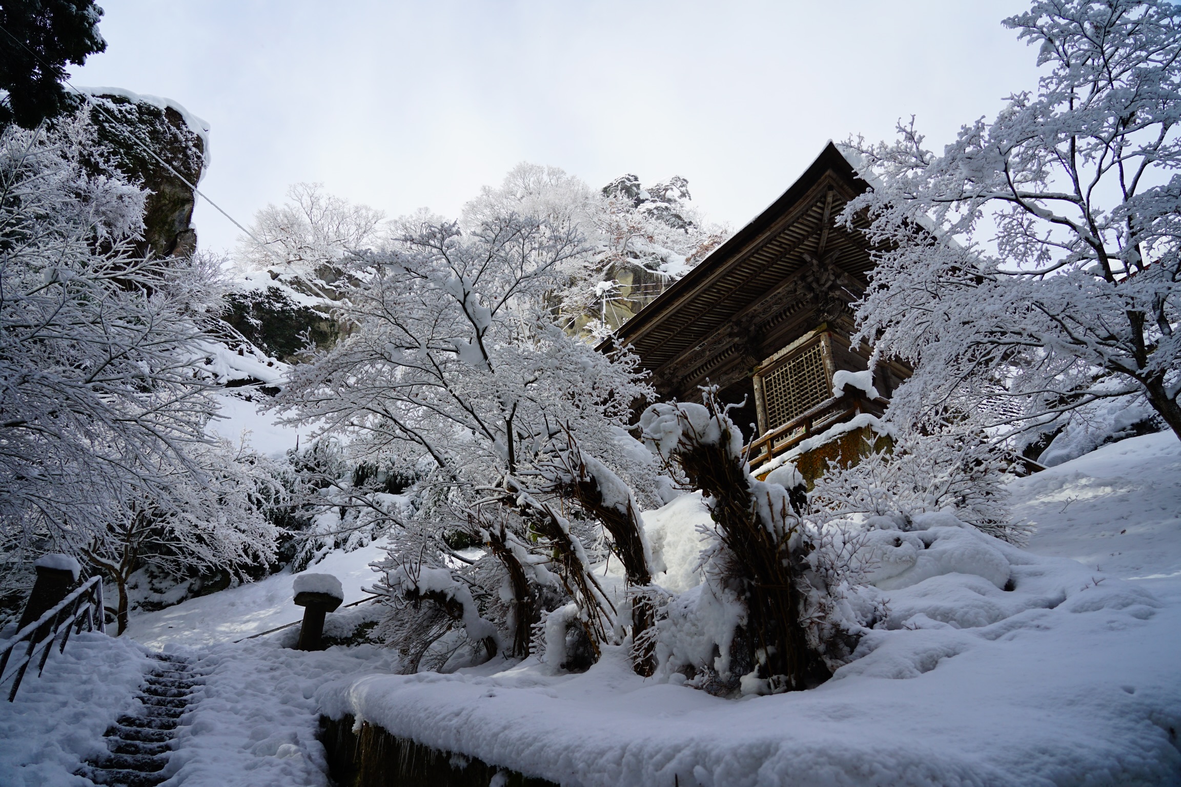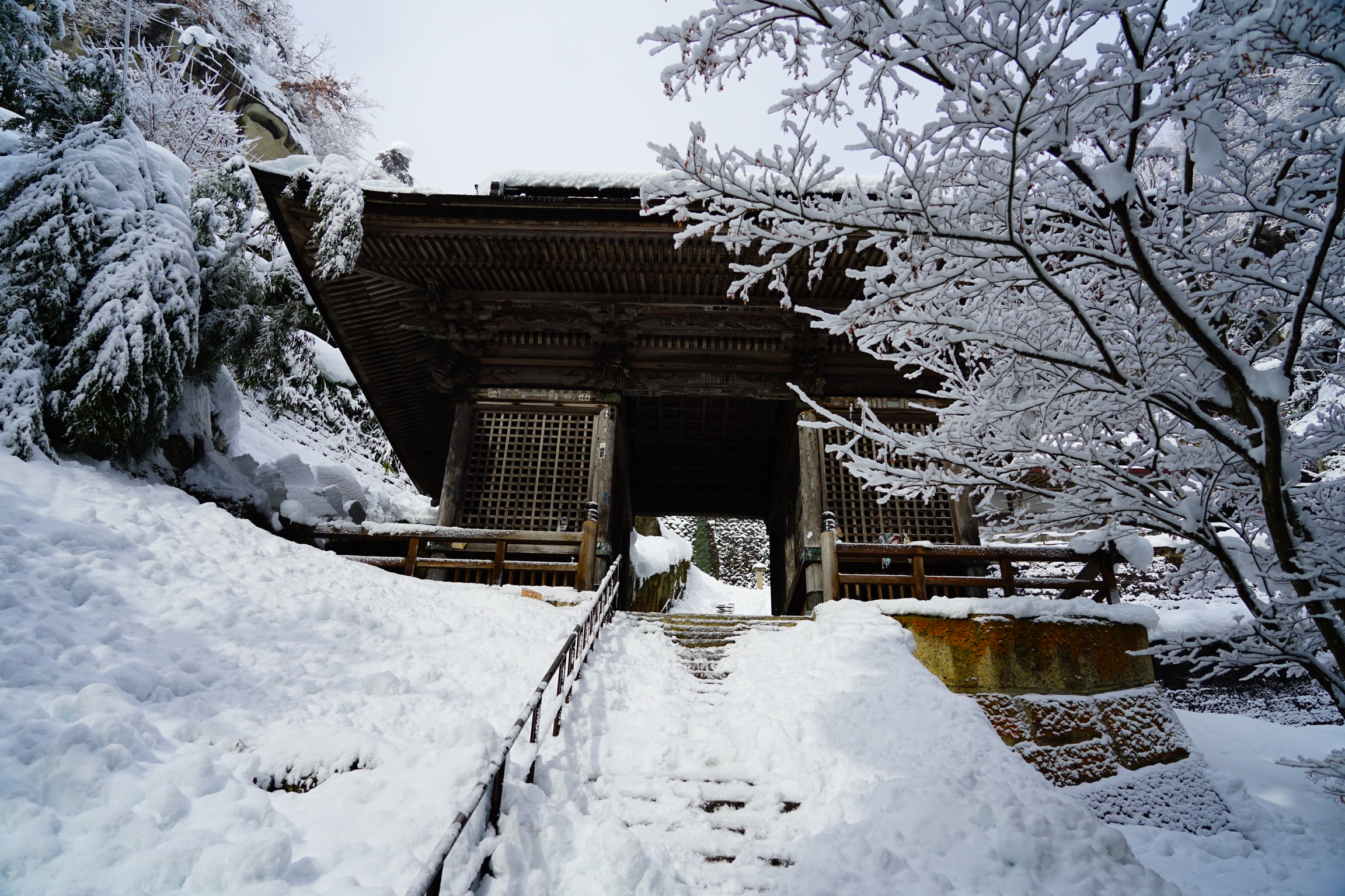 夏の鬱蒼とした濃い緑に包まれた山寺に訪れた際に、雪深いこの地に深々と降り積もった雪景色も見てみたいと思ったものでした。そう思いながら帰ったのを東北地方で雪が降るたびに思い出し、2020年12月19日、東北地方で大雪が降ったこの日に再び参拝する事ができました。