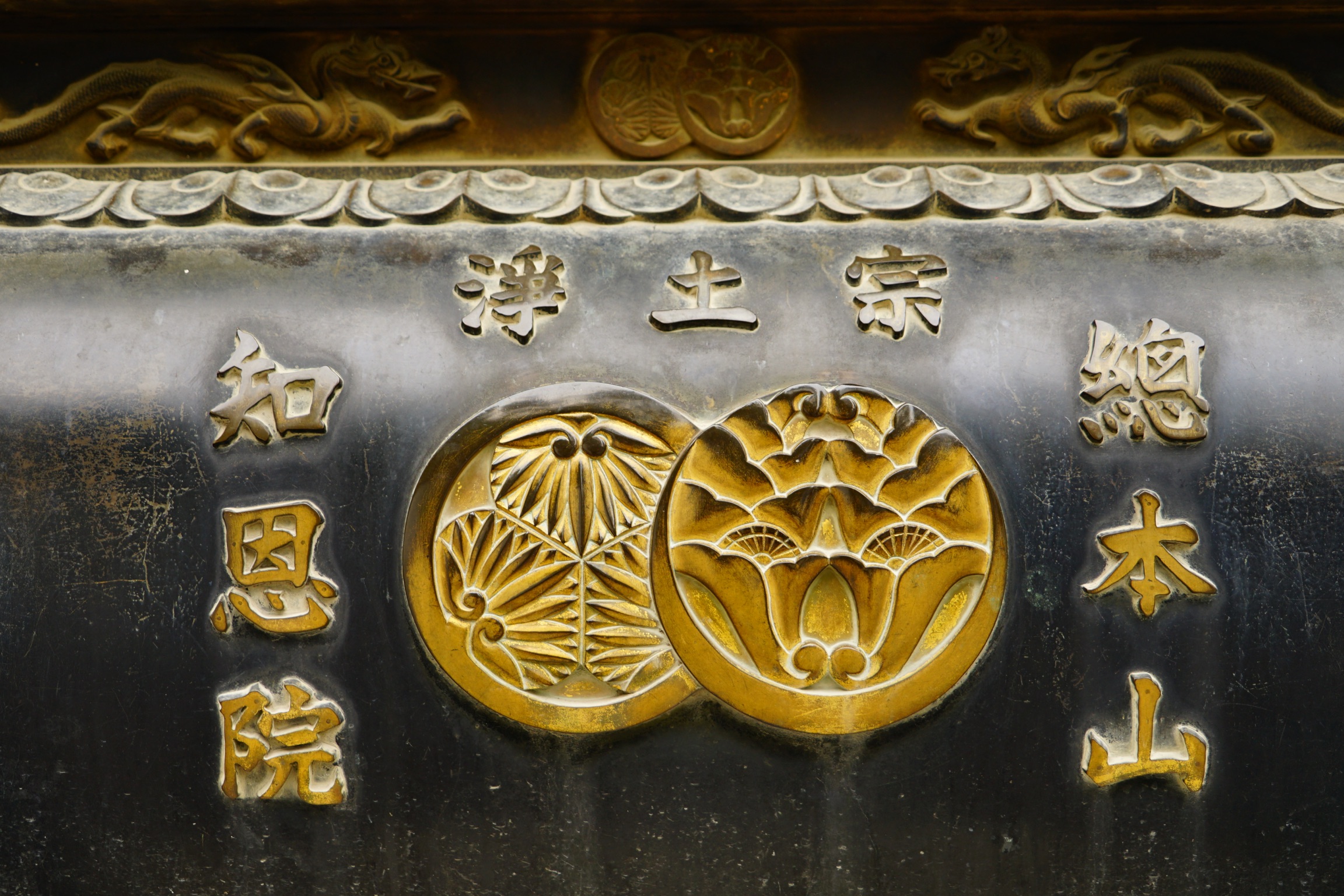 江戸時代初期1636年に信徒の寄進により出来上がった大鐘は重要文化財で、直径2.8m、高さ3.3m、銅の厚さ30cmで重量70トンの巨大さです。日本三大梵鐘のひとつとされています。毎年除夜の鐘として大勢の僧侶に撞かれるので有名ですが、この大鐘が撞かれるのは4月の法然上人の法要、12月27日の試し撞き、大晦日のみです。胴体にはただ一言(南無阿弥陀仏」と書かれていますが、これには方広寺の事件(国家安康の文字に家康が怒り、大坂の夏、冬の陣の引き金となった)を教訓に後の世に災いとならないように配慮されたものです。