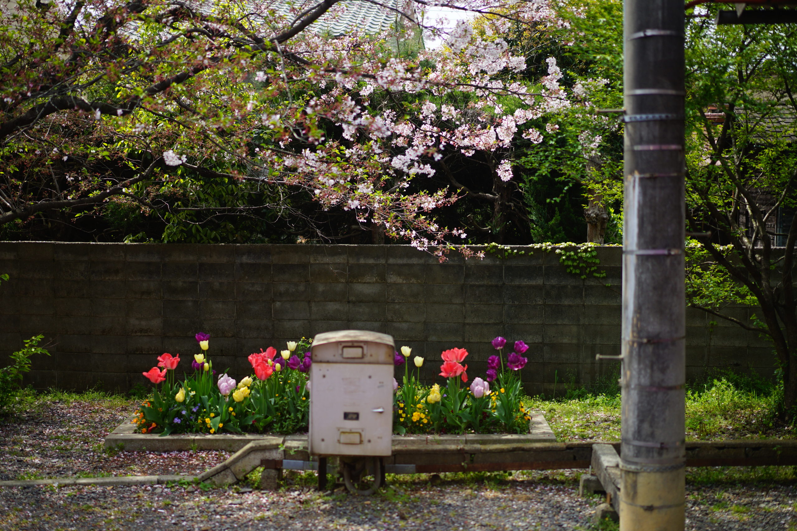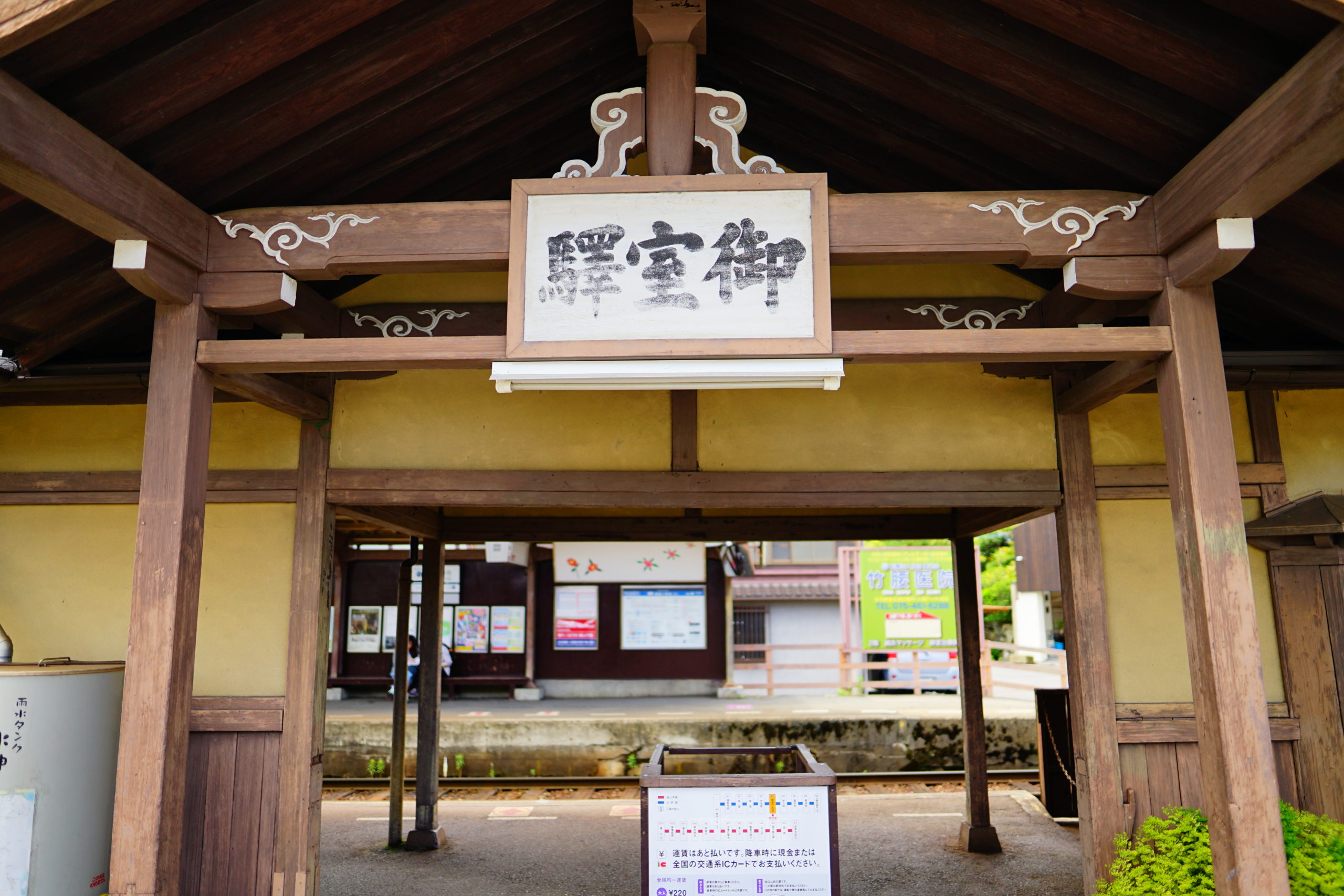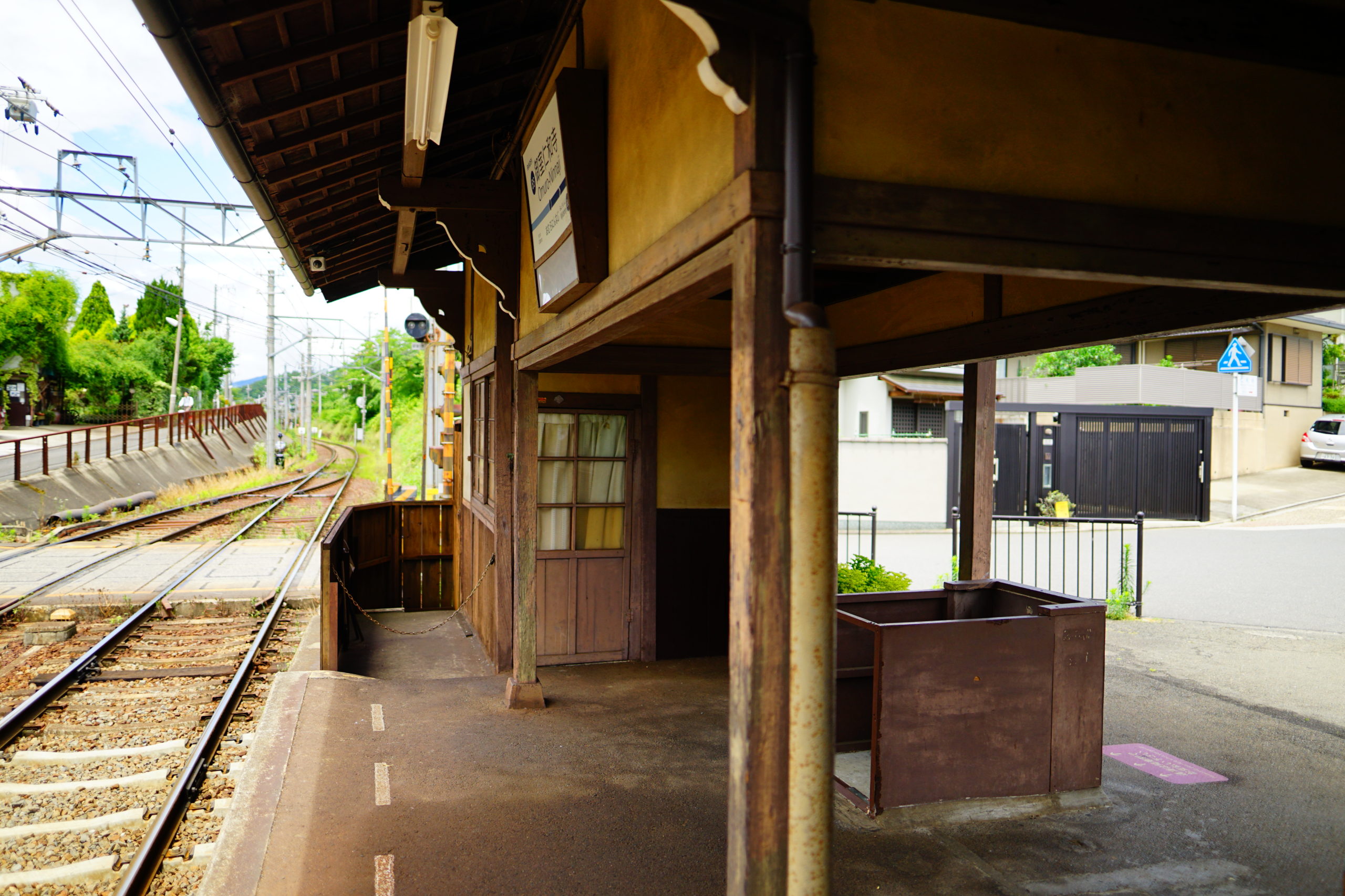 北野白梅町支線の御室仁和寺駅は嵐電随一の風情漂う駅です。ホームをよく見ると隅っこには季節の花が植えてあり、春先には桜も咲きます。駅舎は木造の質素で簡素な建物で、雨をしのぐ程度の役割といった感じです。かつての駅名(2007年以前)は「御室駅」であったようで、古めの看板がその名称のまま残っています。改札を出ると道の真っ直ぐ正面に仁和寺の三門がどっしりと構えており、仁和寺参拝のための駅のような、より印象的な演出がなされた感じがします。