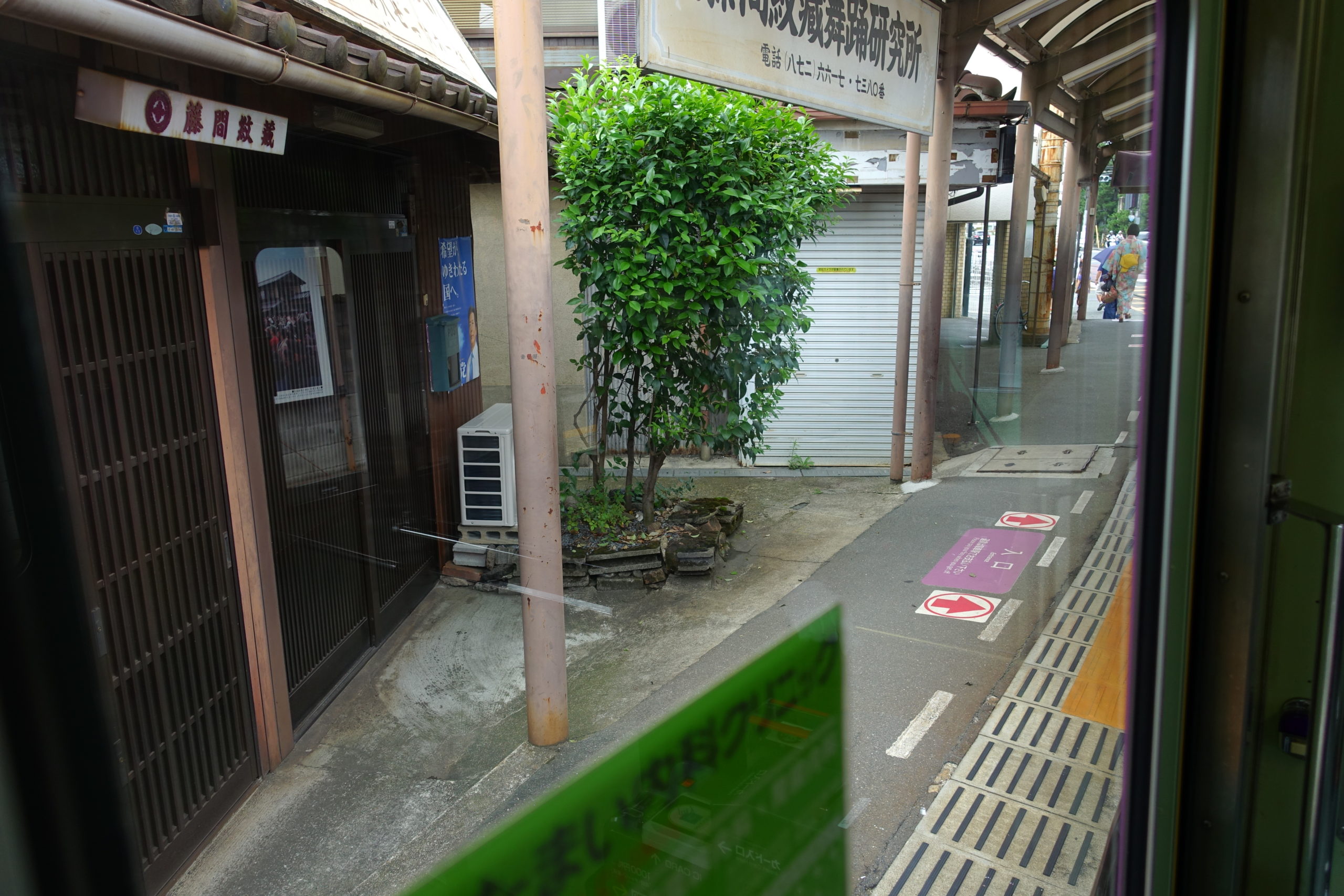 住宅などの建物の狭い隙間をぬって走る嵐電は、ところによっては駅から建物に直接入るような形態になっているところもあり、どうやって出入りするんだろうかと想像を膨らませてしまいます。