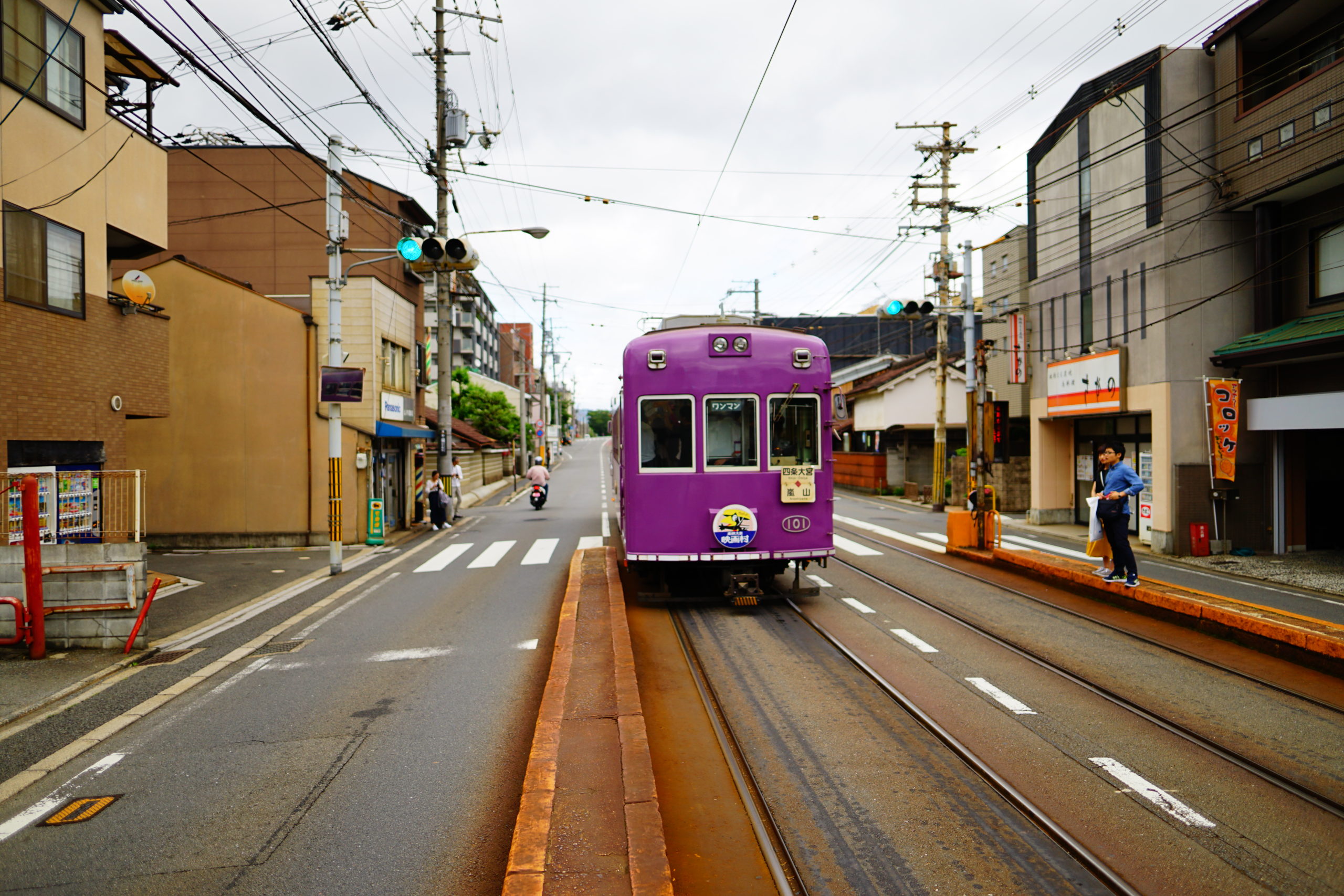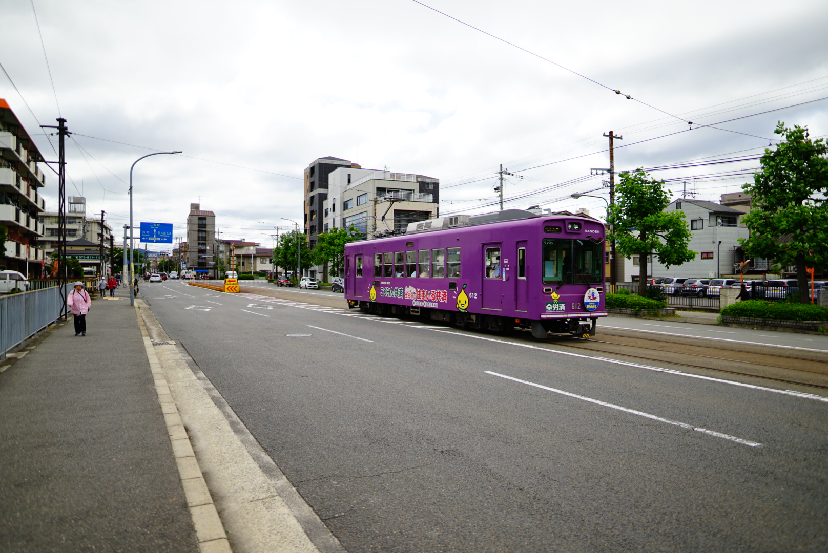 路面電車区間を走る嵐電、オリジナルの紫色車輌。車体の宣伝広告はいかがなものかと思う。