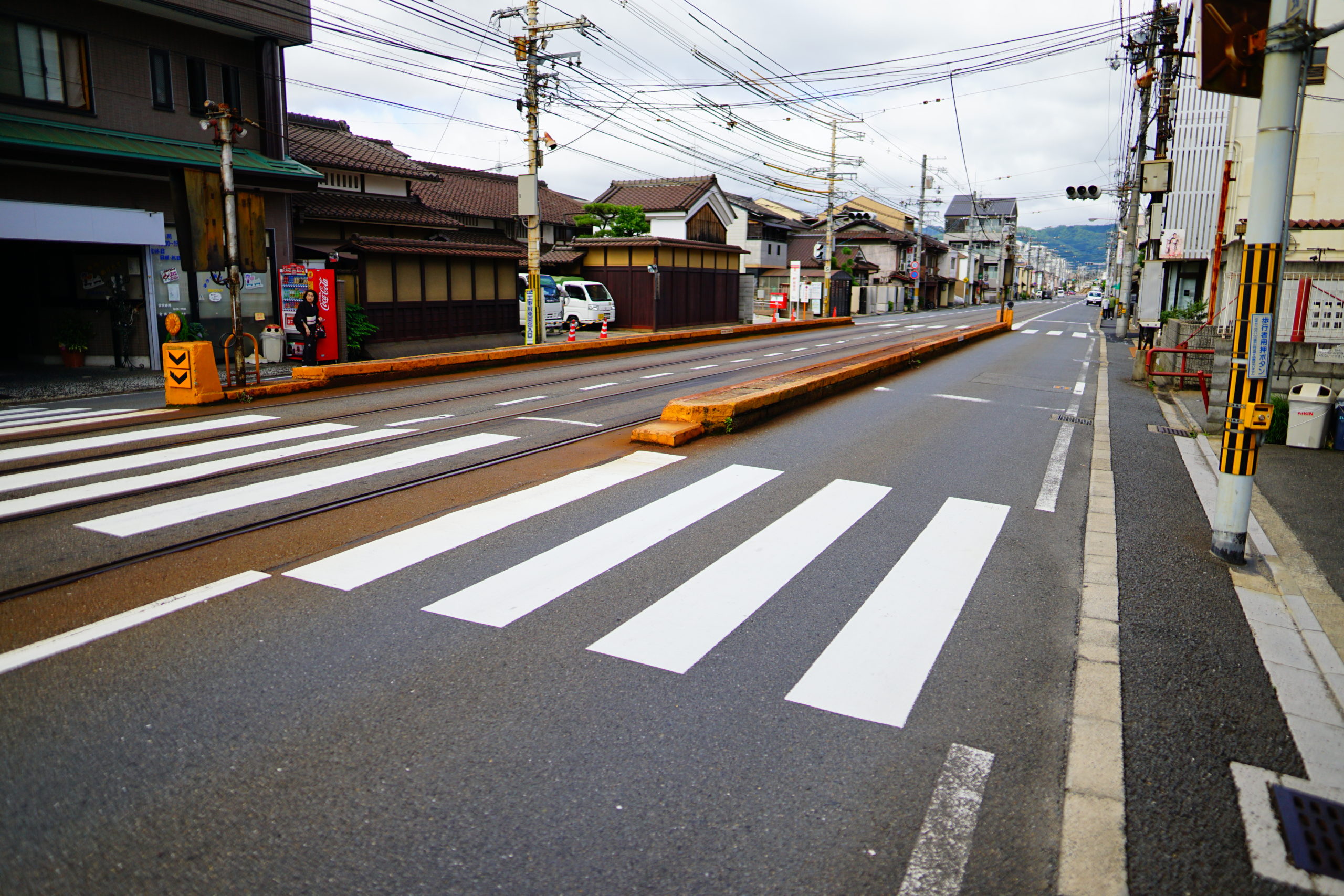鎌倉の江ノ電もそうですが、嵐電も部分的に道路を走行します。車の運転手も慣れていないと怖いかもしれませんが、地元の人は何事も無いようにいたってスムーズです。