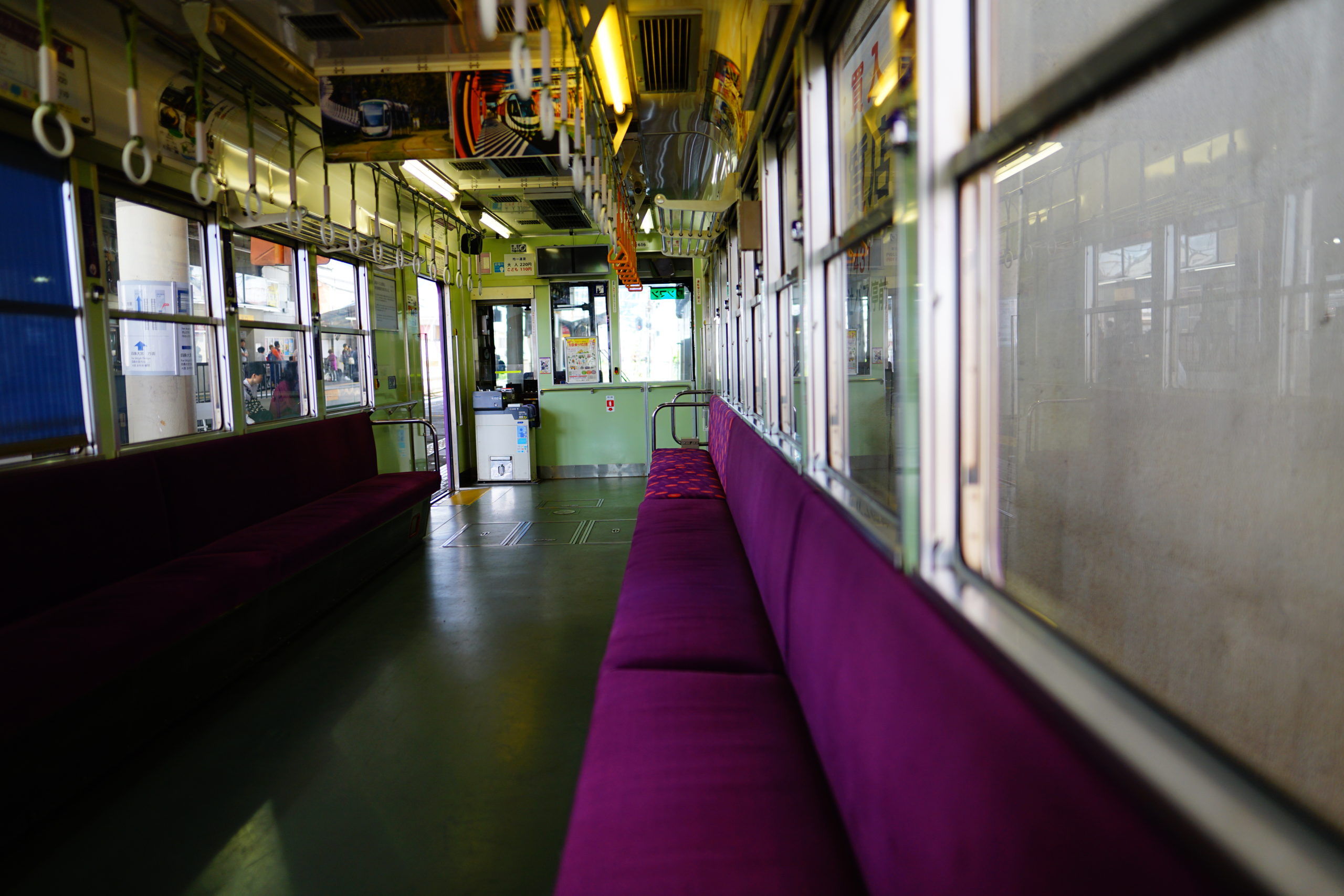 座席は長ーいベンチシートが、前後2枚のドア間を埋めています。市街地側ターミナルである四条大宮駅は烏丸や河原町ほどの繁華街でないのが幸いして、こののどかな運行が可能なのだと思います。嵐電が河原町まで来ていたら、またいろいろと違っていたのだろうと思います。