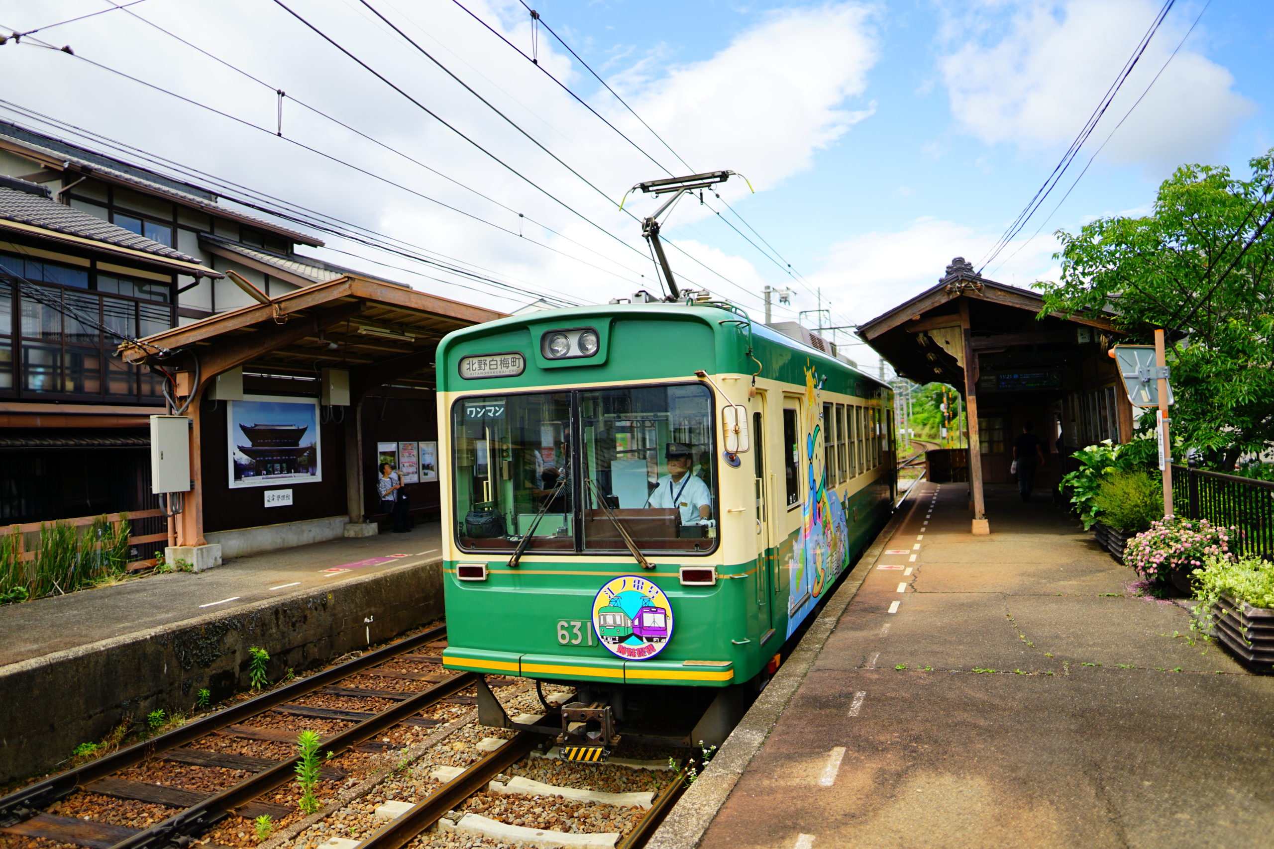 観光地嵐山と市街地四条大宮を結び、途中中間地点の帷子ノ辻(かたびらのつじ)から北野白梅町への支線があります。嵐山本線は上りと下り(西行き、東行き?)にそれぞれ線路がある複線で、北野白梅町支線は単線です。車両は嵐山本線は1輌もしくは2輌、支線は1輌編成で走っています。(時期によって異なります。)