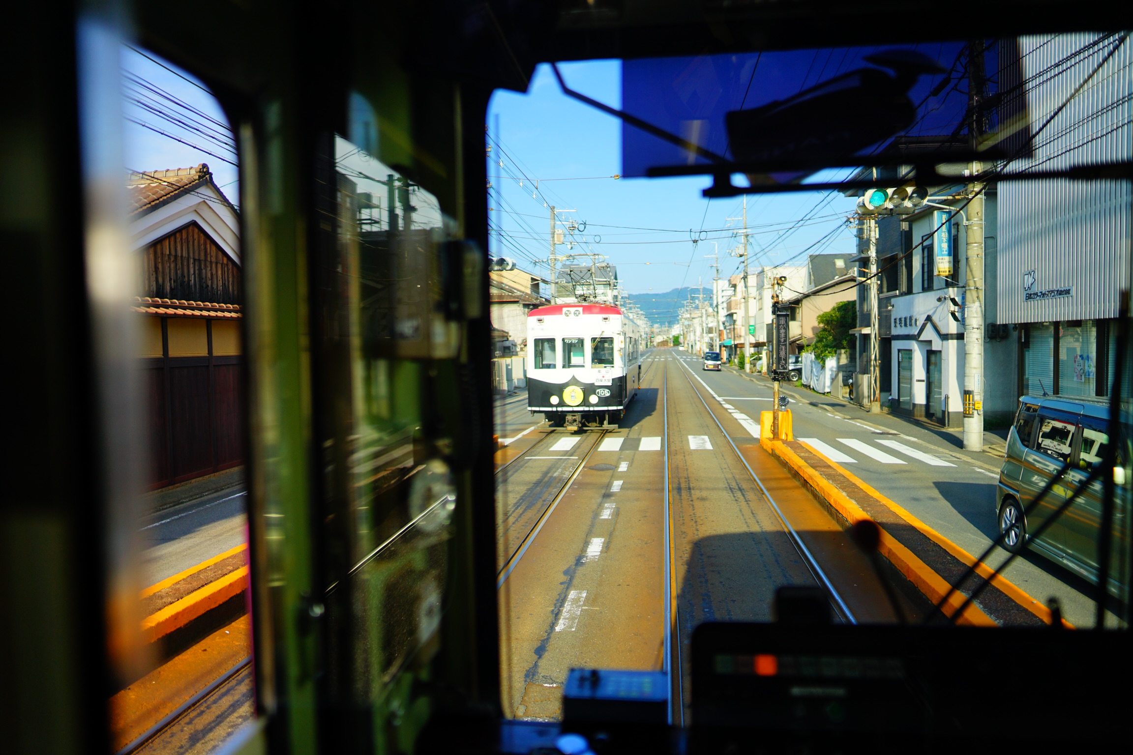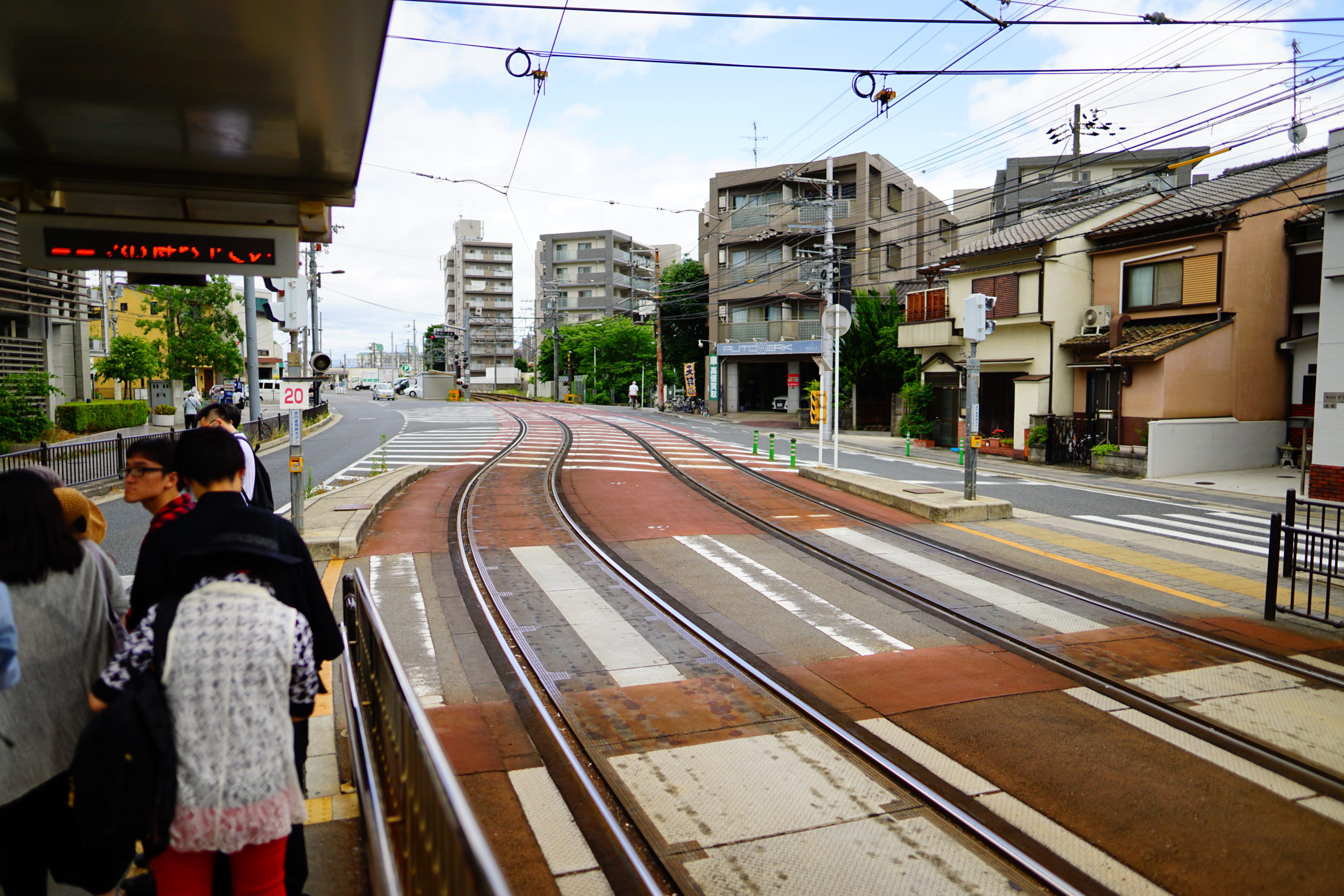 路面電車ではよくある事なのかわかりませんが、山ノ内駅のそのホームの狭さはちょっとスリリングな狭さです。この写真を撮るために降りましたが、降りたあとにどう動けばいいのか一瞬戸惑いました。ホームのすぐ際には車が通っています。今降りた電車も動き出して、からだすれすれに去っていきます。下手にカメラのファインダーを覗いてボーッと立っていたらぶつかりそうです。