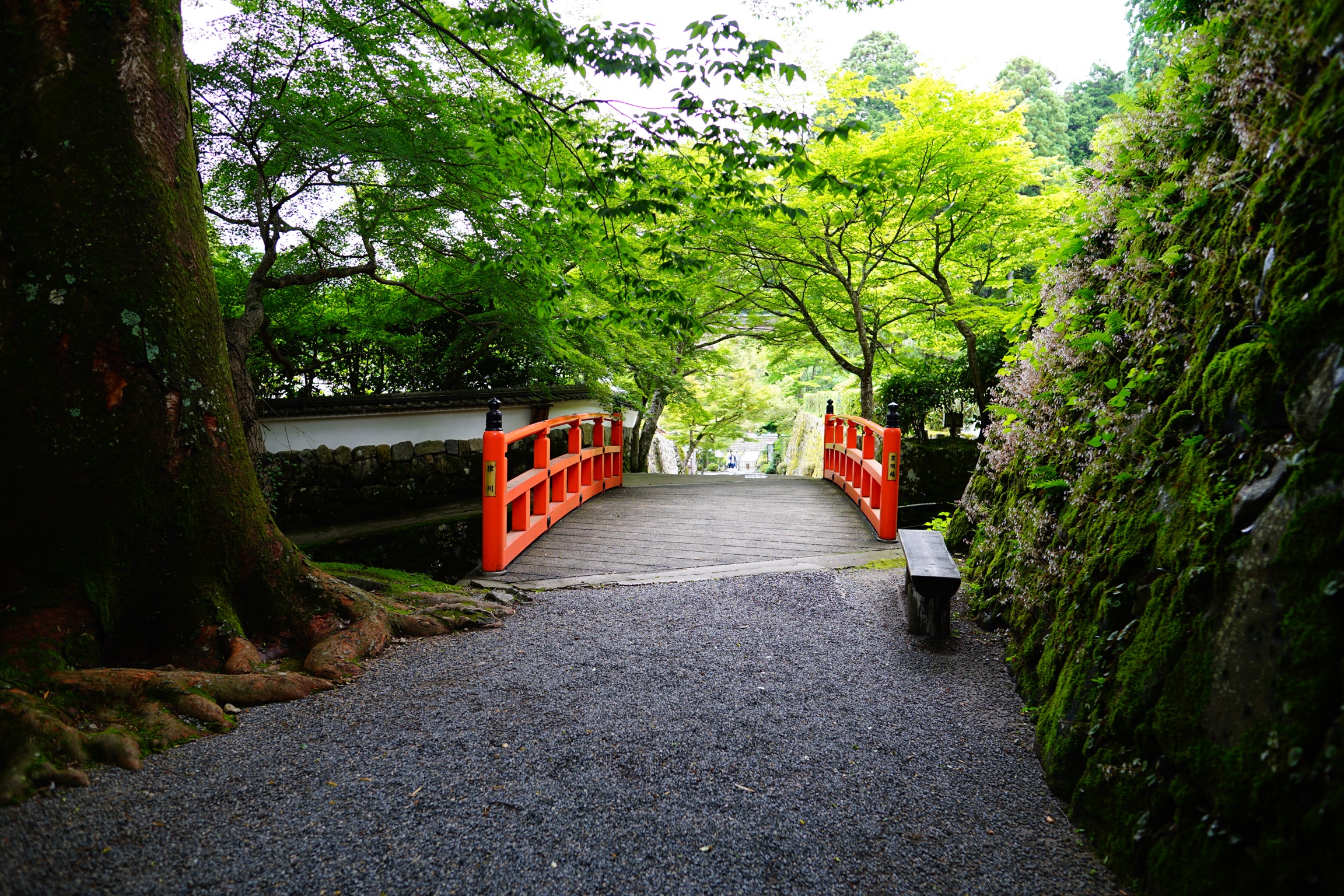 三千院の御殿門を出て右に向かい、律川(りつがわ)の朱色の欄干を渡って突き当りの先に見えてきた寺院が勝林院です。
