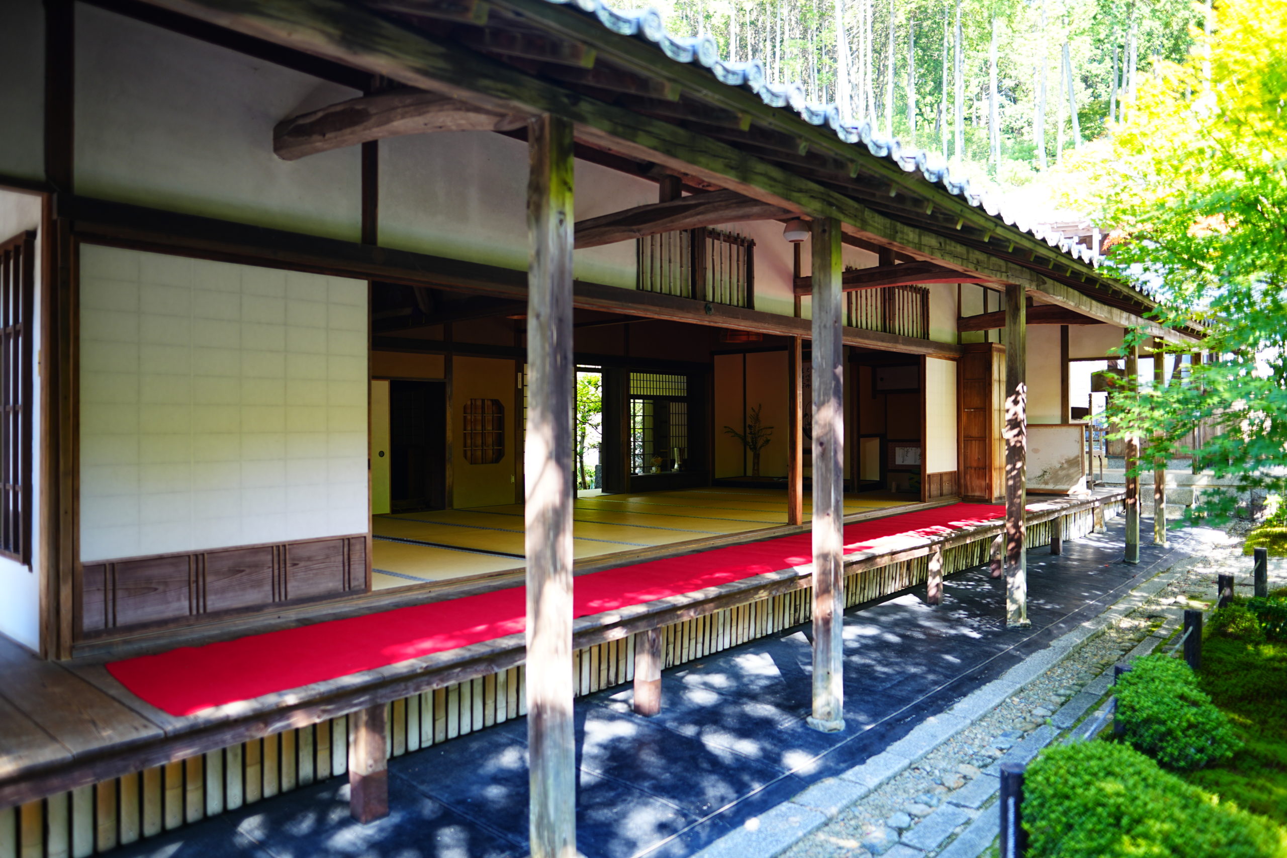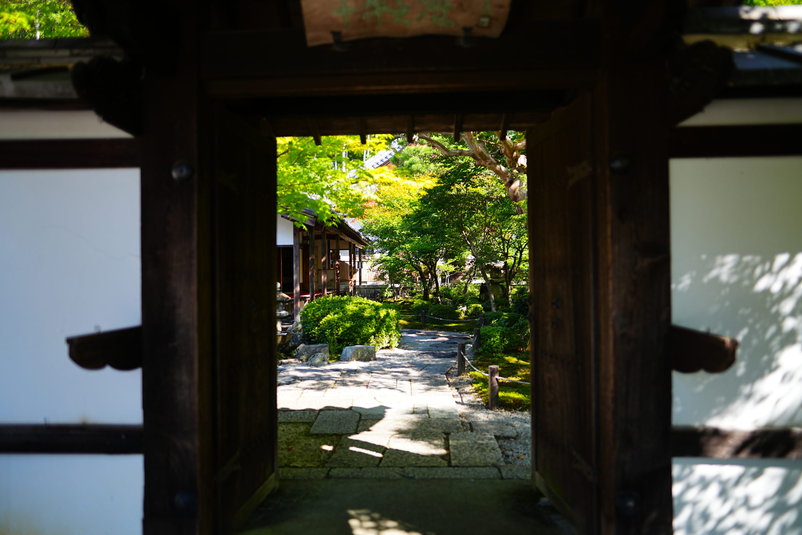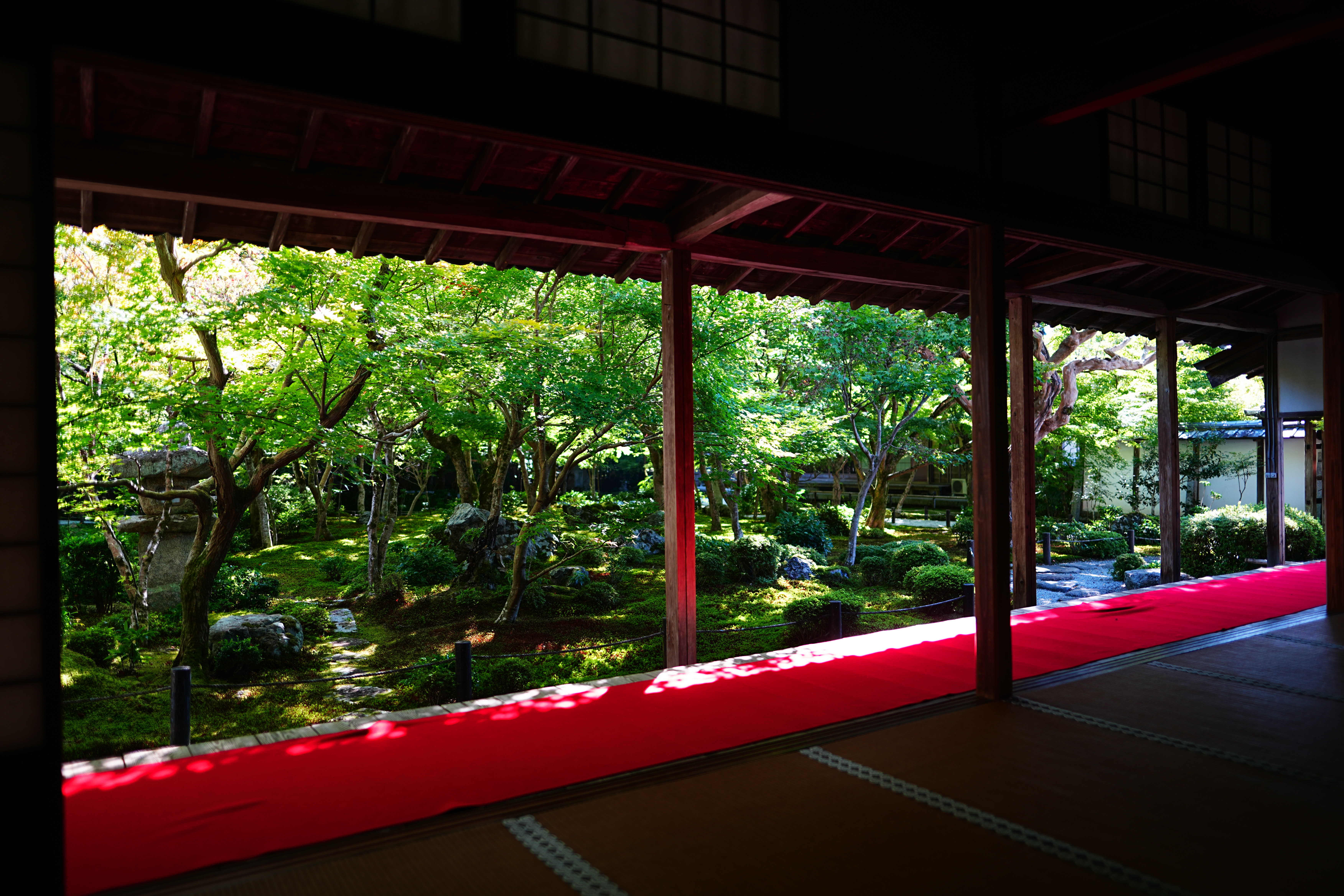 この時は青もみじの時期ですが、強い日差しであちこちが反射して、薄暗い室内との明暗さを調整して撮影するのが難しいです。紅葉の時はまた違った素晴らしい景色であろうと想像できます。例年紅葉の時期は完全予約制での拝観となっており、定員が埋まって申し込めずと言うこともありますが、逆に混雑の中での拝観とならず良いシステムだと思います。