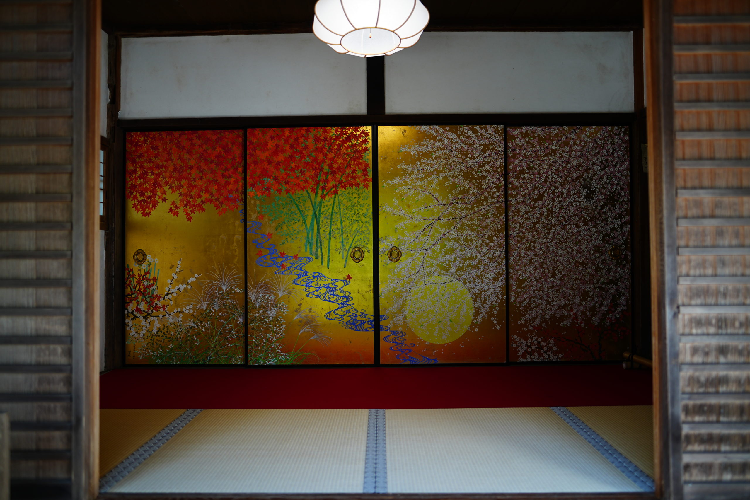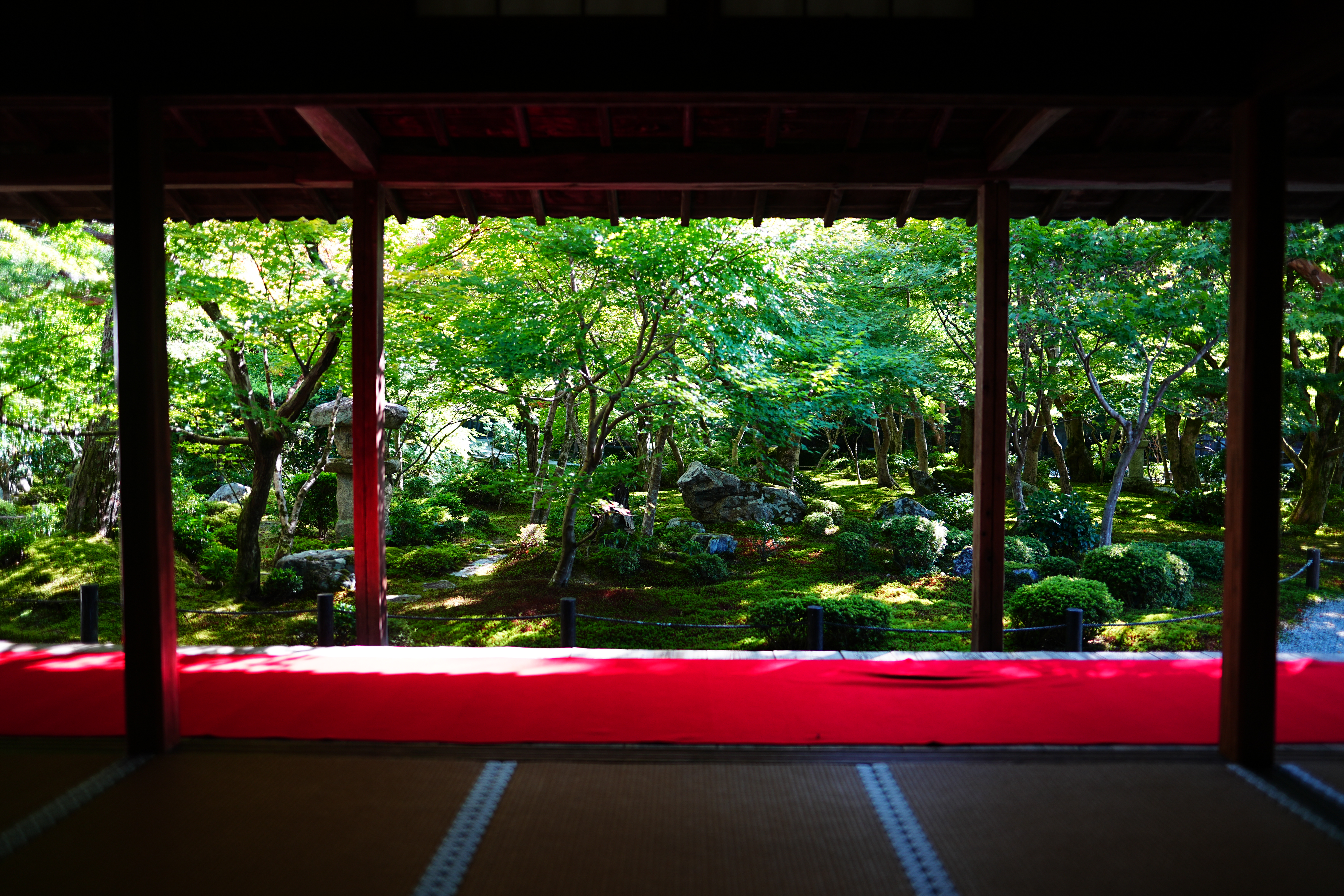 圓光寺と言えば、なんと言ってもこの室内からの眺めが、額縁庭園として非常に有名です。赤い毛氈がアクセントとなって和の美として最高の絵柄だと言えます。この庭園に魅せられた富岡鉄斎はこの寺に襖絵を描き寄進しています。この襖絵は本堂に上がる際に拝見出来ます。