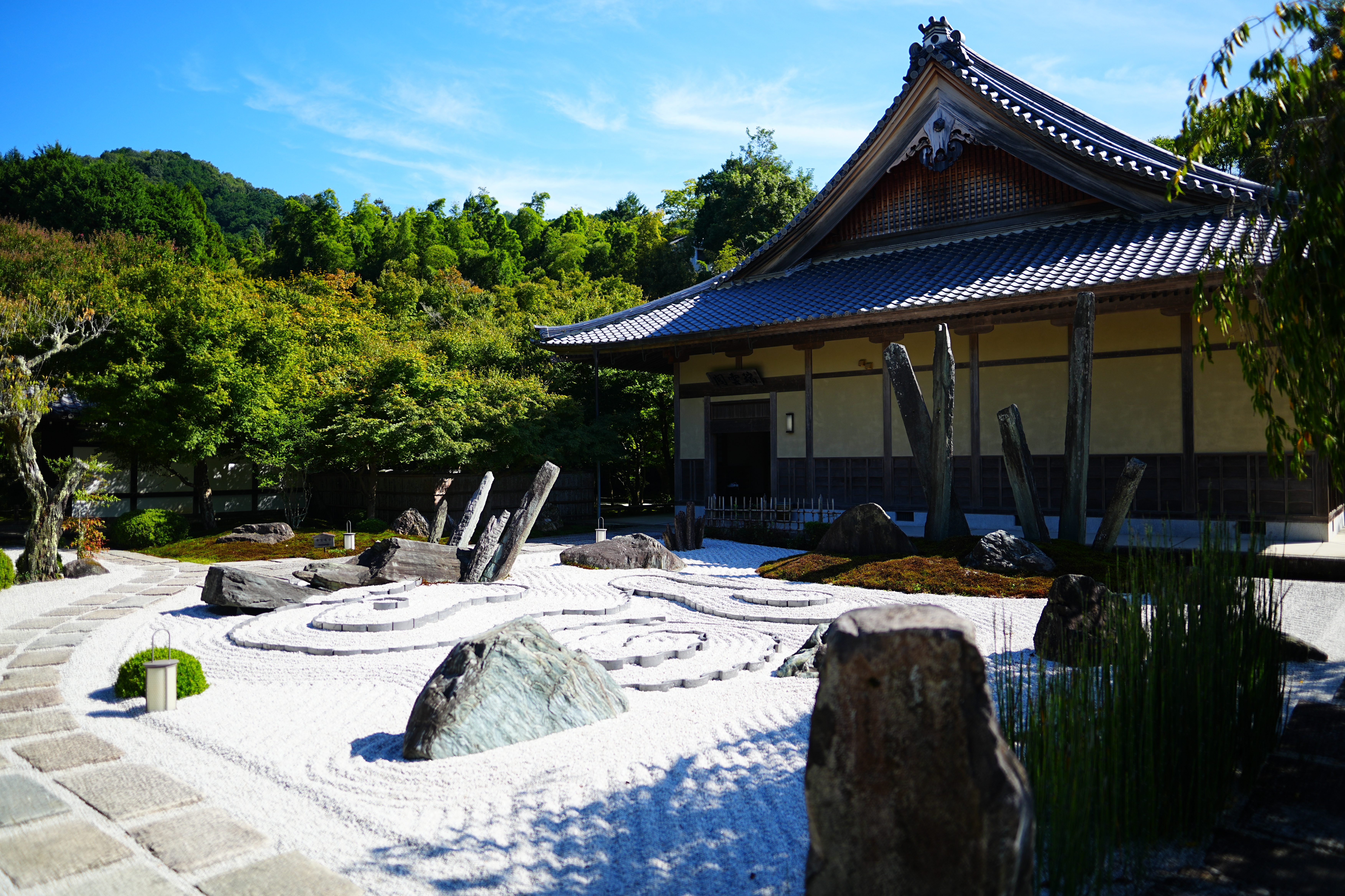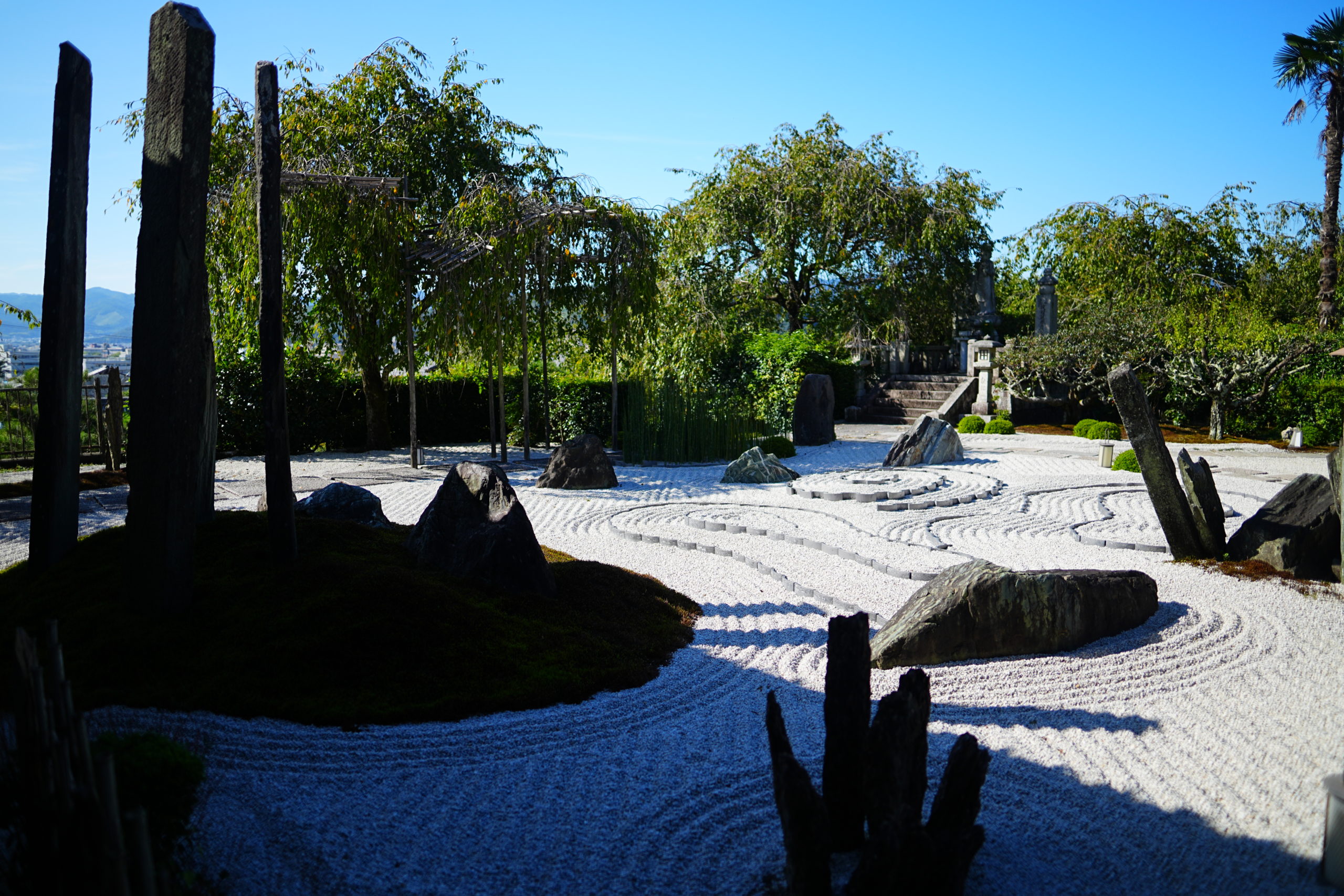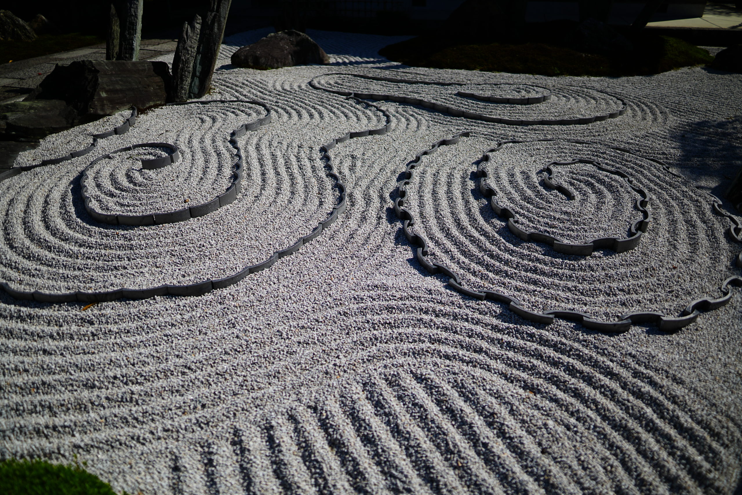 参道の石段を登り切ると現れる平成の作となる枯山水の「奔龍庭」(ほんりゅうてい)は、雲海に見立てた渦を巻くような白砂と、大胆かつアバンギャルドな石の配置で龍を表しています。この細長くそそり立つ石はかつて、この寺の古い井戸に使われていた物を再利用しています。ものを捨てずに大切にして再利用すると言う事も、禅の精神であると言えます。
