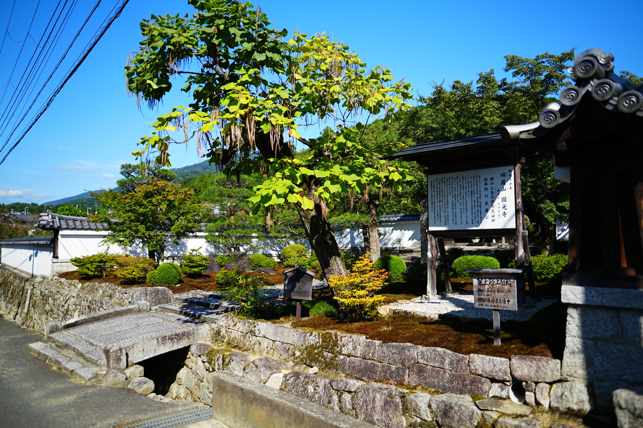 この辺りまで来ると、洛中とは違って碁盤の目の整然とした町割りにはなっておらず、どこの町にもあるようなごく一般的な地方の佇まいです。車がやっと通れるくらいの細い道が住宅地に沿ってクネクネとしており、決して行きやすい道程では無いです。ただ、曲がり角の要所要所にはお寺への案内板が設置されており、大方の方角だけ押さえておけば辿り着けます。