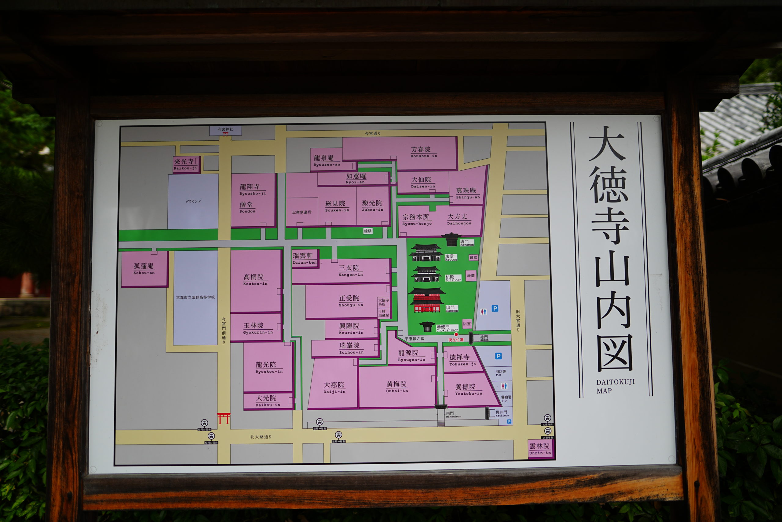 上の写真は大徳寺境内図ですが、境内の右寄りの緑色にお堂の絵がある部分が本坊です。敷地全体から比べるとずいぶんと狭いのがわかります。というよりも、本坊に比べてピンク色の塔頭寺院が広すぎると感じます。