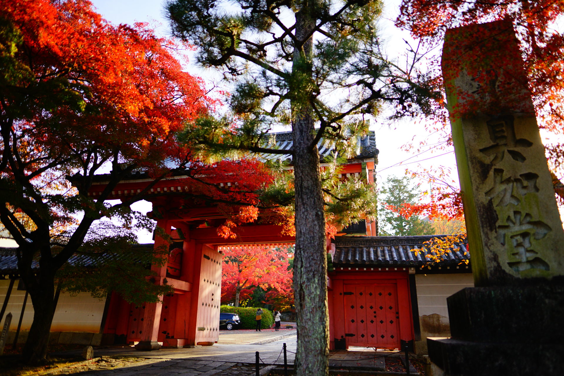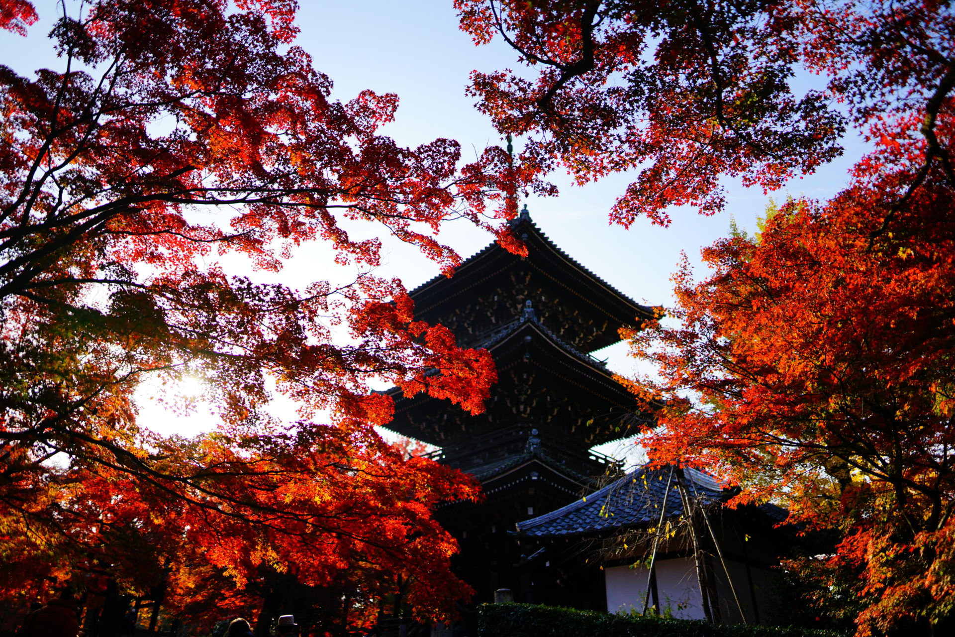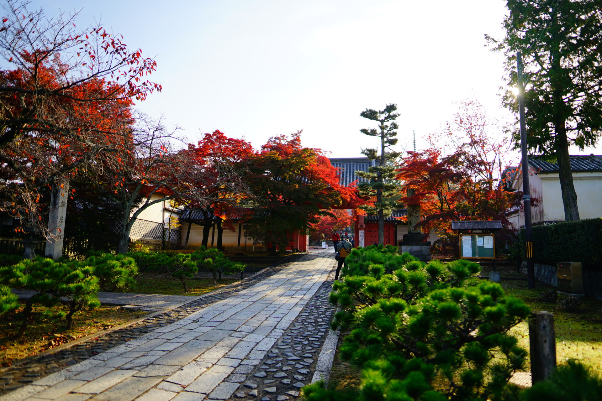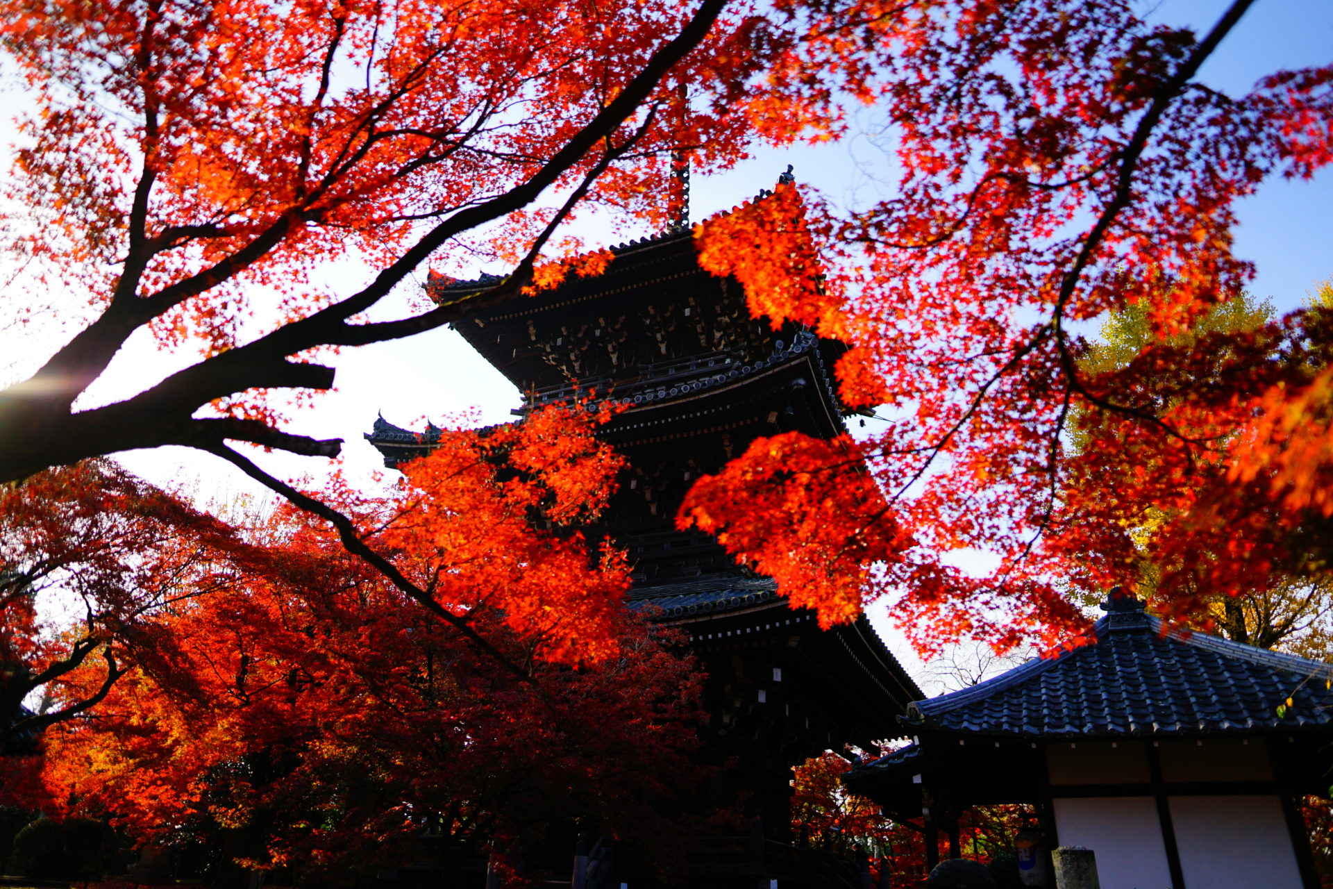 紅葉の撮影は逆光に限ります。光が紅葉の葉を透けてオレンジ色や赤の光源があるかのようです。ちょうど紅葉の時期の朝8時頃には参道から紅葉を撮ると、良い具合に逆光で撮ることができます。三重塔をバックに逆光で光る紅葉が狙い目です。ちなみに順光で紅葉を撮ると葉で光が反射してきれいな赤が撮りづらいです。