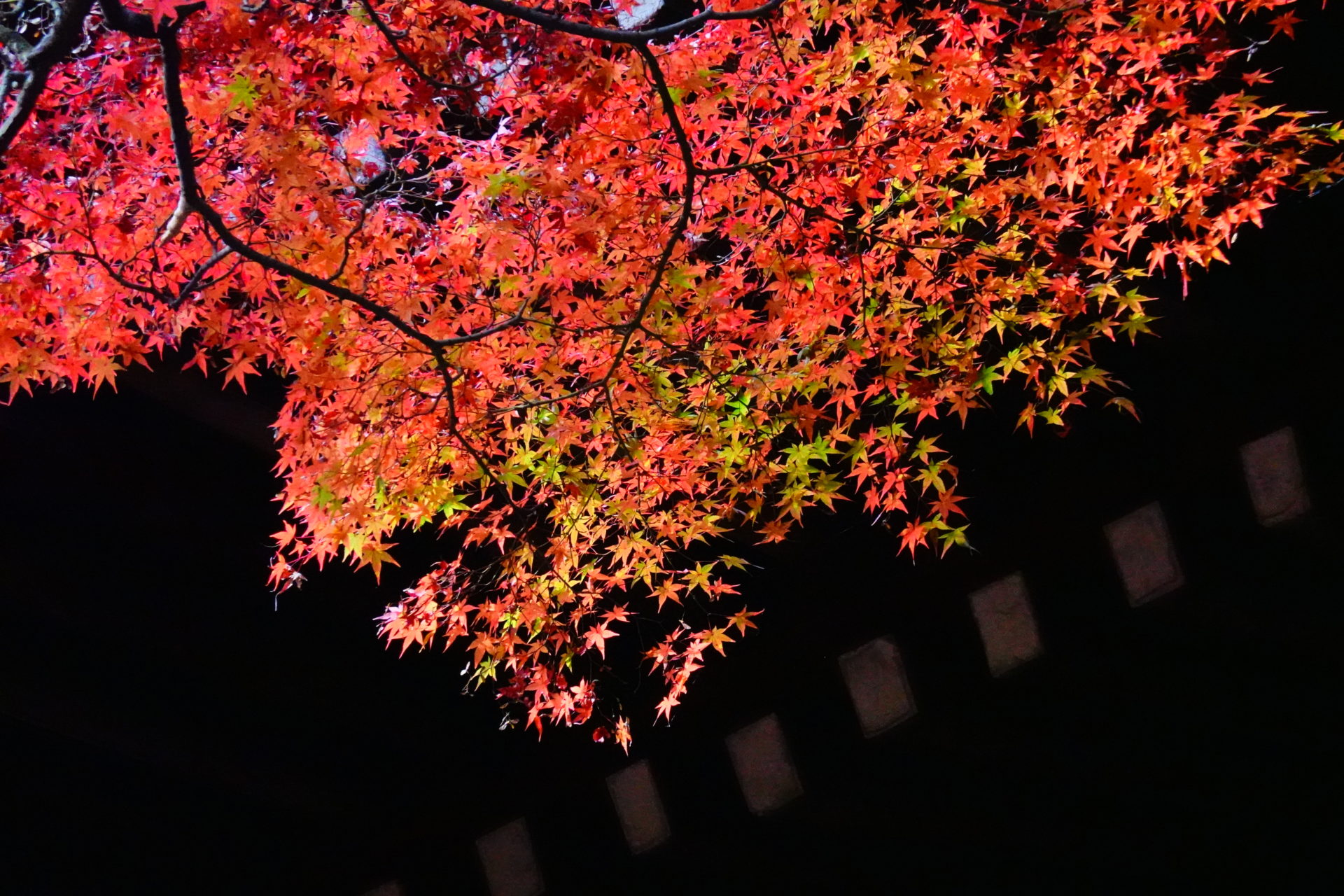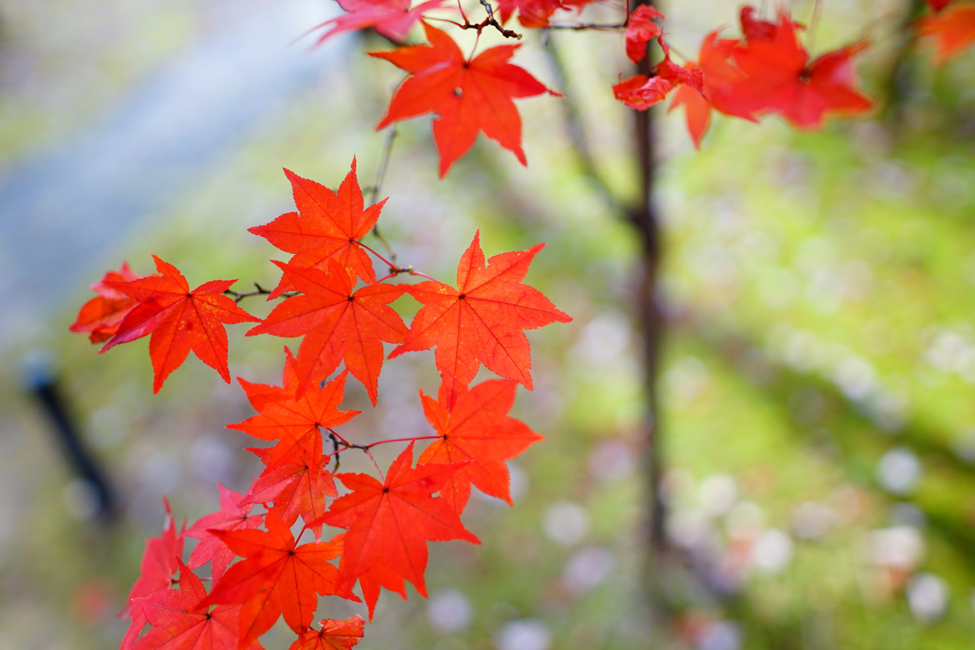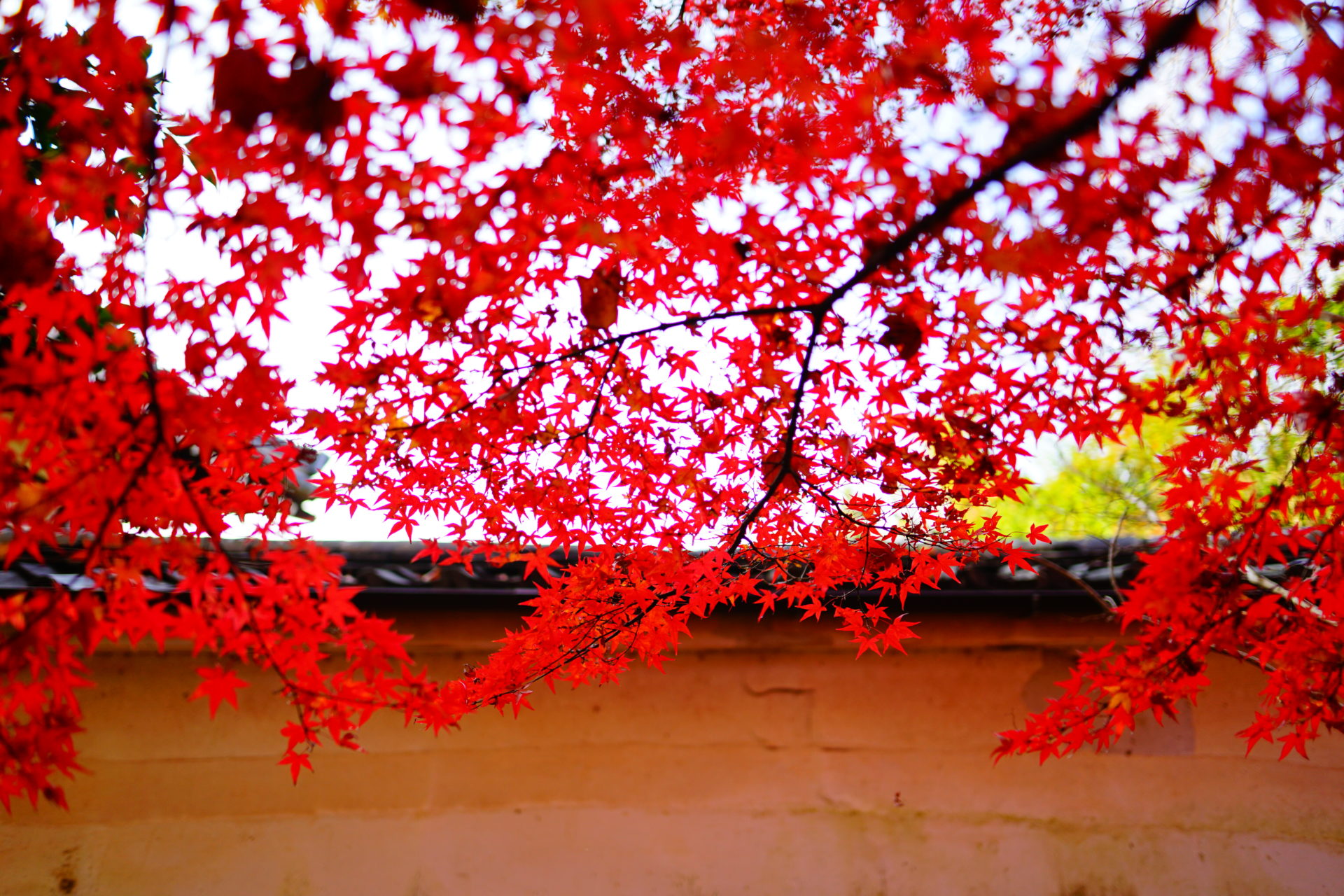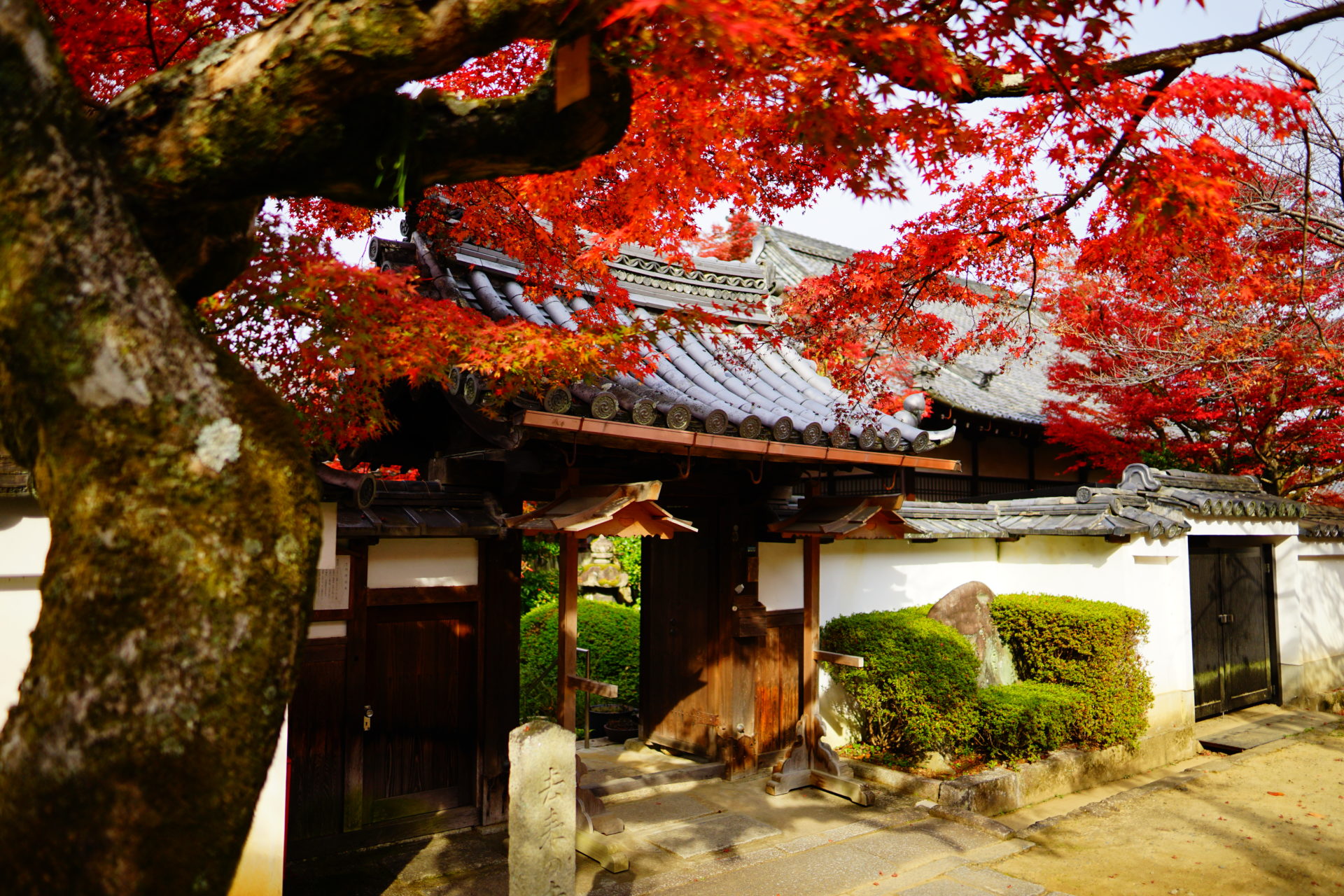 紅葉の撮影は逆光に限ります。光が紅葉の葉を透けてオレンジ色や赤の光源があるかのようです。ちょうど紅葉の時期の朝8時頃には参道から紅葉を撮ると、良い具合に逆光で撮ることができます。三重塔をバックに逆光で光る紅葉が狙い目です。ちなみに順光で紅葉を撮ると葉で光が反射してきれいな赤が撮りづらいです。
