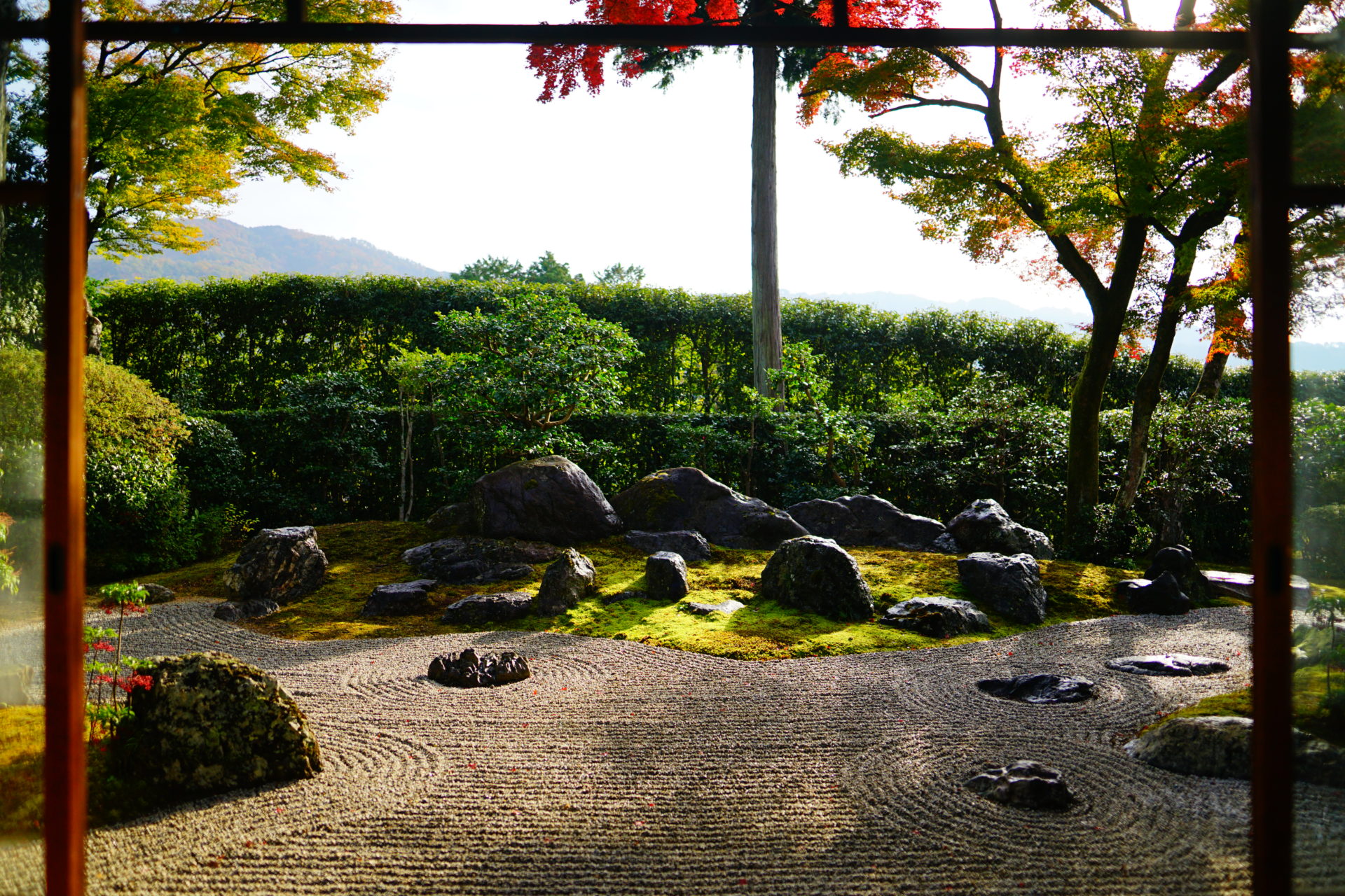 須弥壇に向かって左手の受付で拝観料500円を納めて、奥から縁側に出て渡り廊下を伝って書院まで行くことができます。書院には二つの庭があり、一つは「涅槃の庭」という、釈迦入滅の際の涅槃図をイメージして石組みでその場面を表現している庭です。確かに組み合わされた石によって釈迦が横たわっているように見えます。庭の奥にははるか東山の遠景を借景に取り入れており、広がりも感じる庭です。