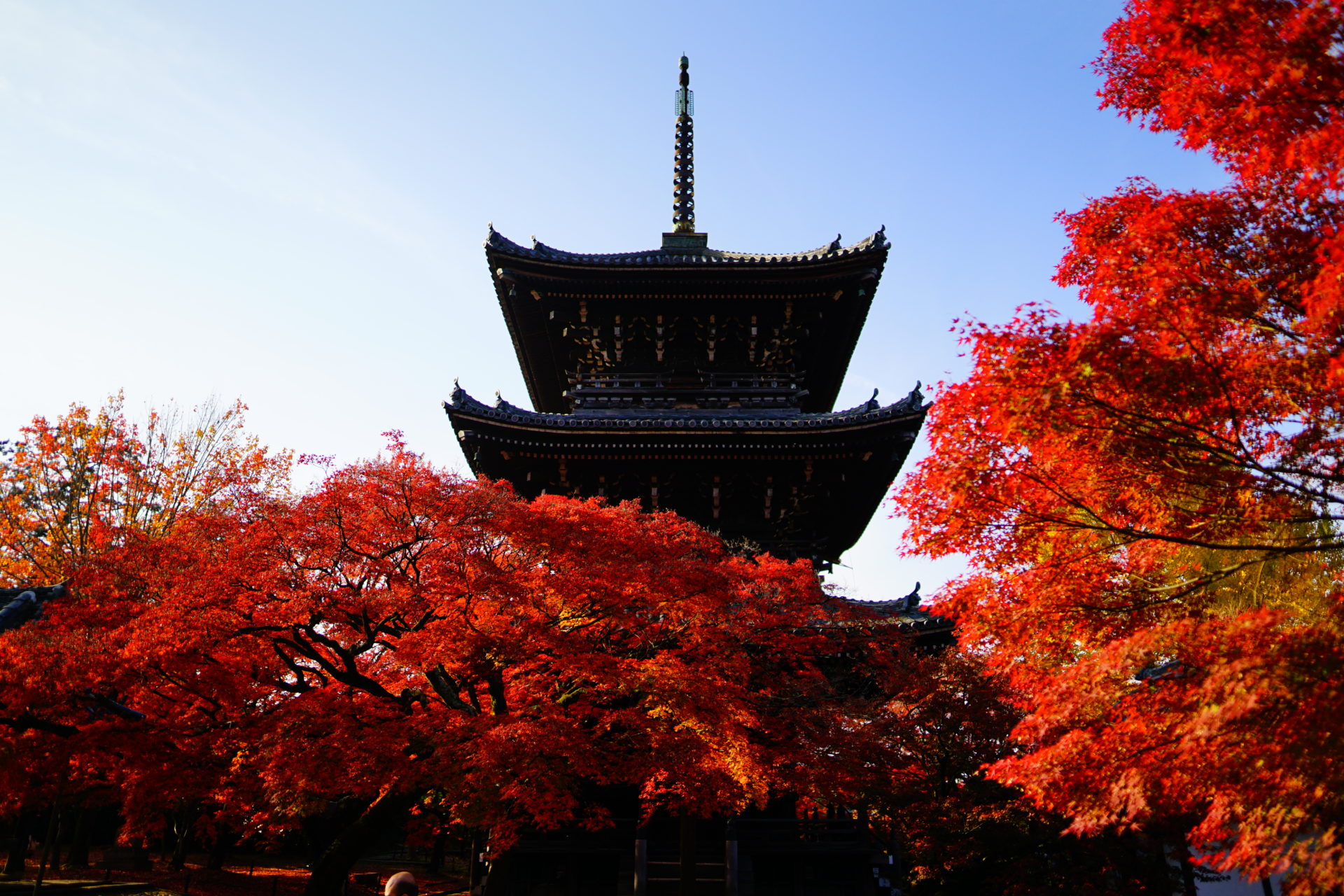 本堂がちらちらと見えてくるあたり、右手には三重塔があります。江戸時代後期の1817年建立となる、高さ約30メートルの三重塔です。同じく京都にある東寺の五重塔は55mほどあるのでおよそ半分ほどの高さです。撮影被写体として見るならば、三重塔の方が全体のバランスは良いと感じます。