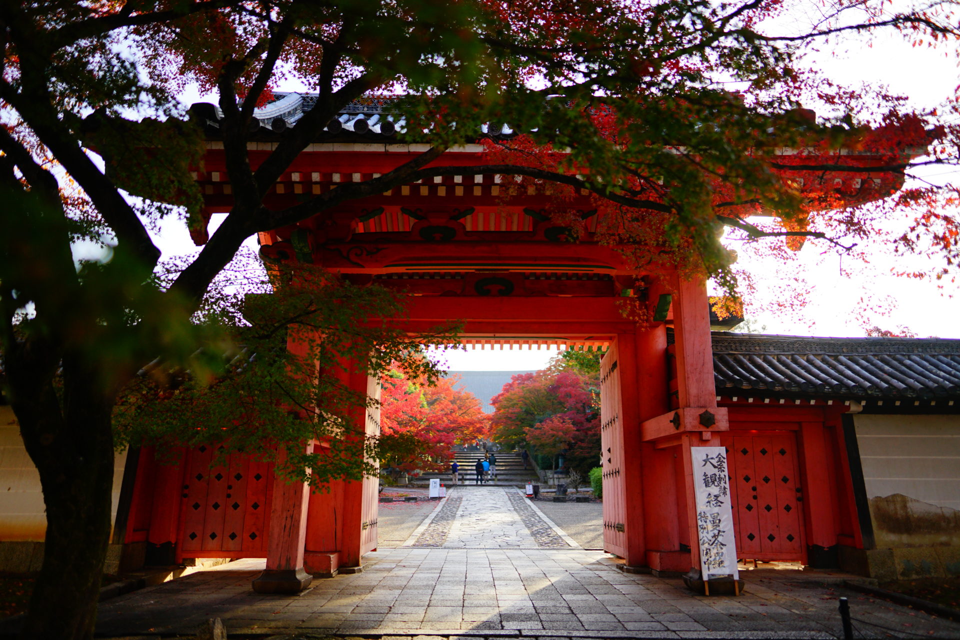 長めに取られたアプローチを進むと「総門」があります。総門は1695年再建の朱塗りの門で、真如堂ホームページによると、近くの吉田神社の神々が夜にここにお参りに来る際につまずかないように門の敷居を無くしたとのことです。なかなかおもしろい伝承です。