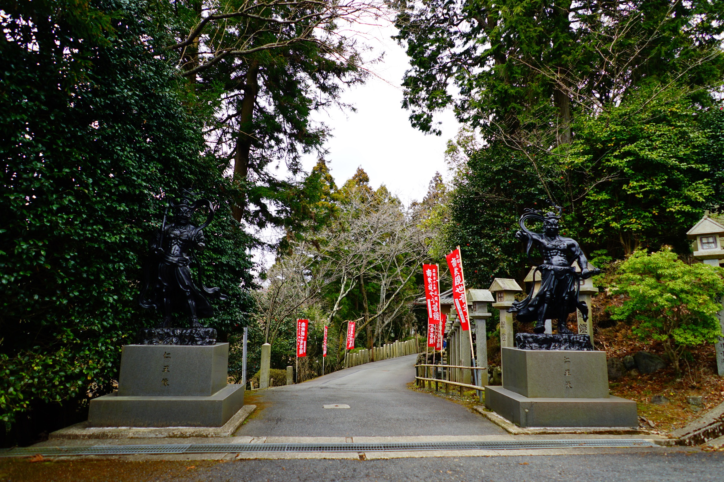 道路脇の雑草が車道にまで迫り出して、数日前に降った大雨の濁流が作った落ち葉の路面造形を覆っています。寺への徒歩道中はこう言った自然の造作以外は全く見るものがありません。ですが、1時間ほども歩くと案内看板などが出てきて程なく到着することとなります。三門のあるべきところには門が無く、そのかわりに金剛力士像(仁王像)の彫刻が寺を守っています。ここに門があったのか、もしくはもっと別の所にあったのか、調べてみたいものです。ちなみに毎月17日は石山駅から直通シャトルバスが運行されています。