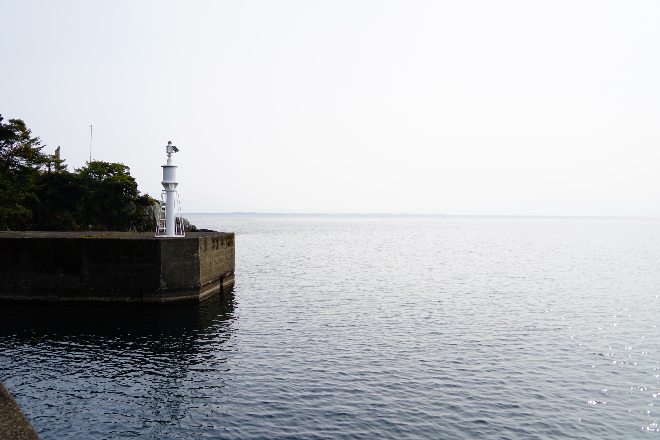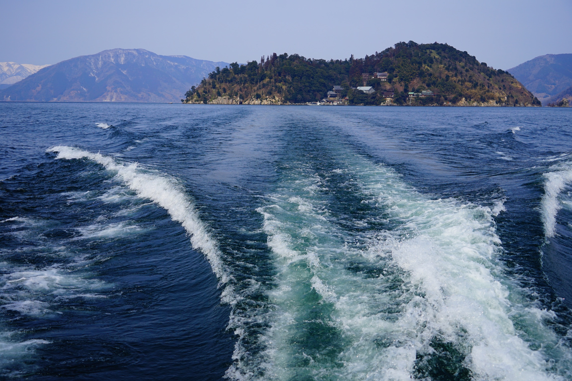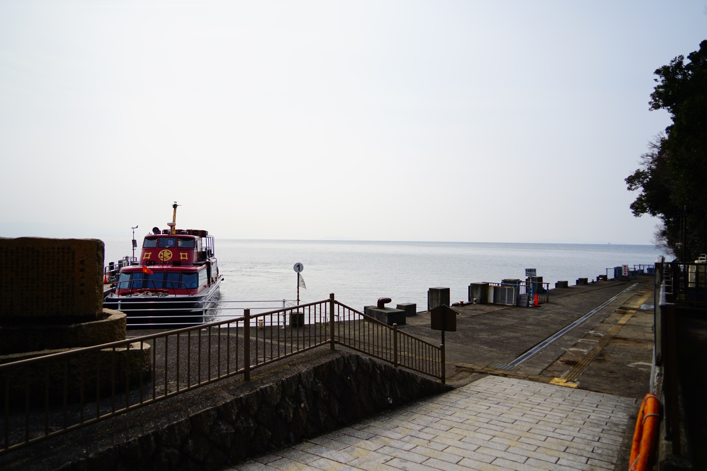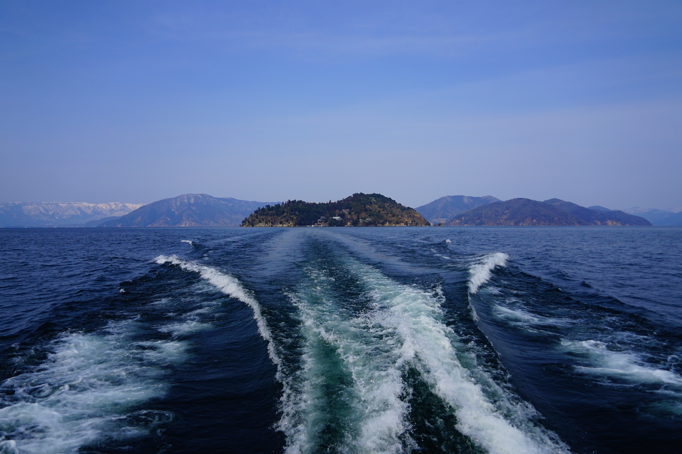 海のように広い琵琶湖を眺めていると、竹生島の港に到着するのもあっという間です。振り返って琵琶湖を見ると対岸が遥か先にあり、水平線のようです。