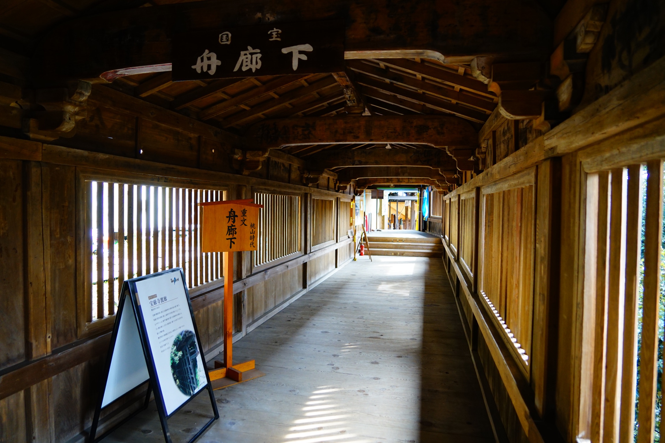 宝厳寺と都久夫須麻神社を結ぶ渡り廊下は重要文化財指定の舟廊下ですが、かつては国宝だったのでしょうか。廊下天井にかかった看板には国宝という文字で案内されています。ただ、そのすぐ下には重文と記載された案内板があります。