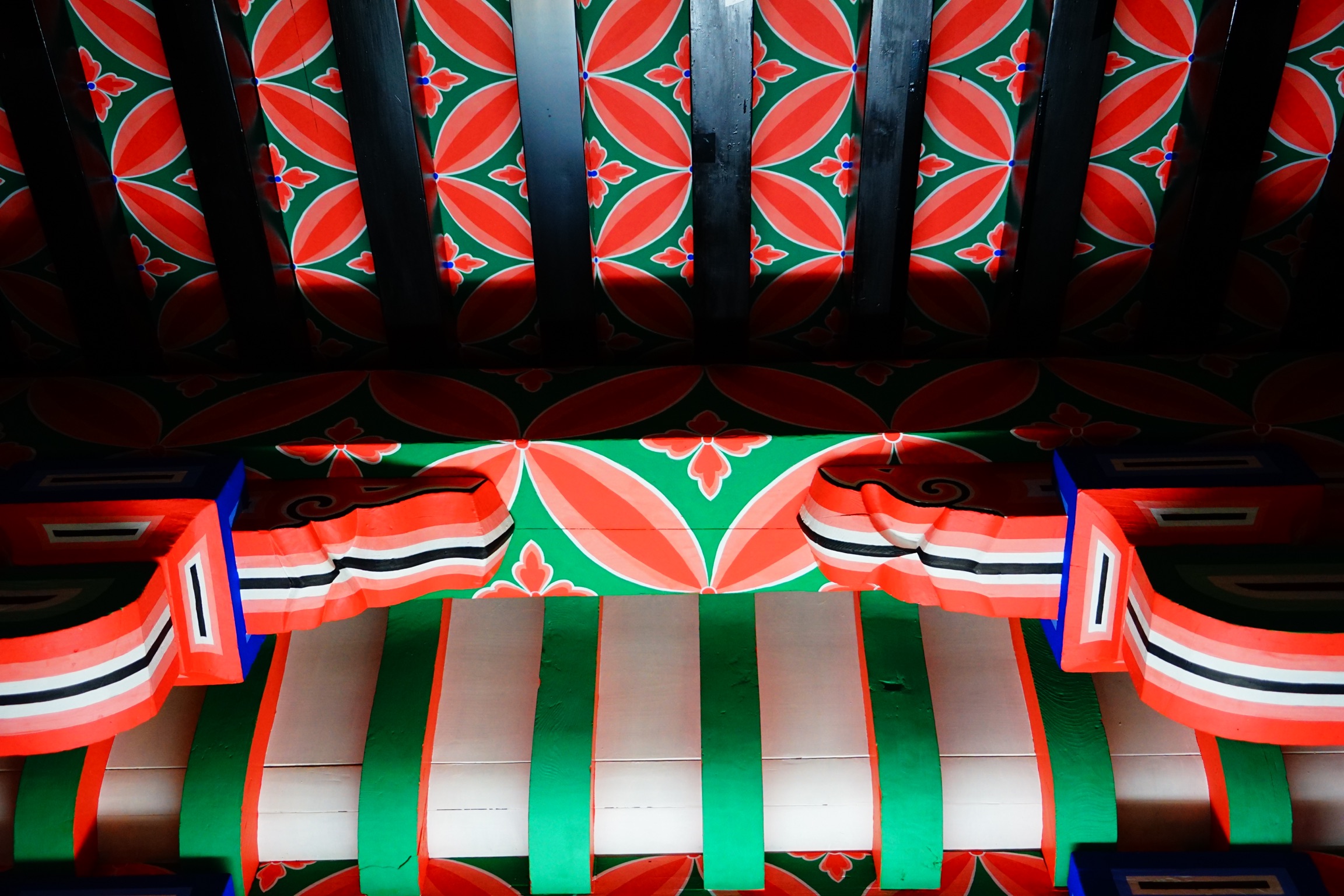 素晴らしく色鮮やかに修復された唐門天井部分。