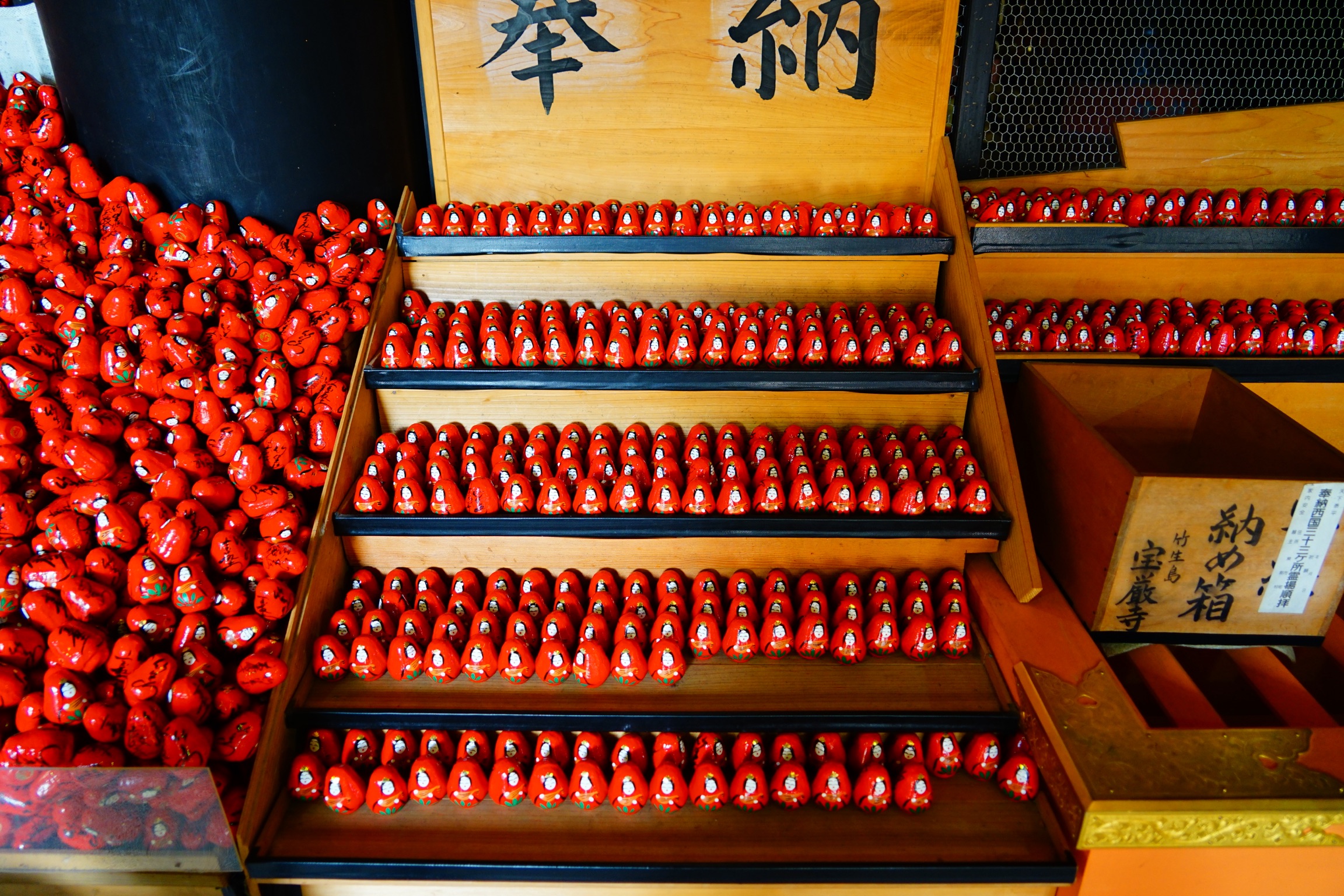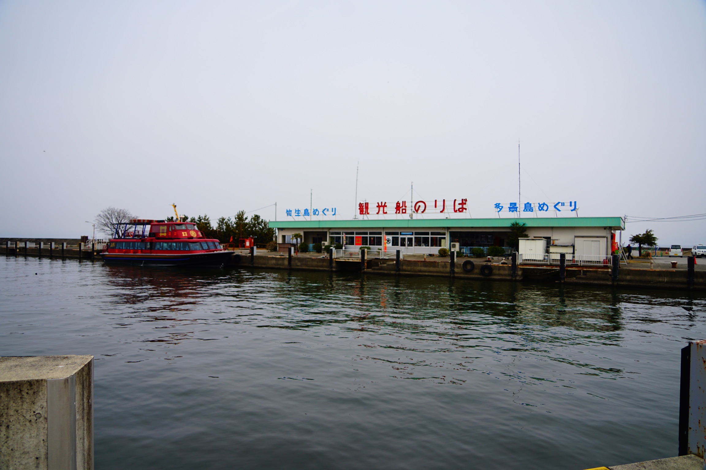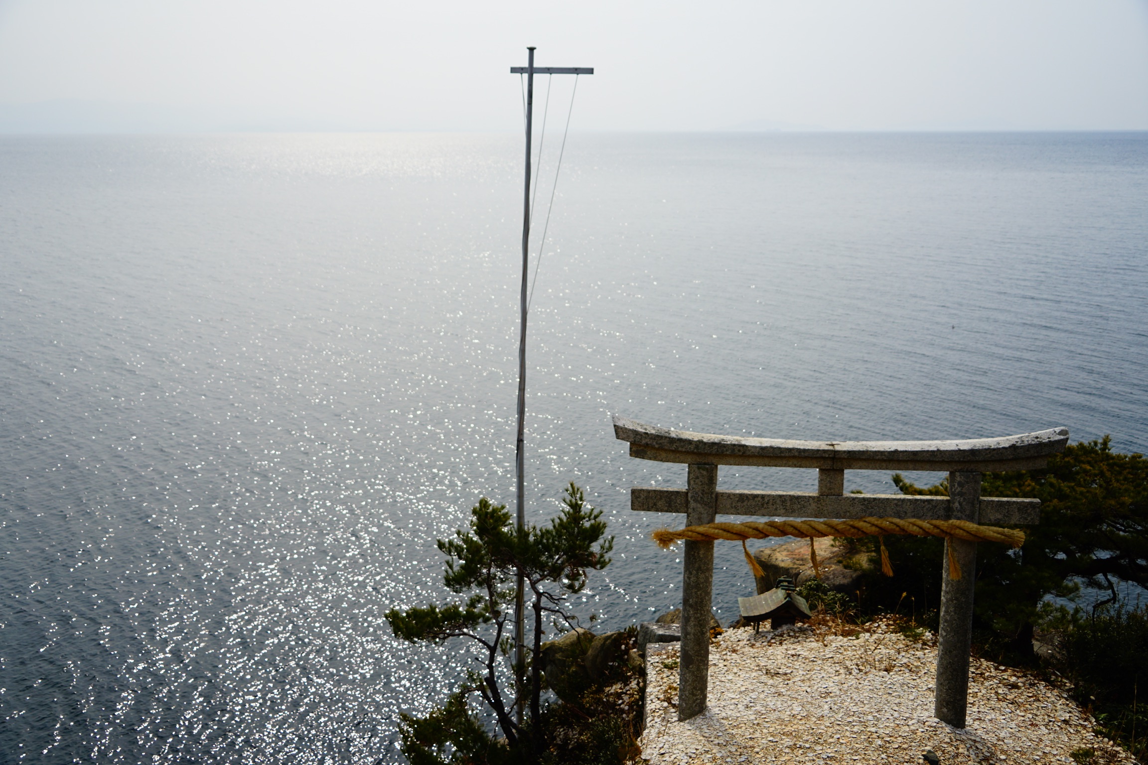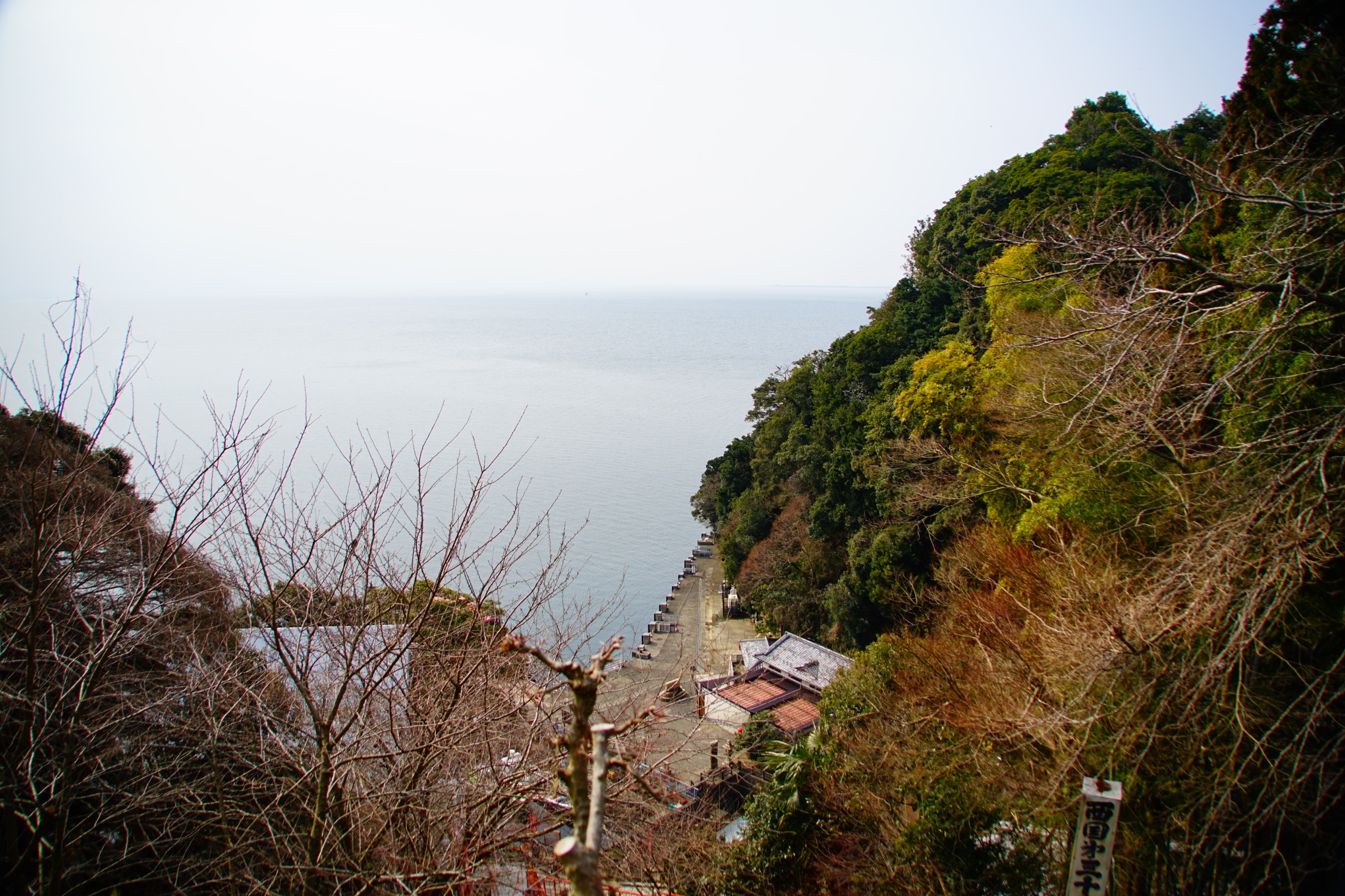 港のまわり以外はほぼ垂直の崖になっている、嵩が高くこんもりとした印象の島です。電気は来ておらずこの島独自に発電しているとの事です。入島して数軒の土産物店を抜けて入島料(拝観料)を支払う窓口の列に並び、すぐ見える急な階段を登ると宝厳寺と都久夫須麻神社の建物がちらほらと見えるようになります。