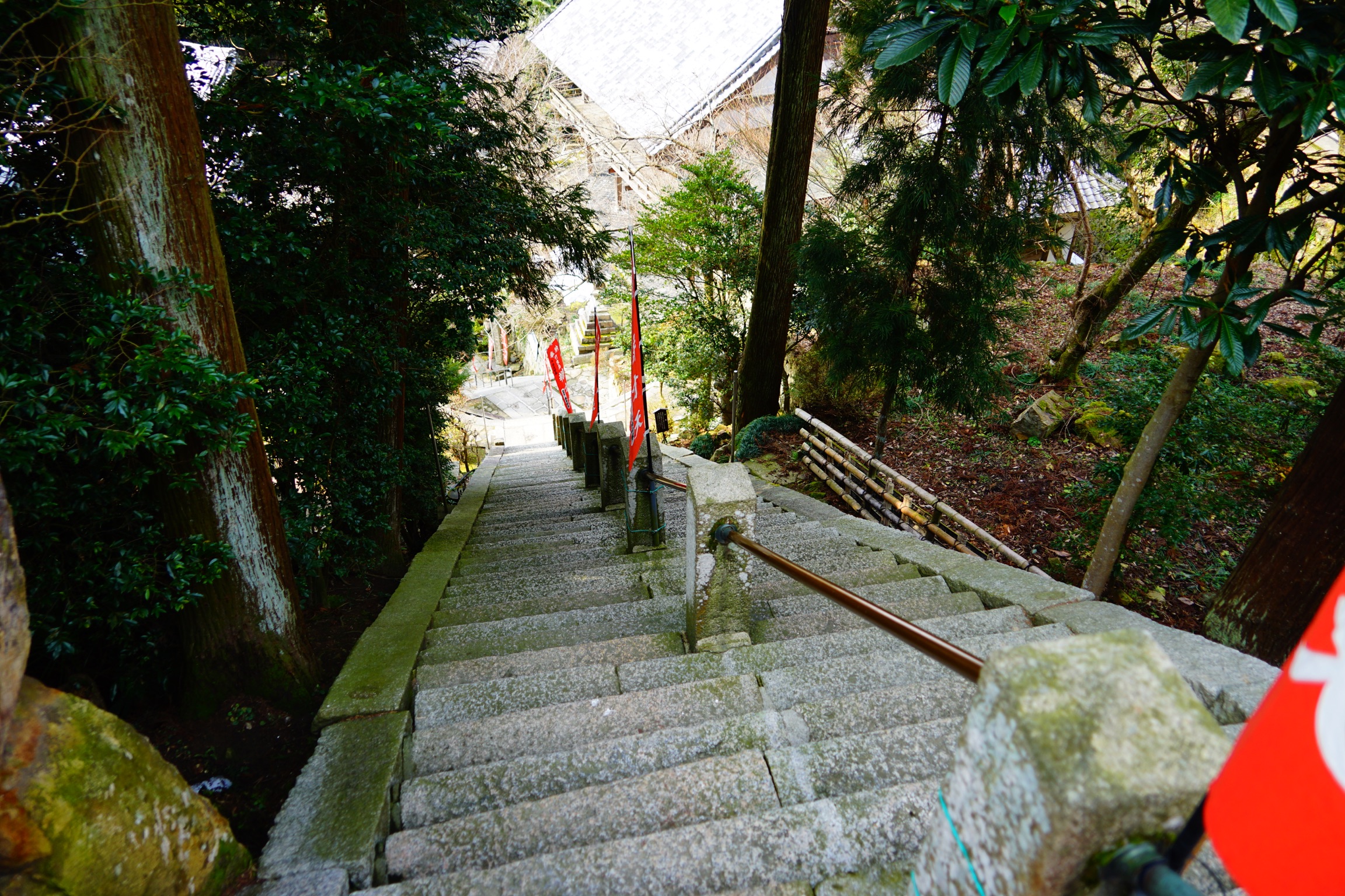 最初の石段を登りきった所から振り返って見ると急勾配の階段が。