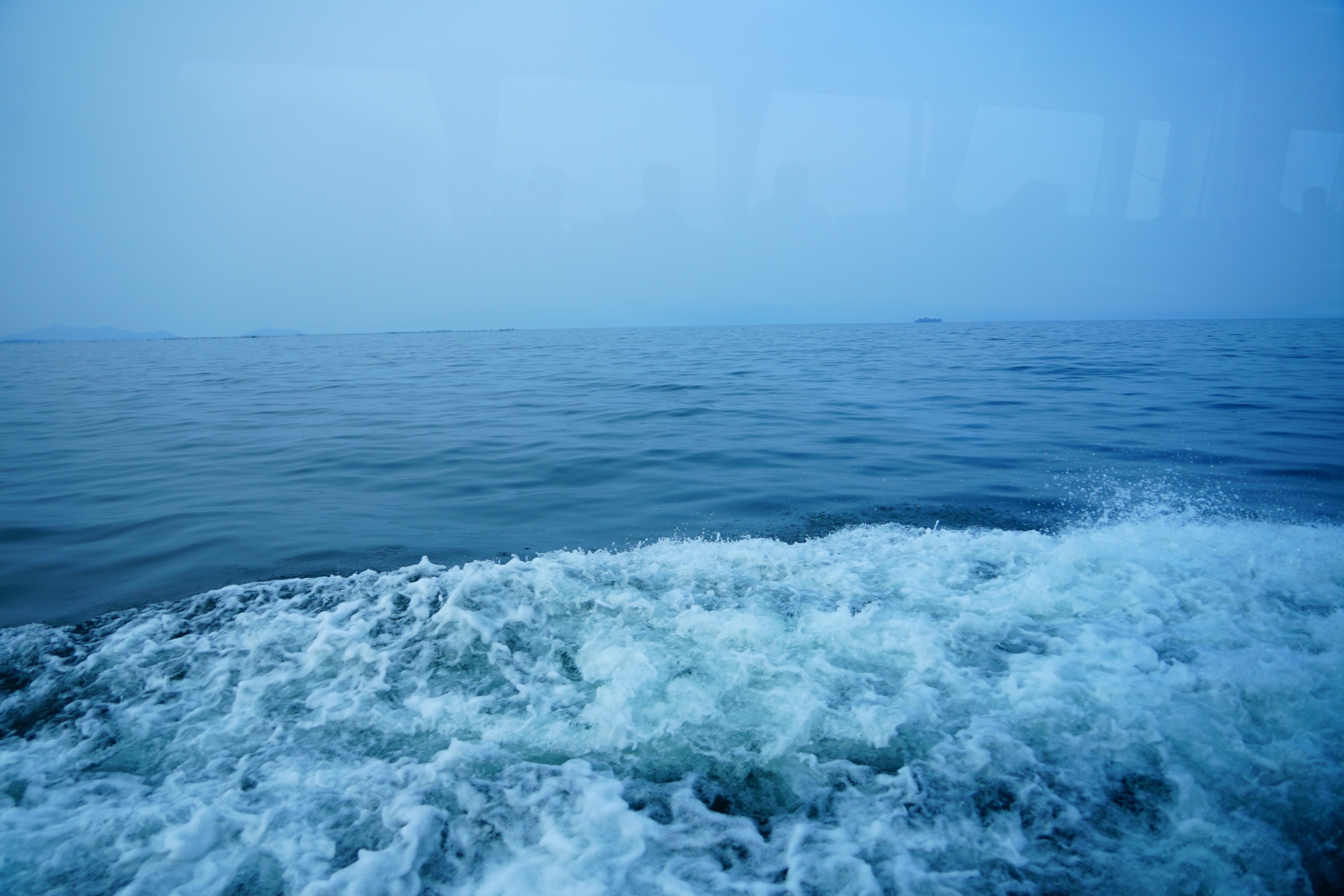 乗船場で往復の切符を購入します。3,000円です。9時30分に出発した船は割と高速に、青い巨大な水のかたまりを白い波と共に削り取って行くように滑らかに進み信仰の聖地を目指す40分の船旅が始まります。