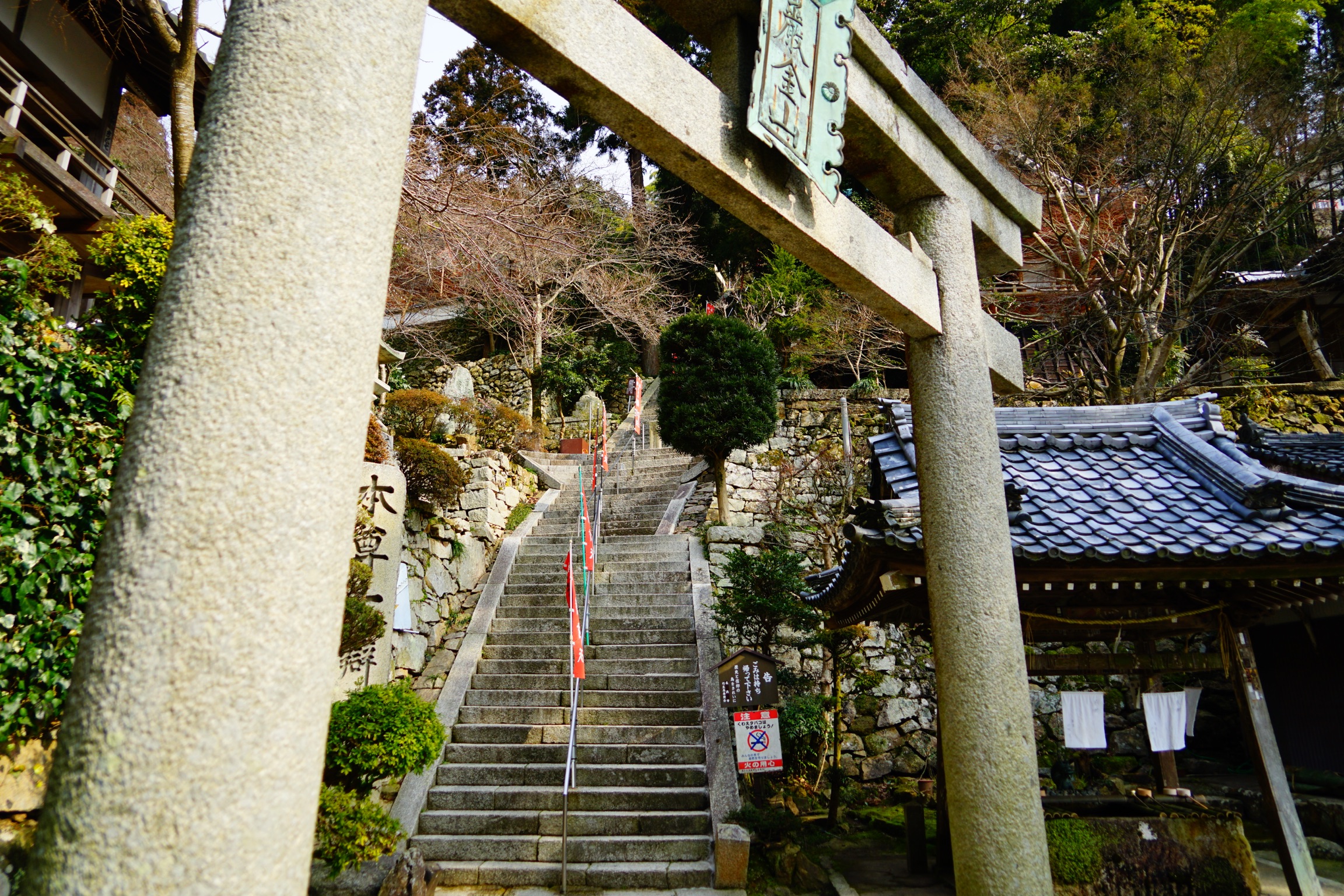 最初の石段を登りきったところにある鳥居には厳金山の扁額が付けられており都久夫須麻神社と一体の神仏習合の時代を偲ばせます。こちらも他の多くのお寺と同様に明治初期の神仏分離令以前は神社と一体となった信仰霊場を形作っていました。