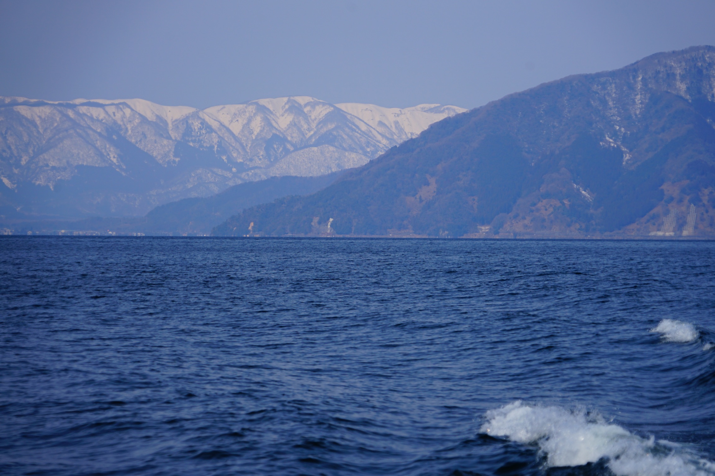 途中、琵琶湖のあまりの広さに湖である事を忘れるほどです。遥か彼方に薄いブルーで霞んで見える地球用の屏風のような壁が、せめて行き止まりを意識させてくれるようです。