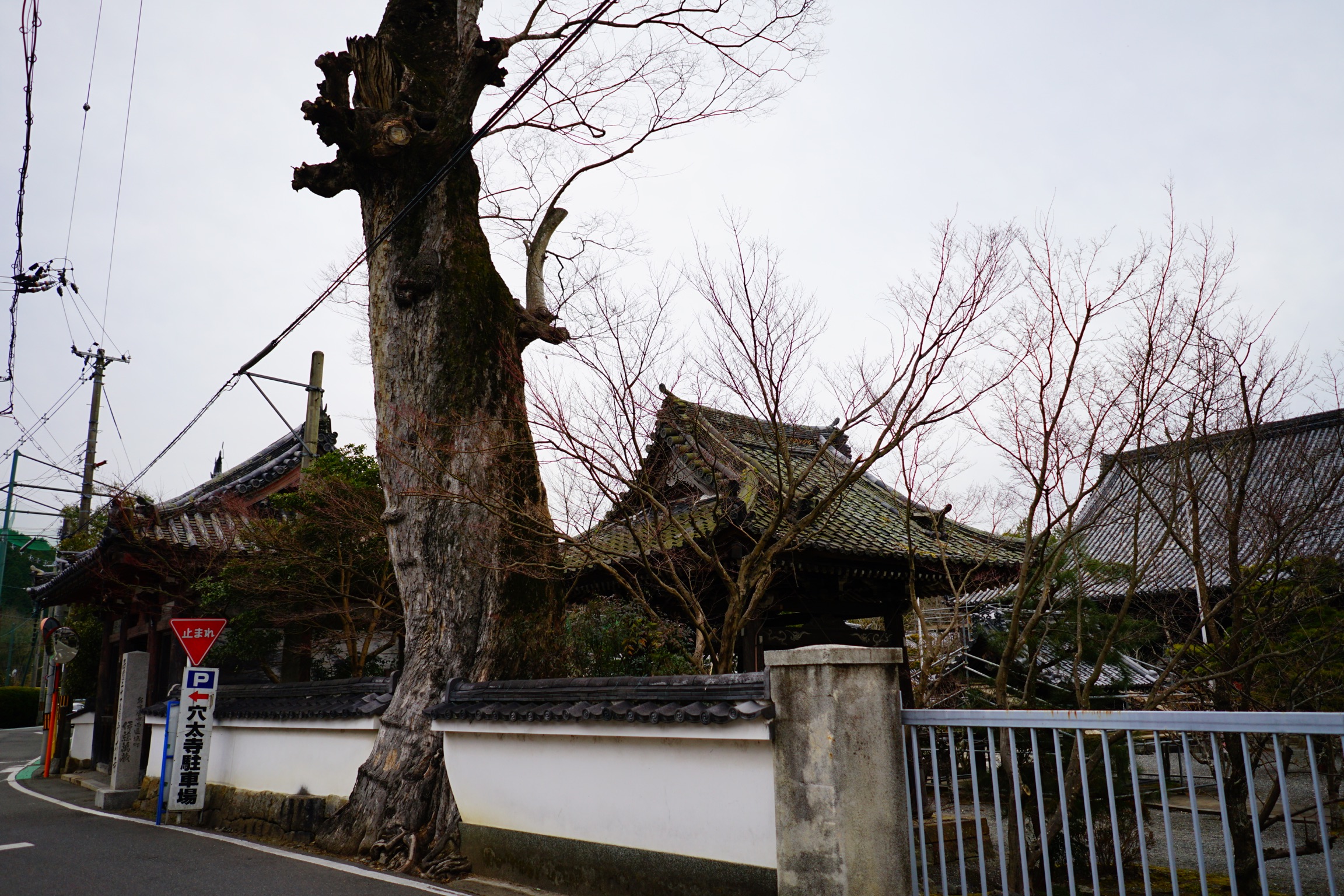 田園地帯を歩いてくると段々と民家が密集してきて、かなり昔からの集落のような雰囲気になり、なんとなく穴太寺はもうすぐかなと感じられて来ます。道に小さめの案内看板が出てきますのでそれに従ってグルっと廻って正面の三門へ廻ります。三門の手前の、お寺の壁を突き破るように生える巨木が歴史の深さを無言で語っているようでした。