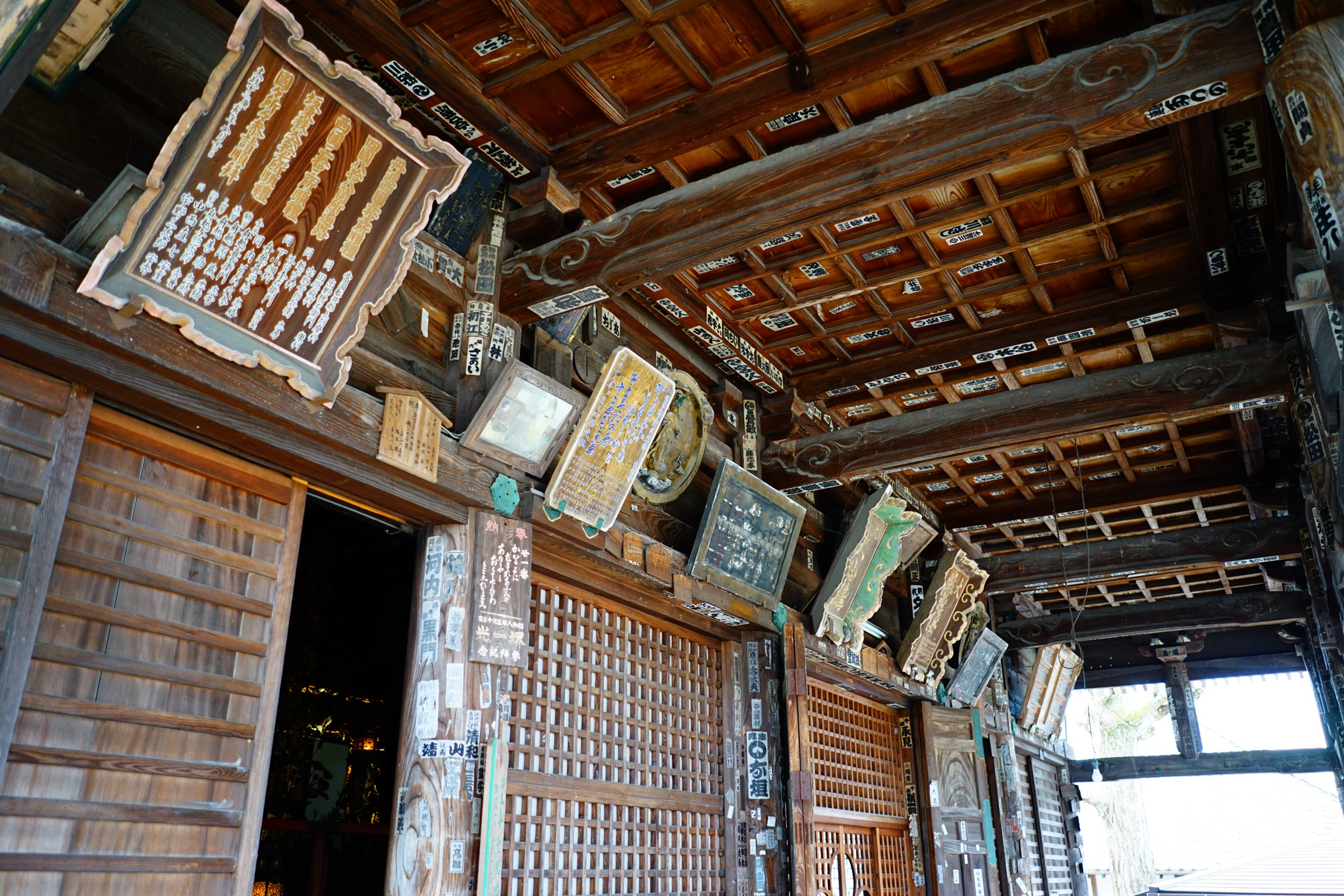 本堂正面の外陣を見上げて、三つの懸仏が並ぶ。