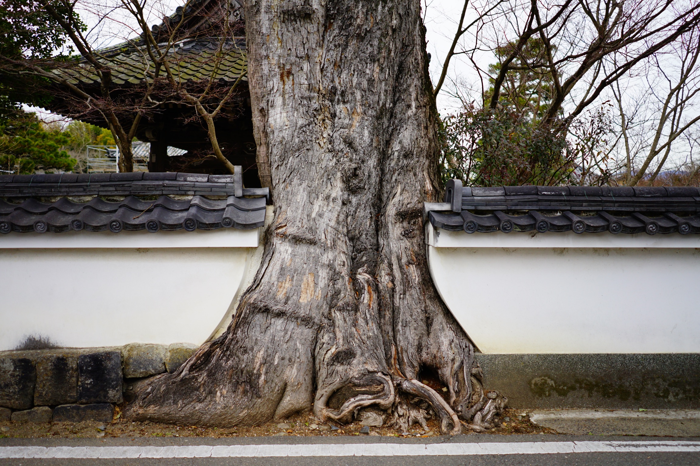 三門の横の壁を突き破るように植わる大木。