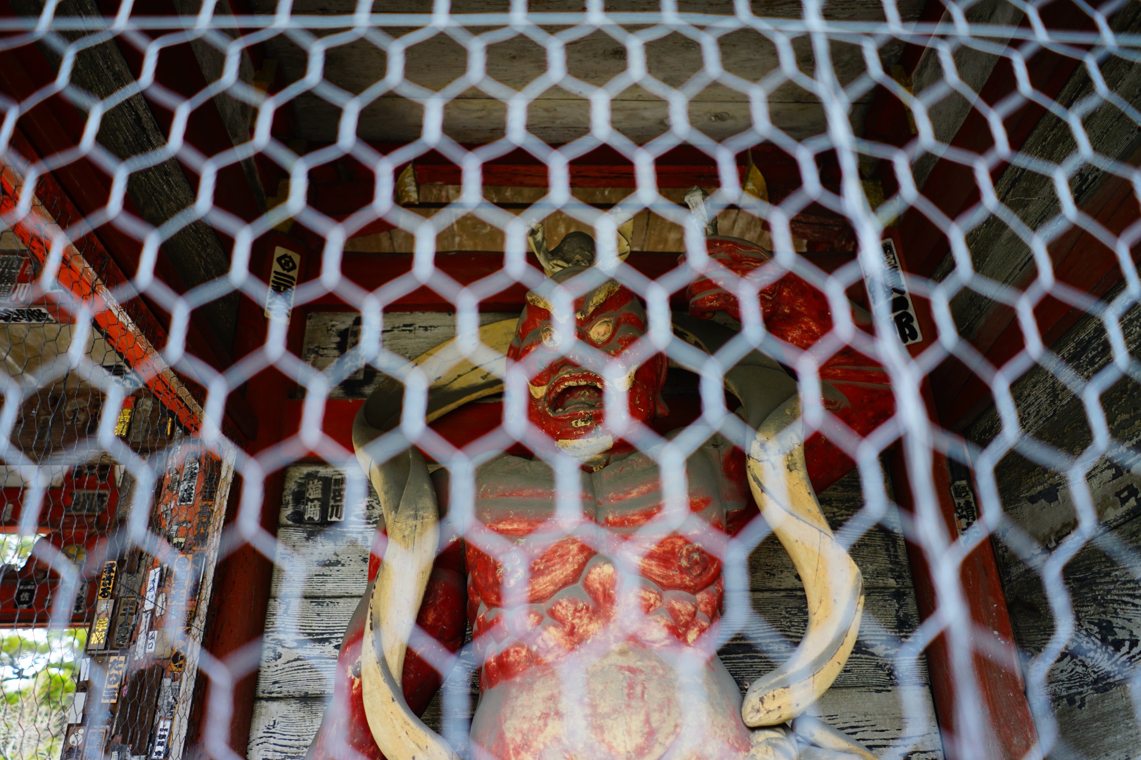 網越しに見る金剛力士像はなんとなく可愛らしい表情。