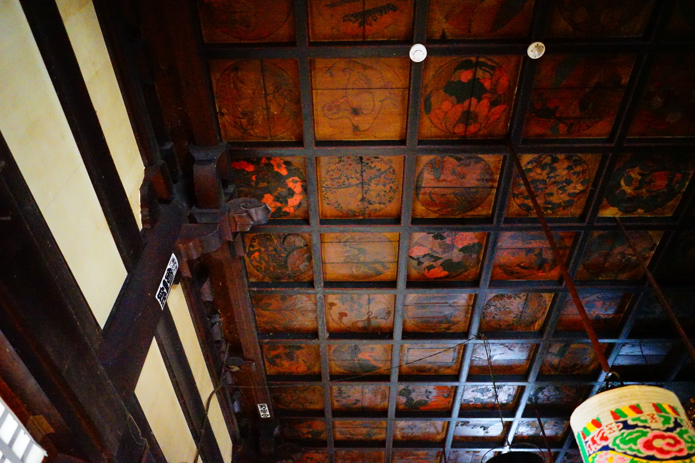 本堂外陣の格天井には多様な文様が。