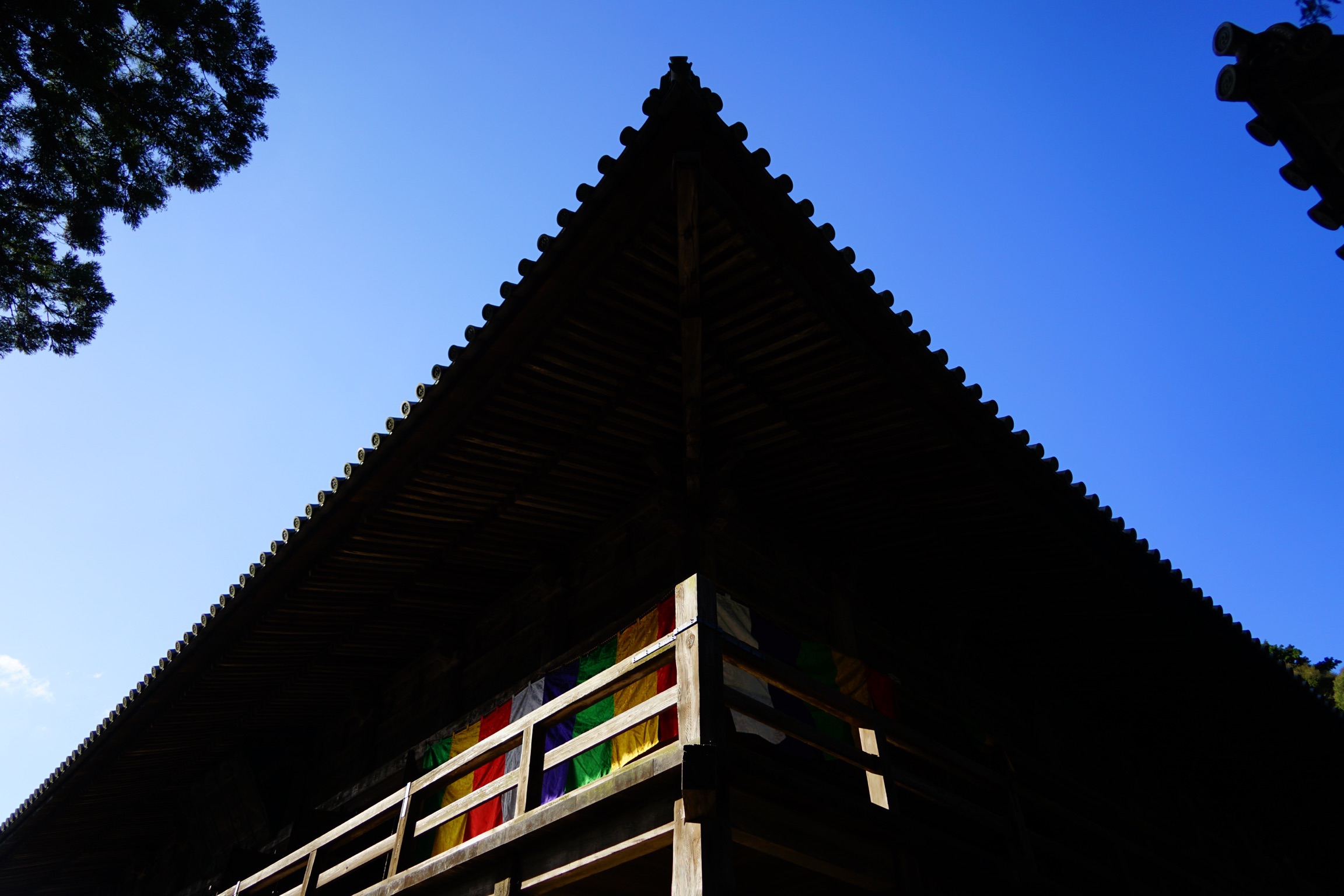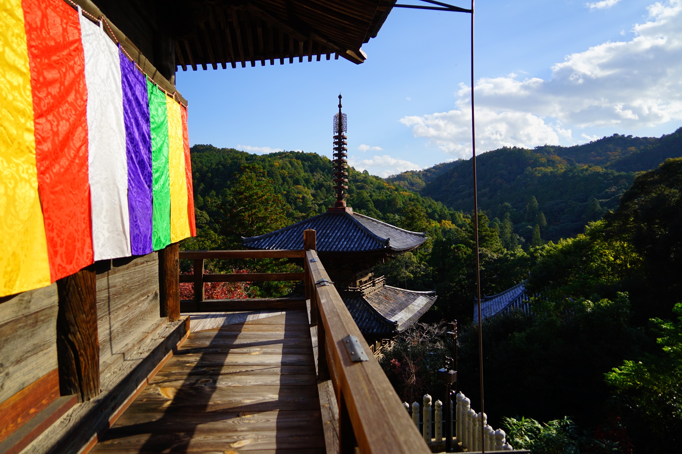 ここから更に石段を登るとようやく本堂が見えてきます。斜面を登るごとにお堂が現れる、まさに山寺であると言った感じです。本堂は下から見ると懸け造りのような斜面ぎりぎりに建つお堂で、縁側沿いに半周歩いて斜面側から入ります。途中、三重の塔を屋根の上部から見ることができます。このようなアングルで塔を見ることができるのはあまり無い機会です。