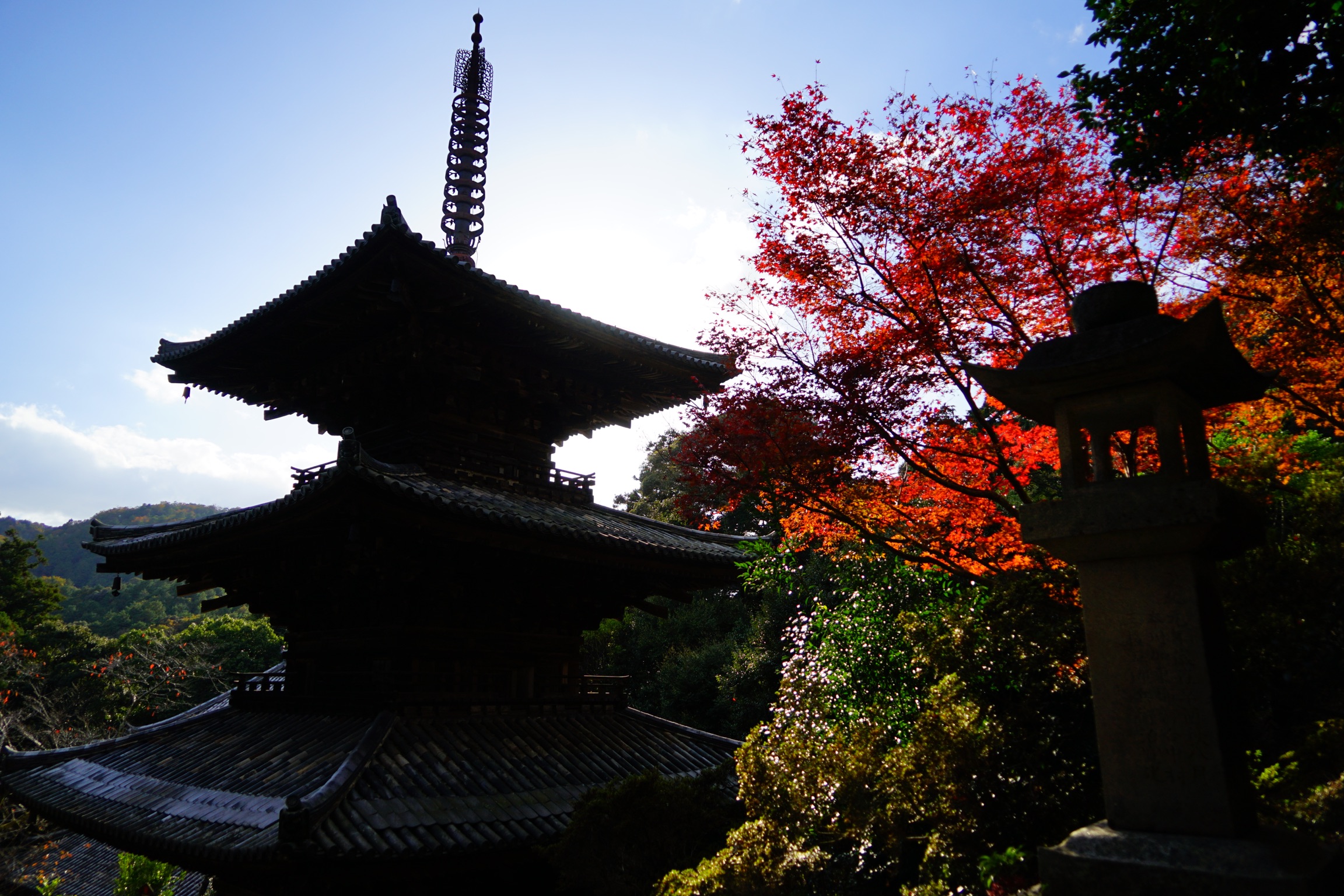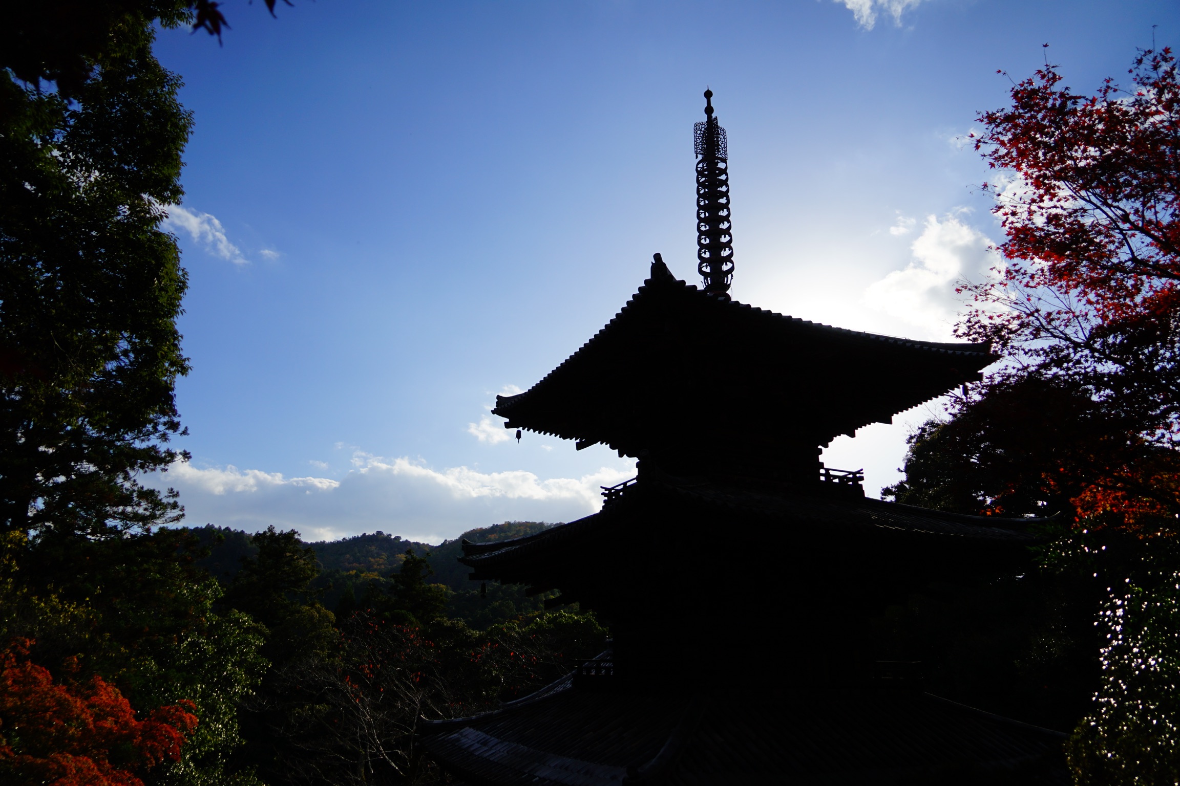 逆光でのシルエットが美しい三重の塔。