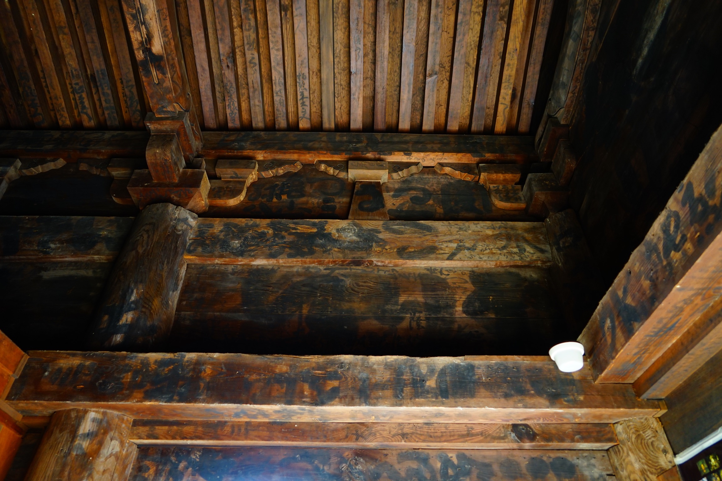 本堂外陣天井の梁材には何やらの文字が見えます。
