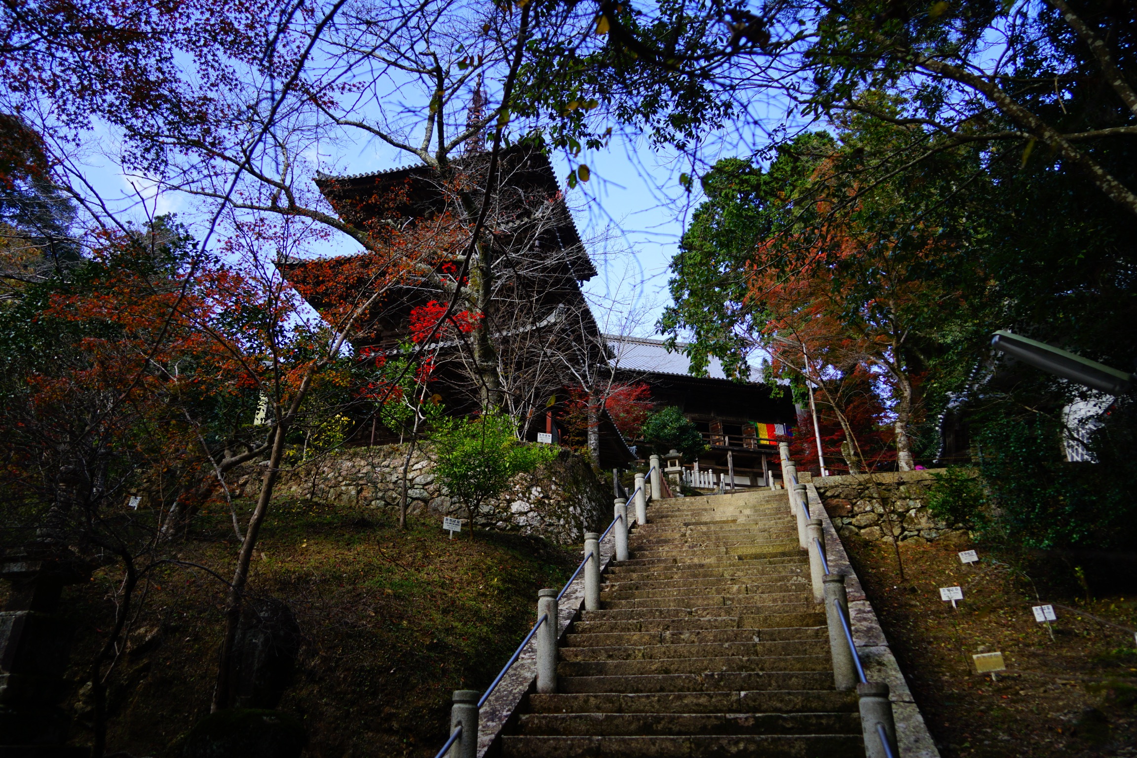 更に石段を登ると次の平地にはこのお寺屈指の古堂である三重の塔があります。平安時代末期の建立となる国宝の塔です。最下層では非常に大きく屋根の広がりを取り、上の層ほど屋根を小さく造り遠近法を強調する手法でより迫りくる印象を見る者に与えています。