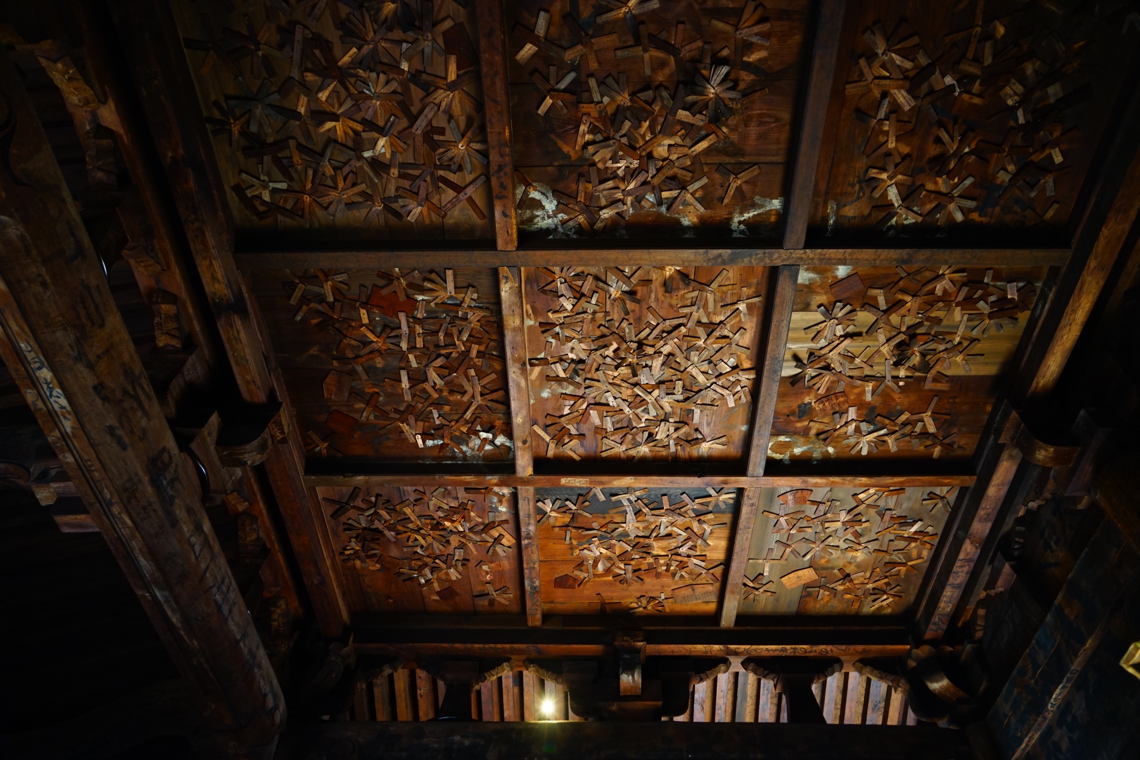 江戸時代の巡礼者の納め札が天井にびっしりと打ち付けられている。