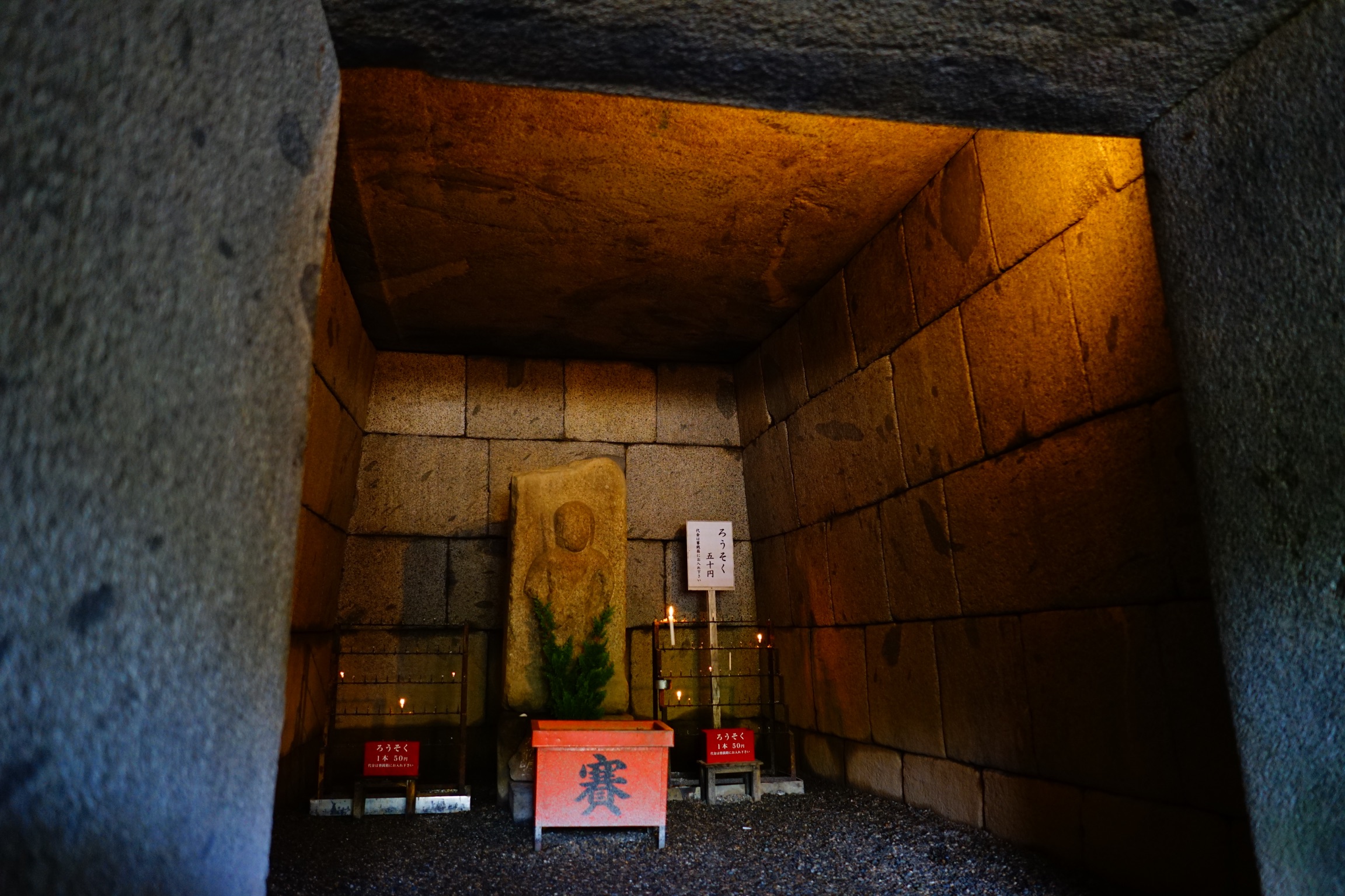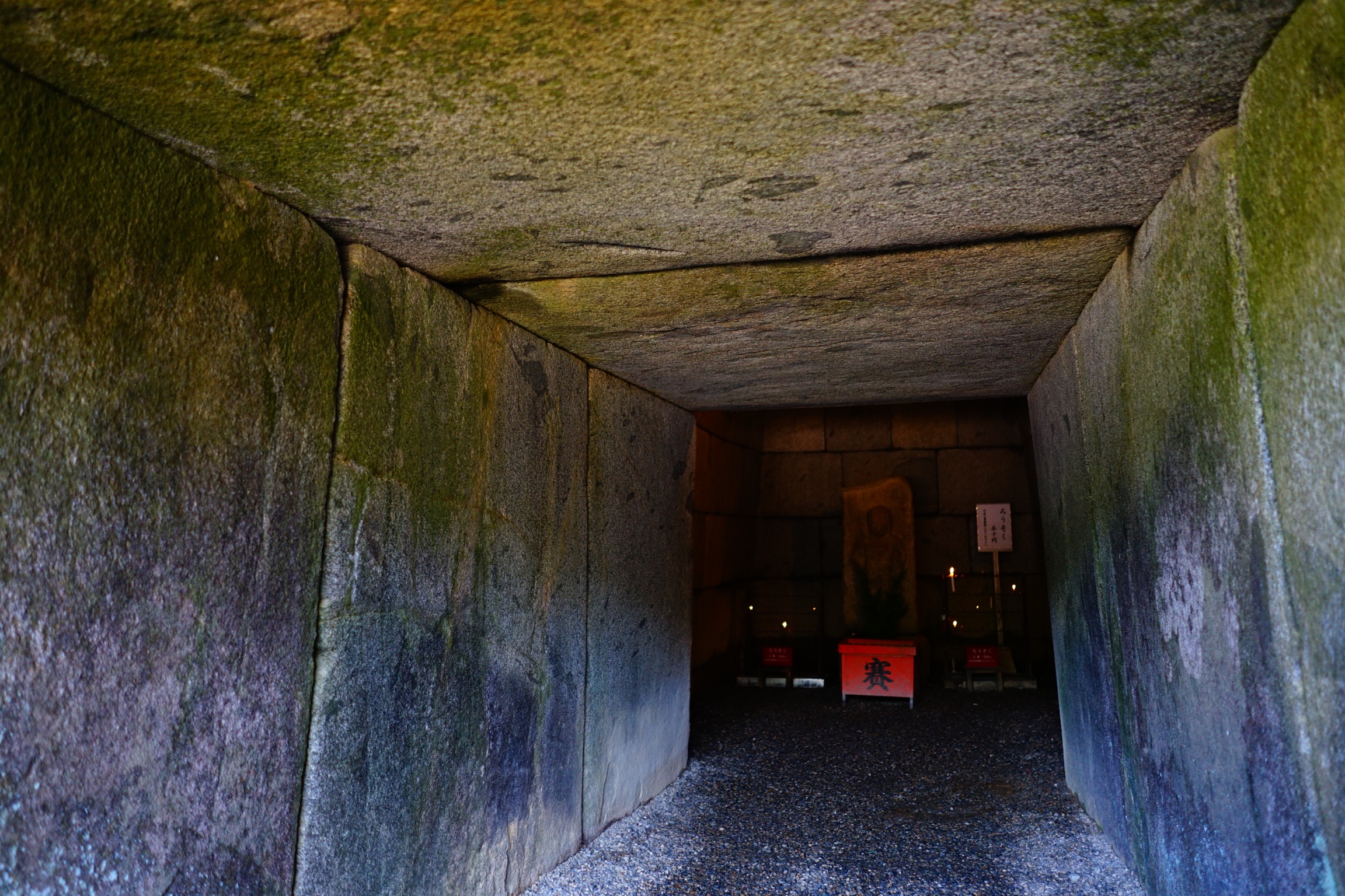 安倍文珠院でもう一つの見どころは西古墳です。645年の創建当初からそのままの状態で残っており、石切りや加工の技術の高さに驚かされます。水平、垂直がピシッときれいに整っており、隙間なく歪みもせずに配置されて、一番広い部分の天井は一枚岩で覆われています。現在は空海が彫ったと伝わる石造りの不動明王像がお祀りされていますが、当初は安倍一族の墓であったようです。