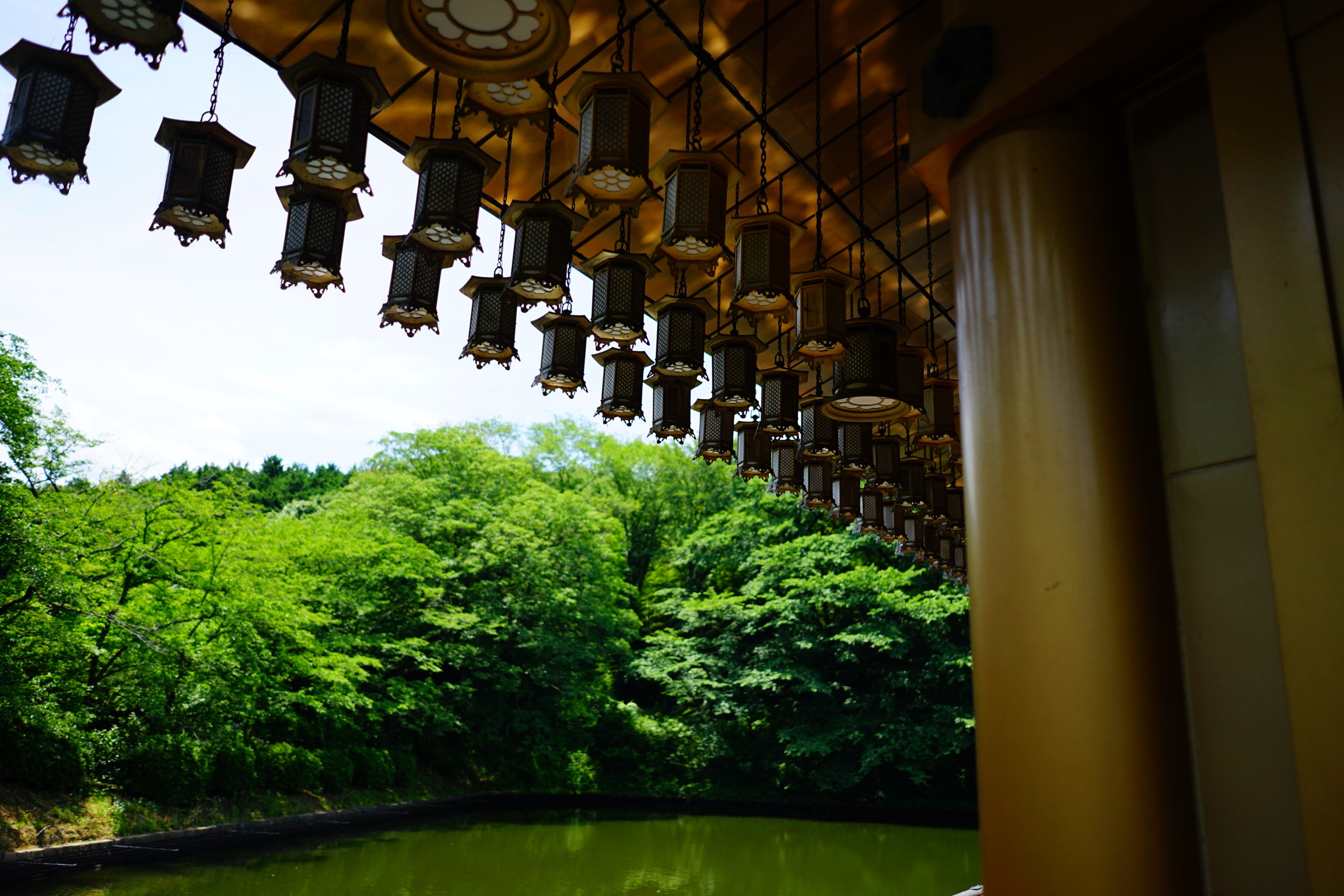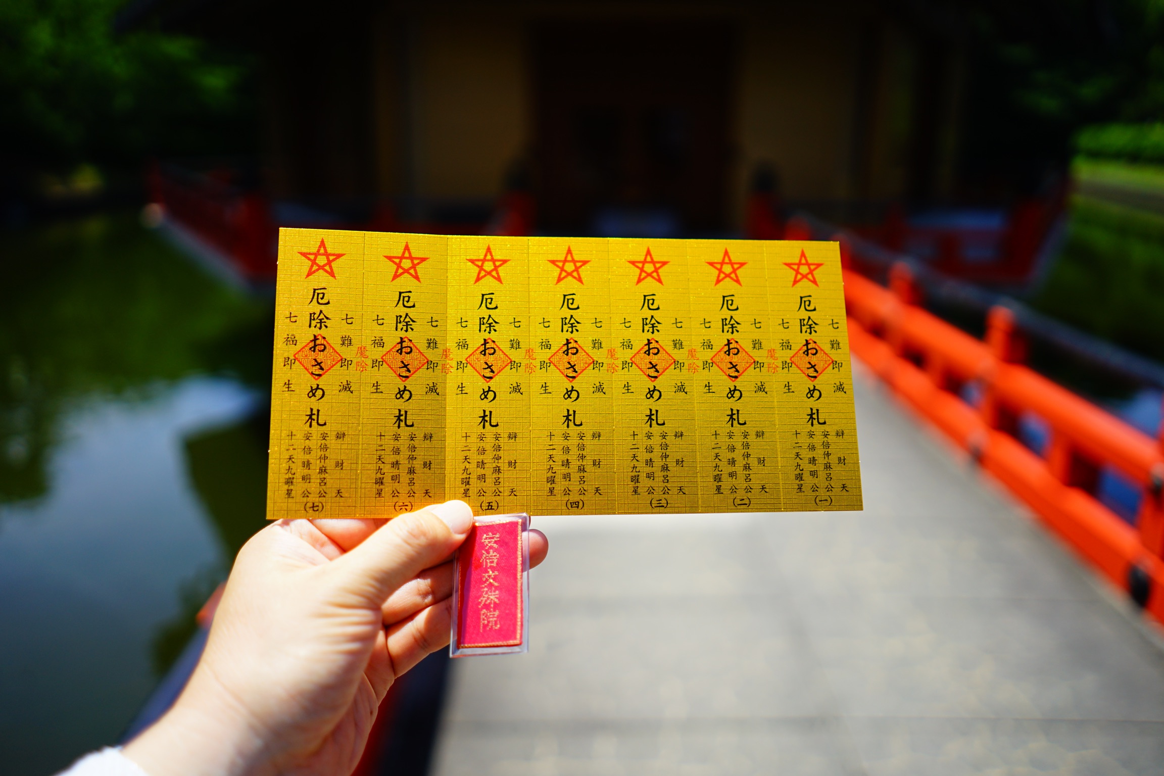 本堂の向かいの池の中には六角形の平面の金閣浮御堂が建っており、渡り橋でつながっています。こちらには安倍晴明をはじめとする安倍一族をお祀りしており、ご利益を頂くにはお堂の周りを1周するごとに御札を預けて、全7周のお参りをする「七まいり」を行います。