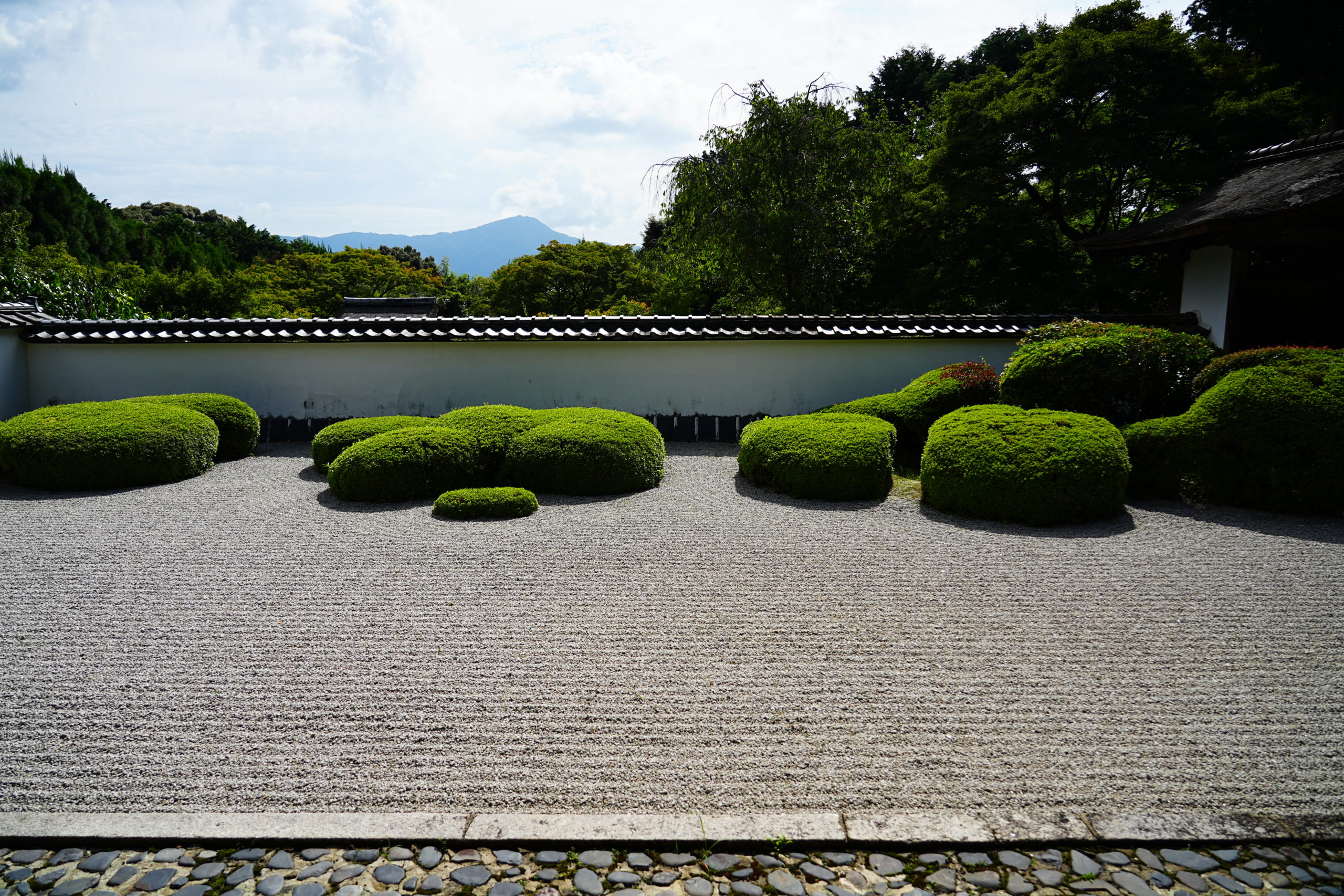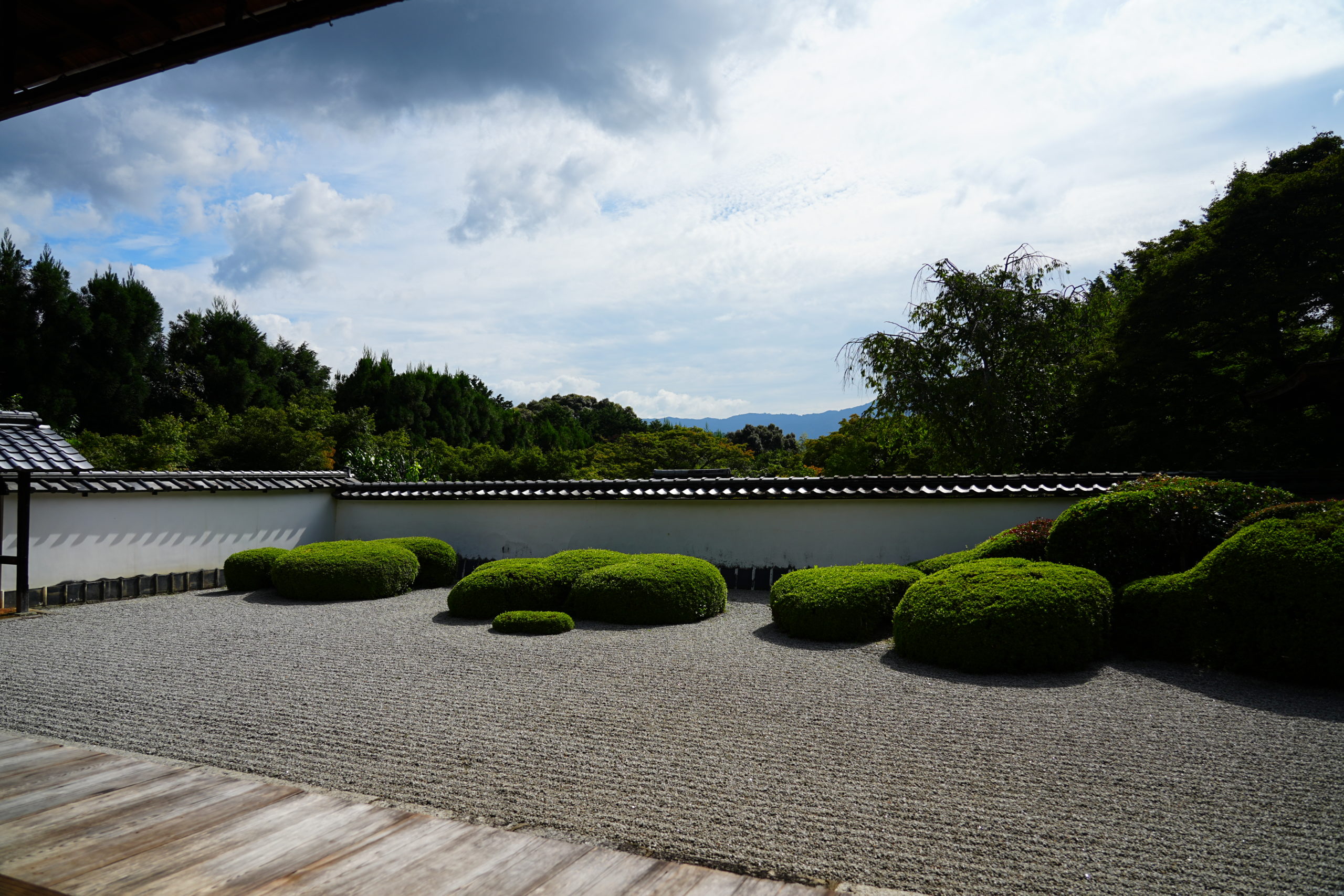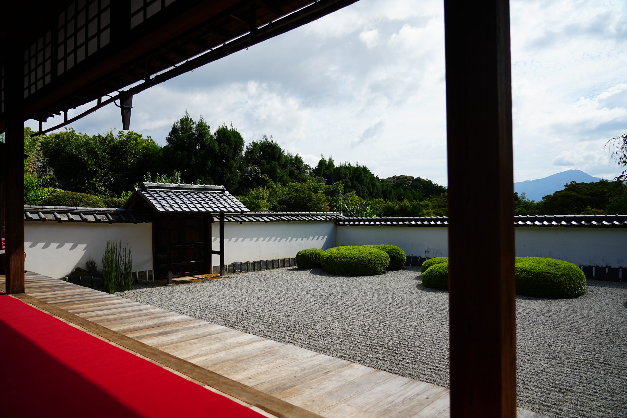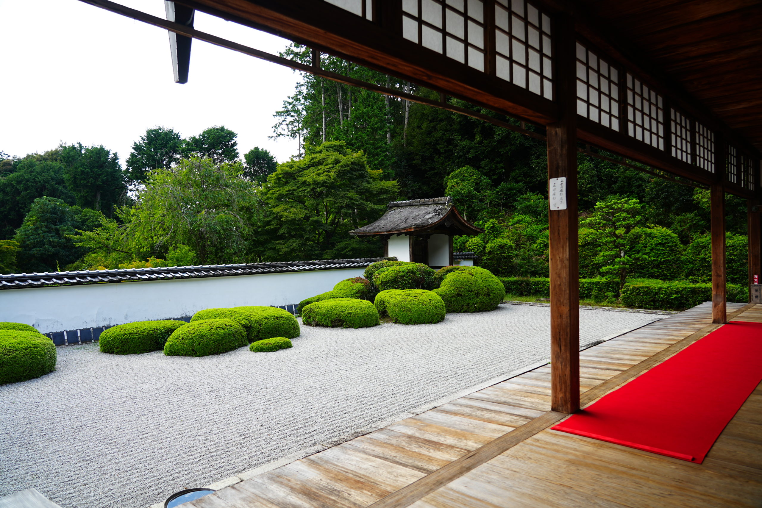 誰もいない広縁には中央部分に赤の毛氈が敷かれて、庭園の緑と対照的な色合いを構成しており目に鮮やかです。この庭、一般的な枯山水庭園とは少し趣を異にしている印象を受けます。それは白砂と刈り込まれた植栽だけで整えられており石を配していないため、柔らかで優しい印象です。