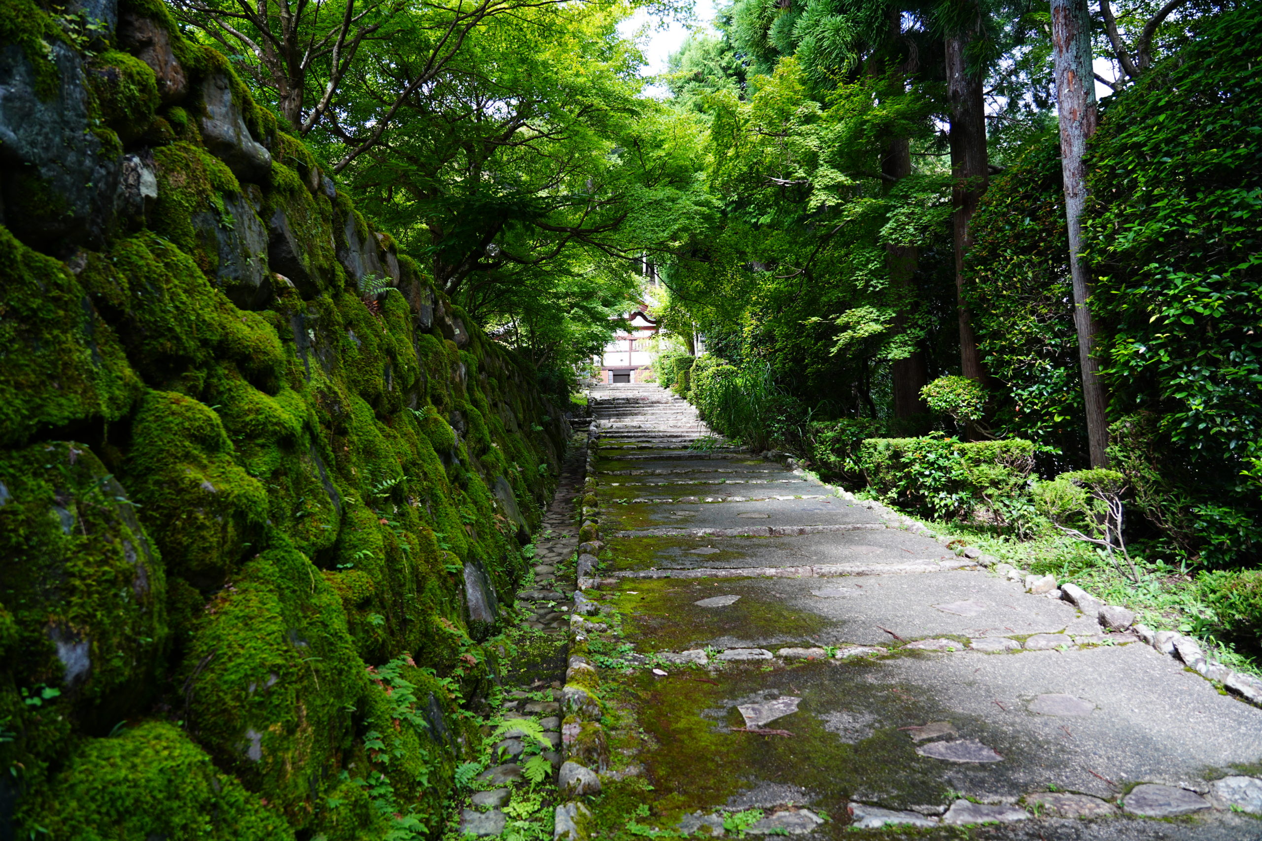 自然そのままと言った状況の参道を登っていき本堂がチラチラと見えだすあたりから、苔むした石垣が風情を感じさせるとともに長い歴史の存在を物語っています。左手の木立の中に鐘楼が見えますが、お寺の境内というよりは森の中にあるといった状況です。
