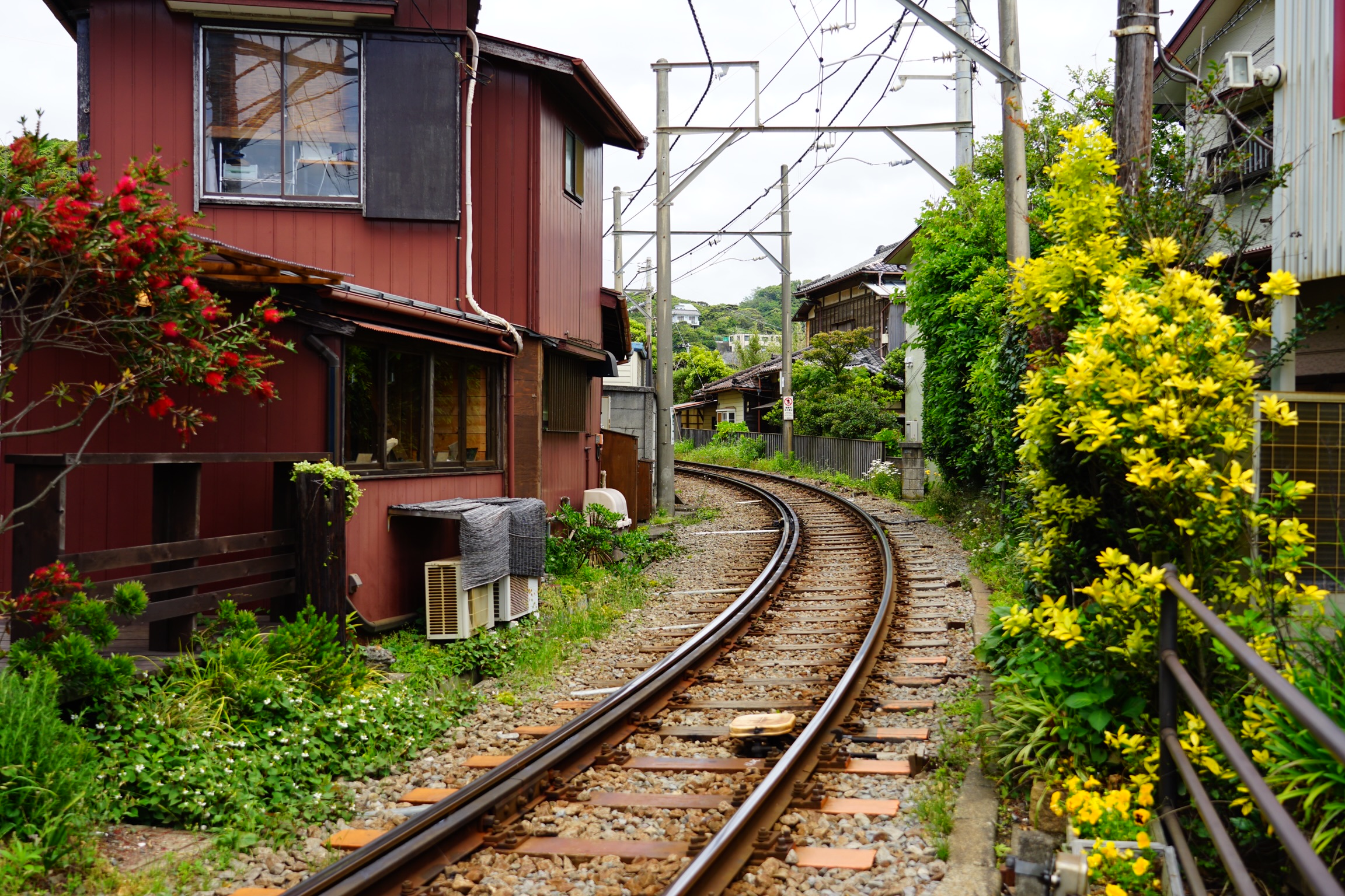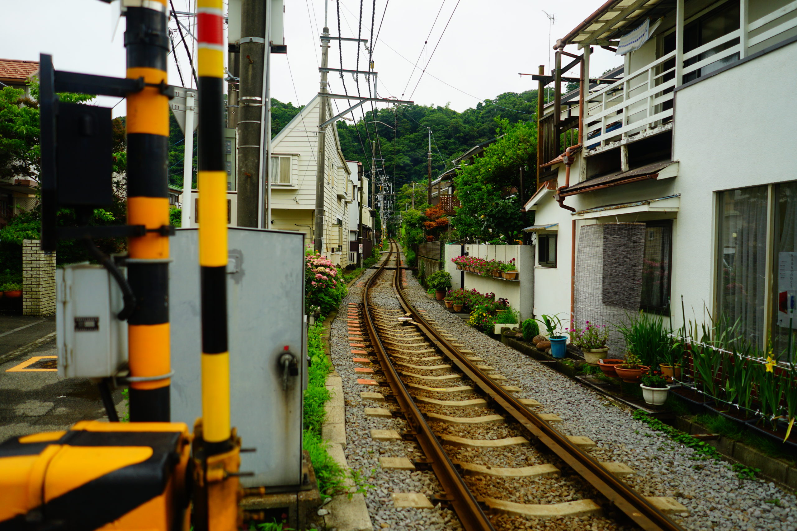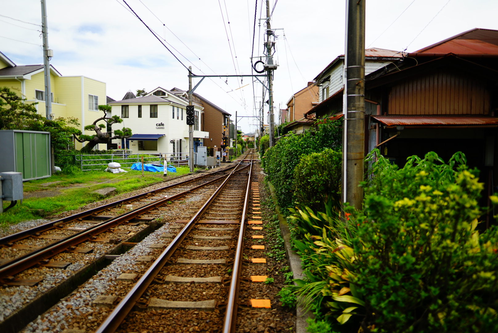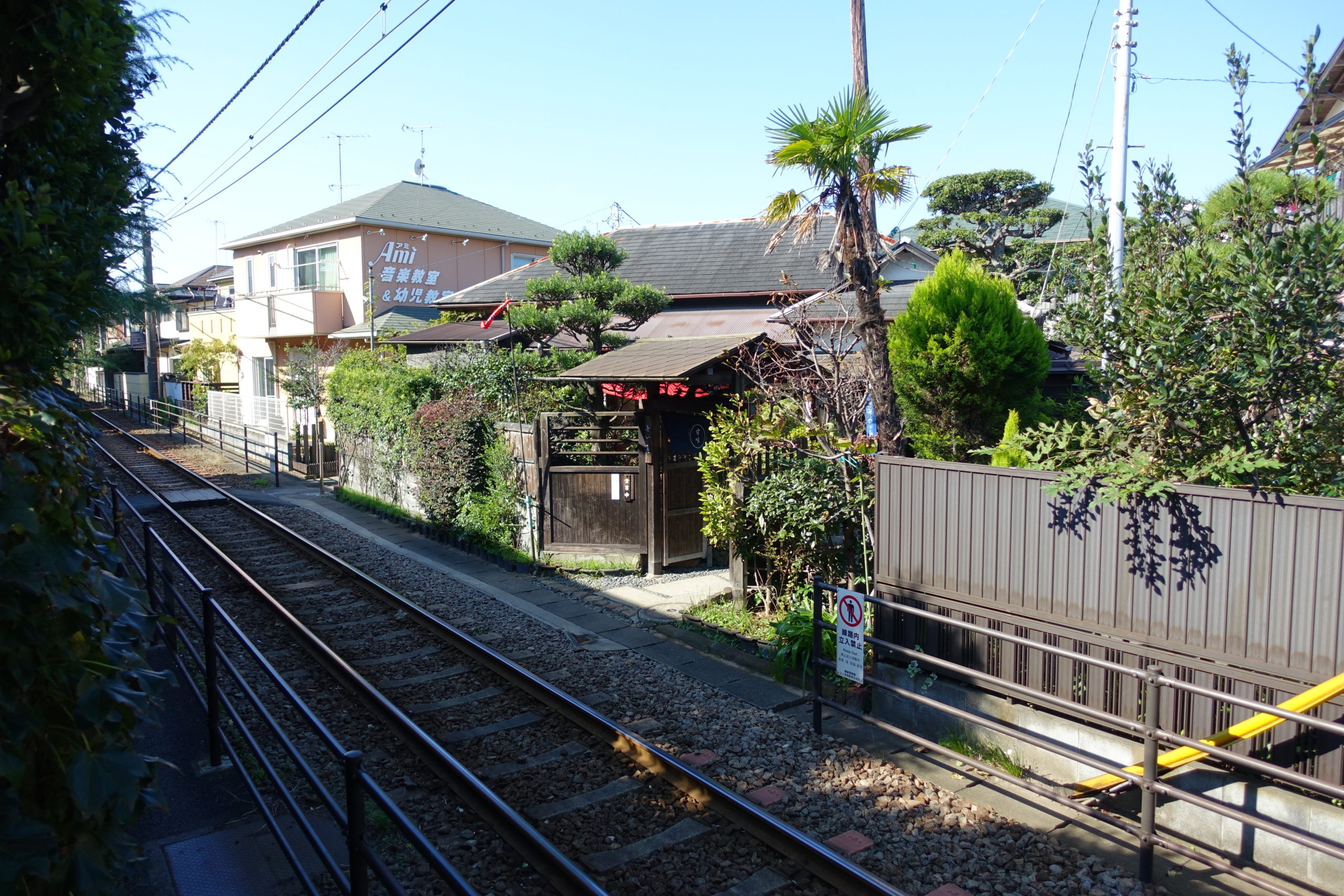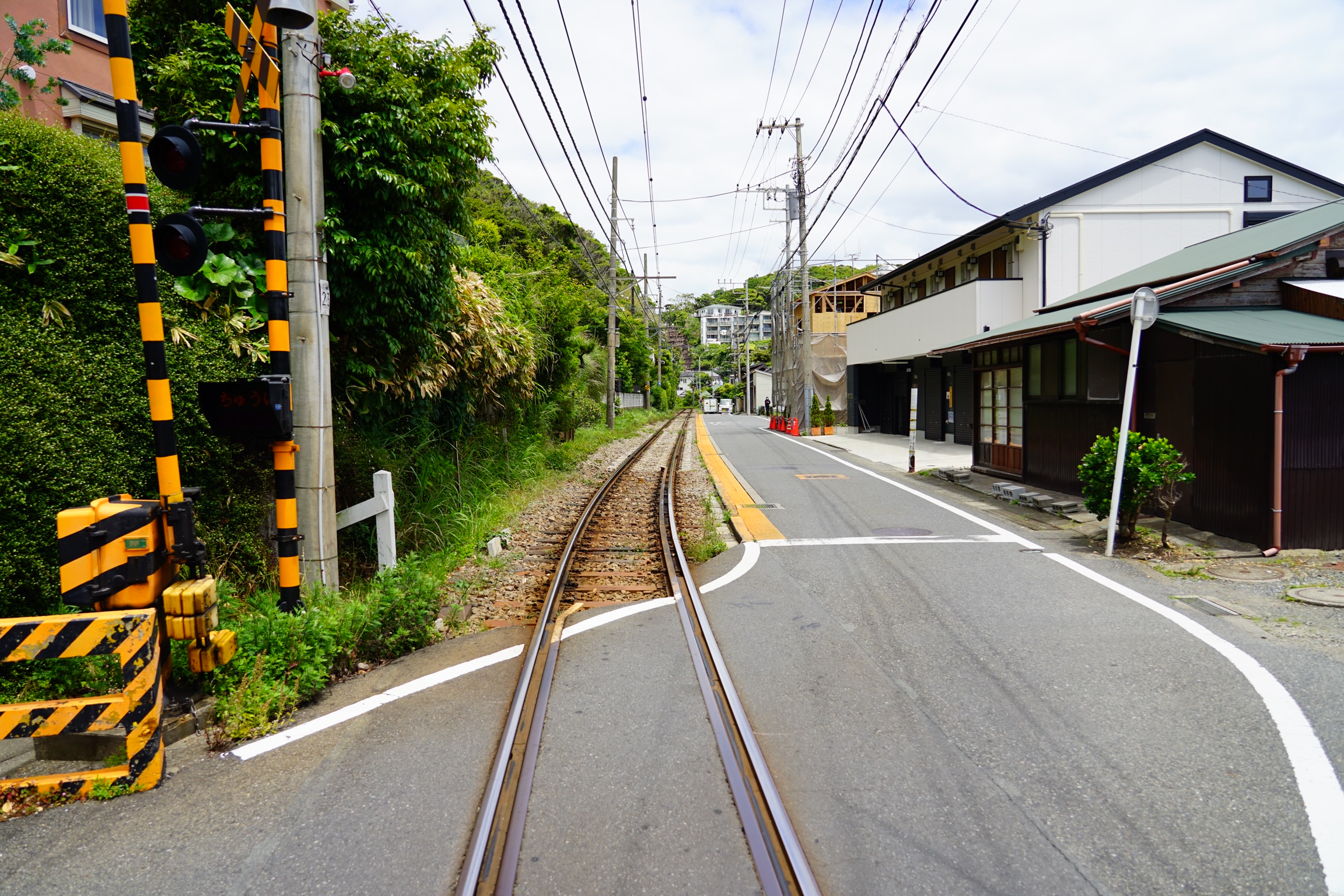路線のうち、鎌倉駅からしばらくは住宅地の隙間を縫うように宅地ぎりぎりのところを、家や垣根をかわしながら走るため敷地の入り口が線路に面している家もあります。電車が来ないのを見計らって近くの踏切から線路を歩いて家に入るようです。