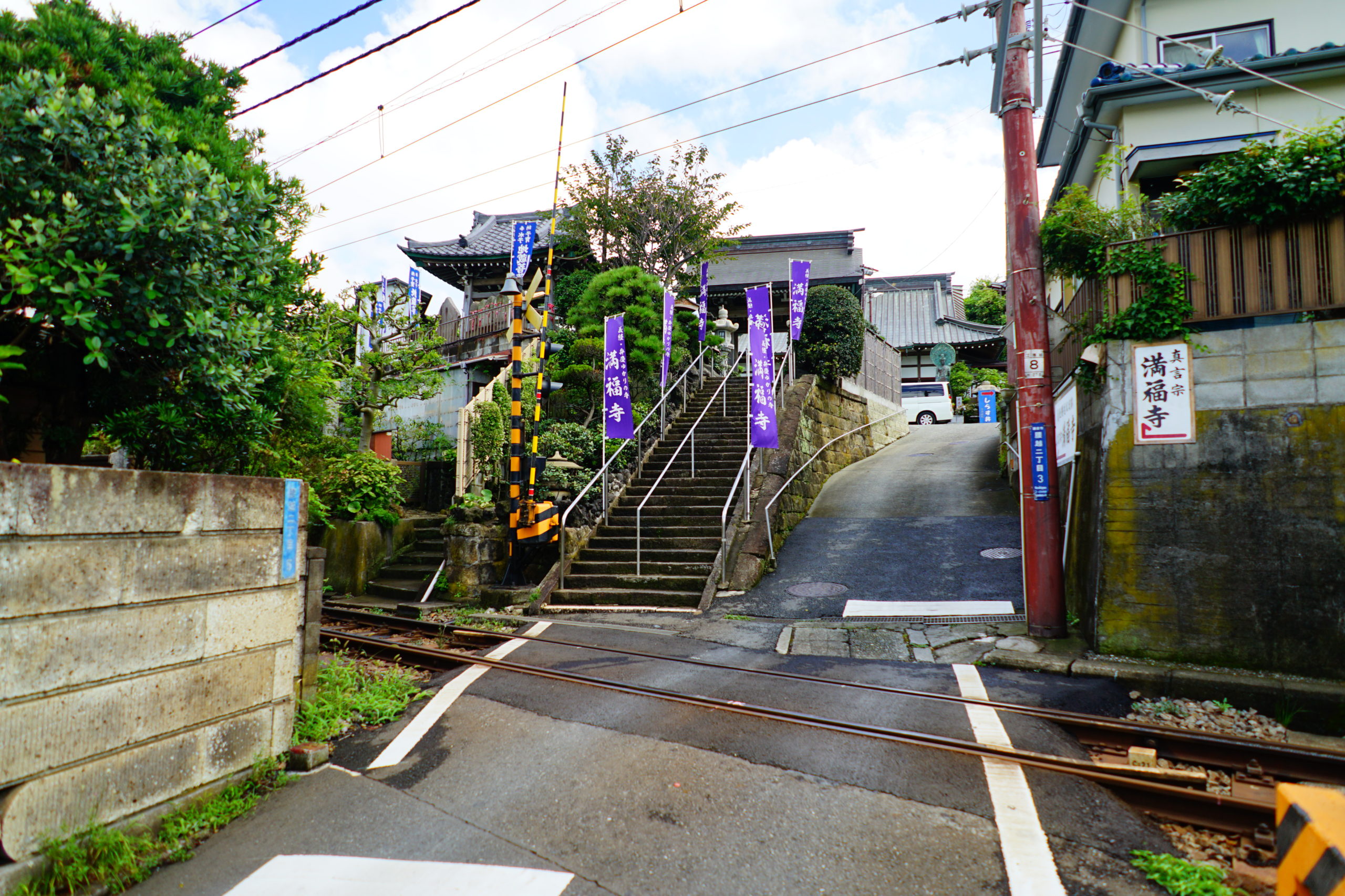 江ノ島駅までもうすぐです。この龍口寺前のS字カーブで江ノ電が来るのを待ち構えます。道路としては交差点にもなっているので車の侵入が重なった時は結構危険ポイントだと思います。