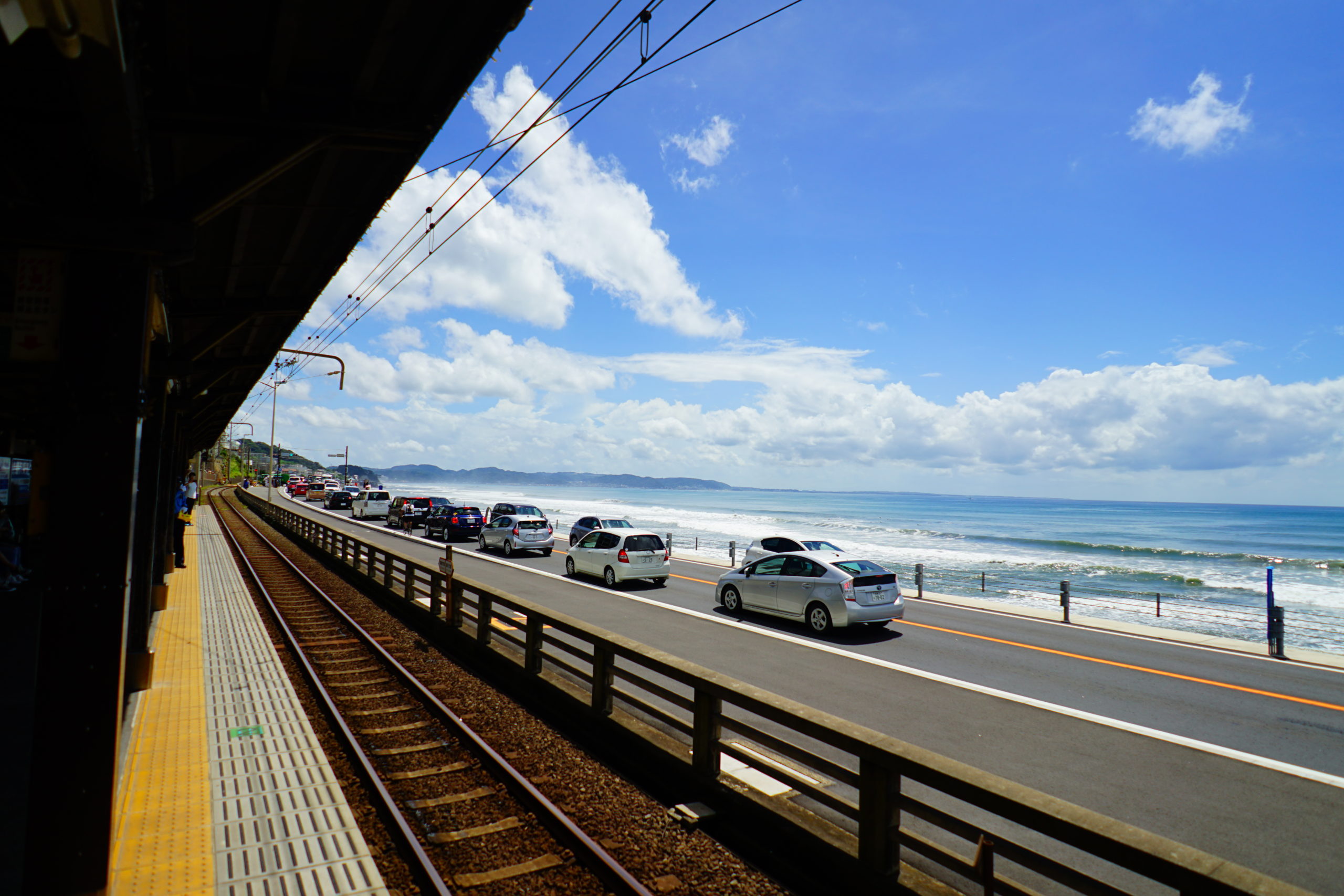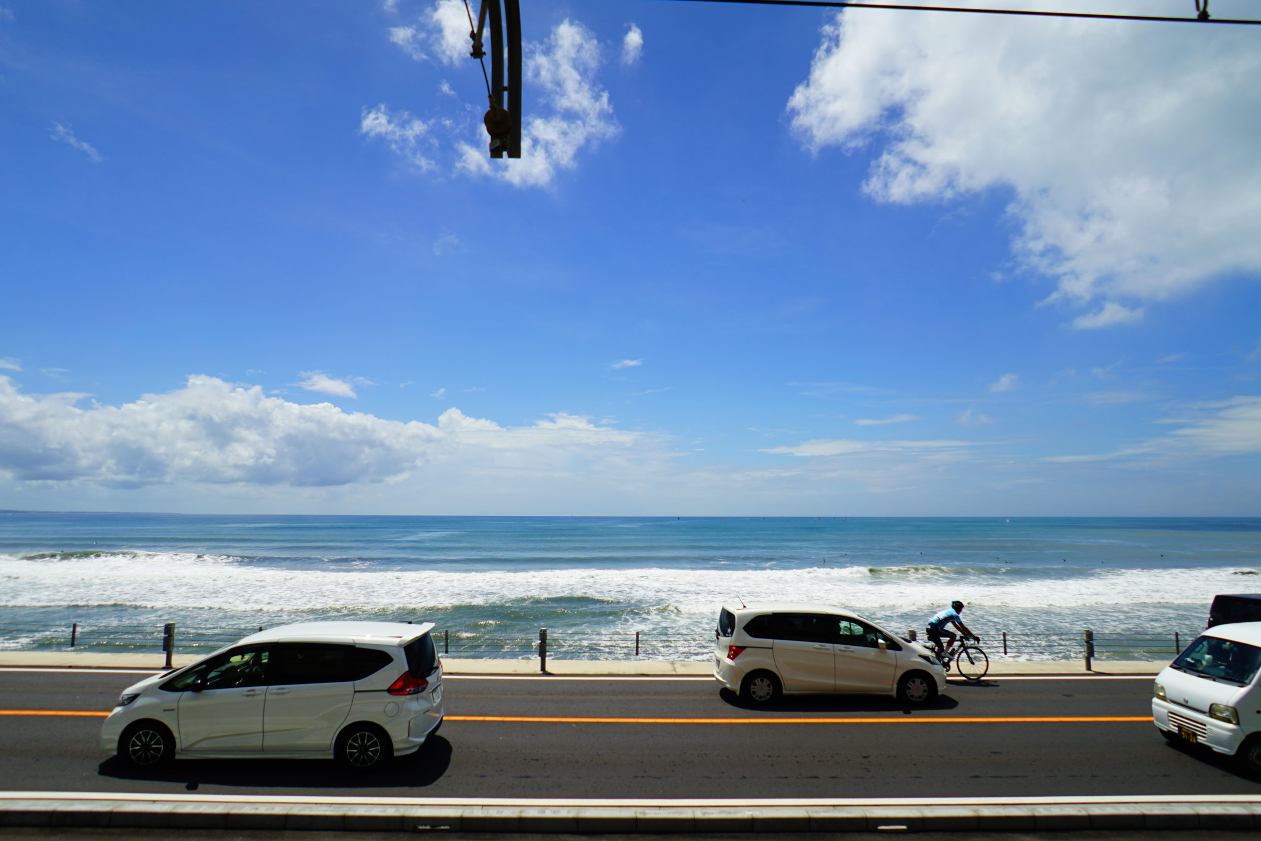 メディアへの露出が多くあちこちで見かける鎌倉高校前駅は、目の前が一面の海です。ちょっと視線を上げれば、水平線が横一直線に一点の歪みも無く空との境を描いています。