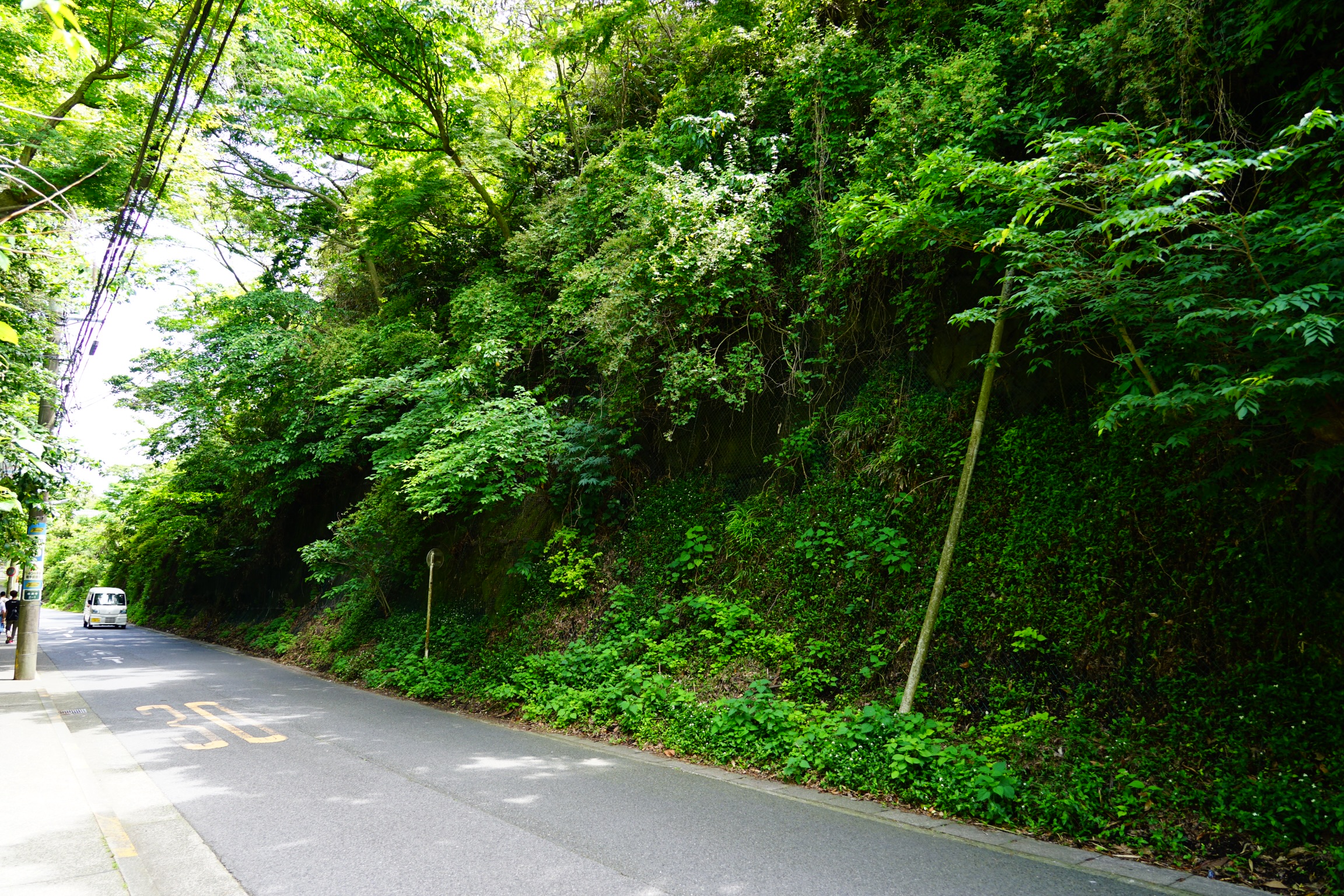 江ノ電でいうと鎌倉駅から極楽寺トンネルあたりまででしょうか。道でいうと7つの切り通しの内側ということになります。山に囲まれているため、市中に入るのに必要な要所を山を切り削って通路状にしたものを切通しといいますが、これが鎌倉には7箇所あります。鎌倉七口とも呼ばれています。細かく言うと、出入口ではない切通しがもう一箇所(釈迦堂切通し、現在通行止)あるので、切通しとしては8箇所あります。切通しを歩くと、岩盤を手掘りしたのかのような場所が残っていたり、敵の侵入を妨ぐためにあえて路面に大きな岩を残してあるなど、鎌倉時代の名残が多く見られます。
