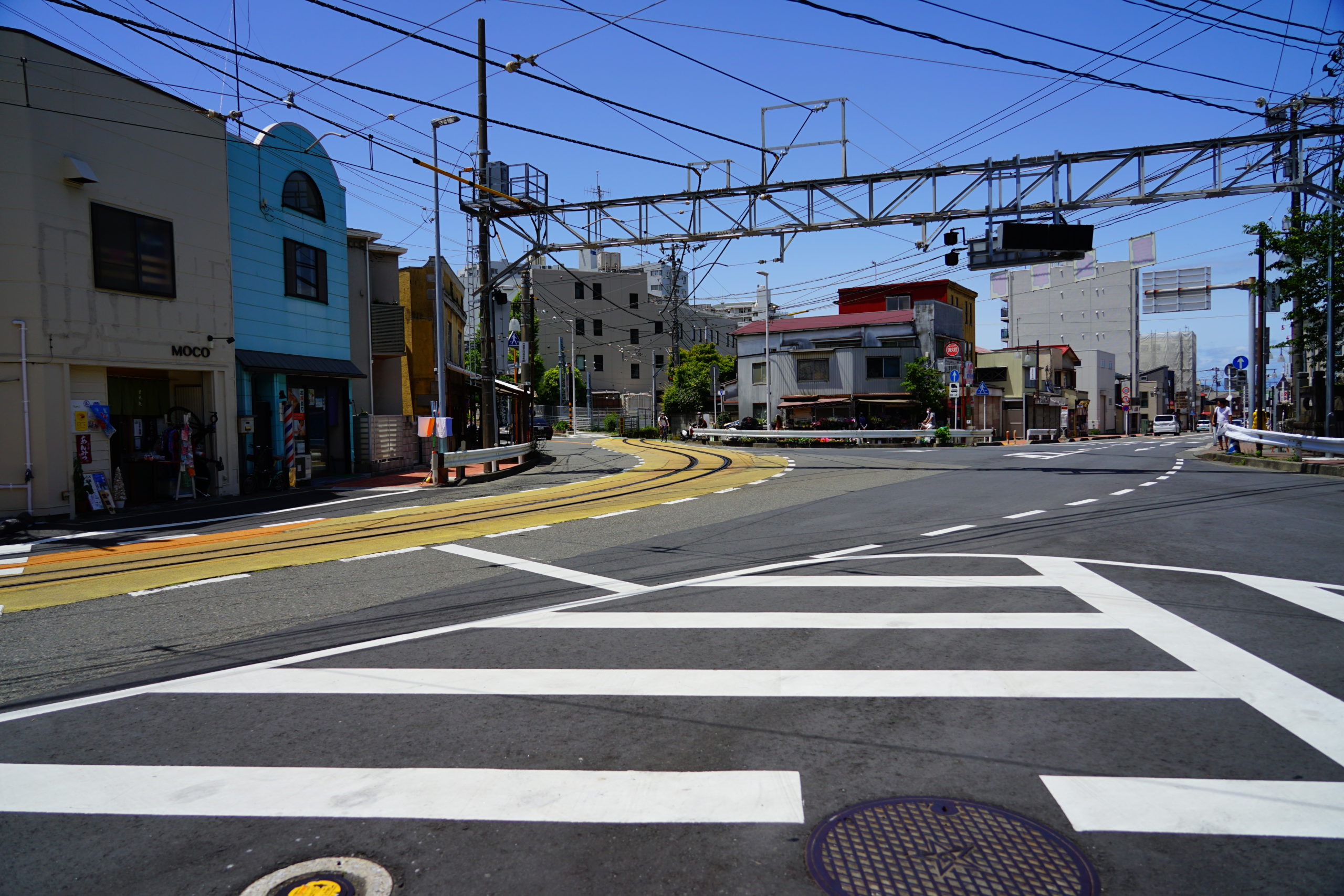 この区間は商店などもあるため路上駐車があったり、そこに電車が来たりとちょっと歩きづらいエリアです。