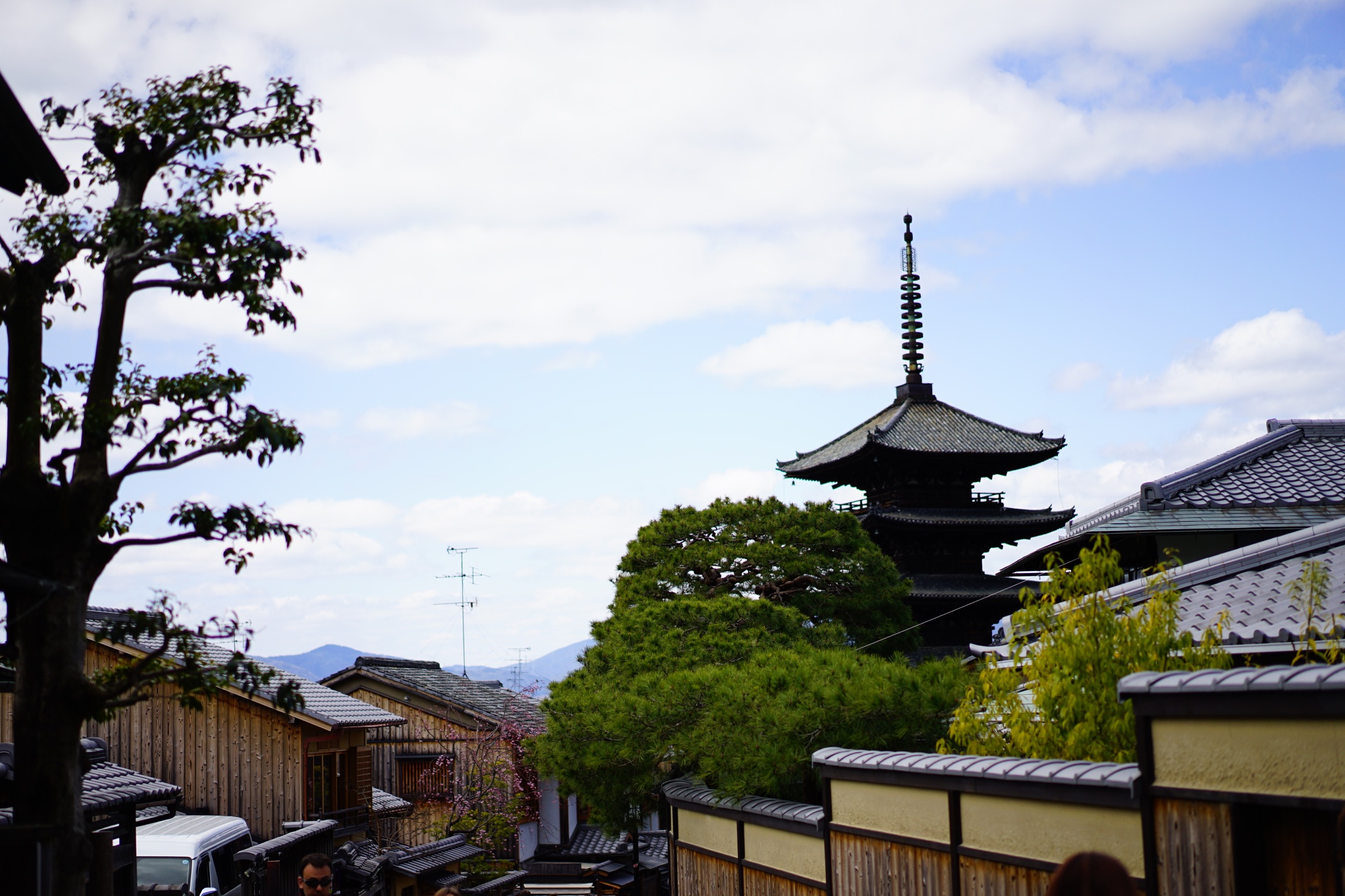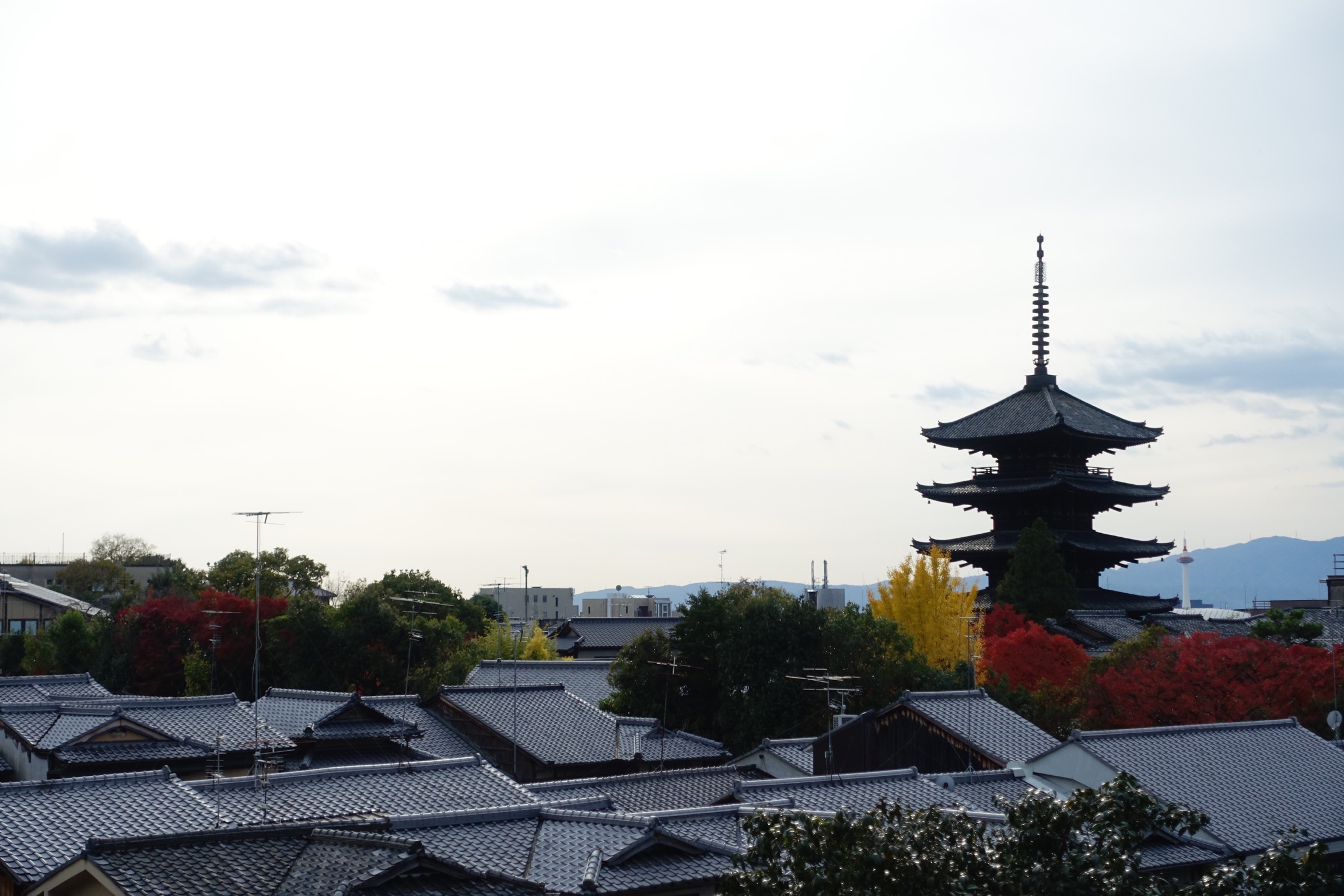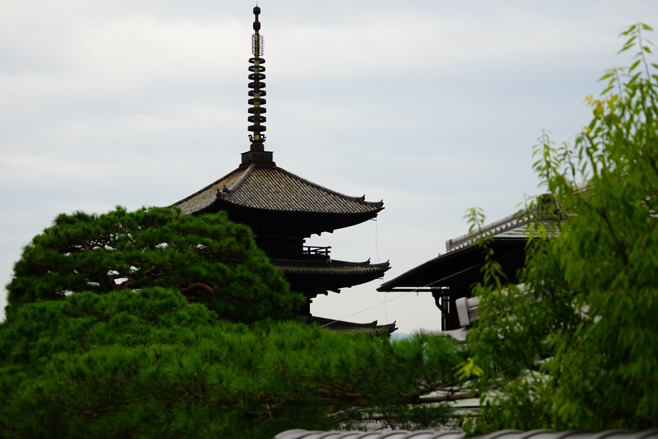 ここは京都 東山の産寧坂を降りてくると自然に目に飛び込んでくる景色です。産寧坂を下ってきて、この景色を見ずに二年坂に道を曲がってしまうともったいないです。二年坂へのわかれ道を曲がらずにそのまま真っすぐ行き、目の前の景色が広がった瞬間に五重の塔が見えます。仮に時代劇のセットだとしても、何一つ時代違いなものが無い景色です。ちょっとだけ、アンテナがあったりはしますが、、、。